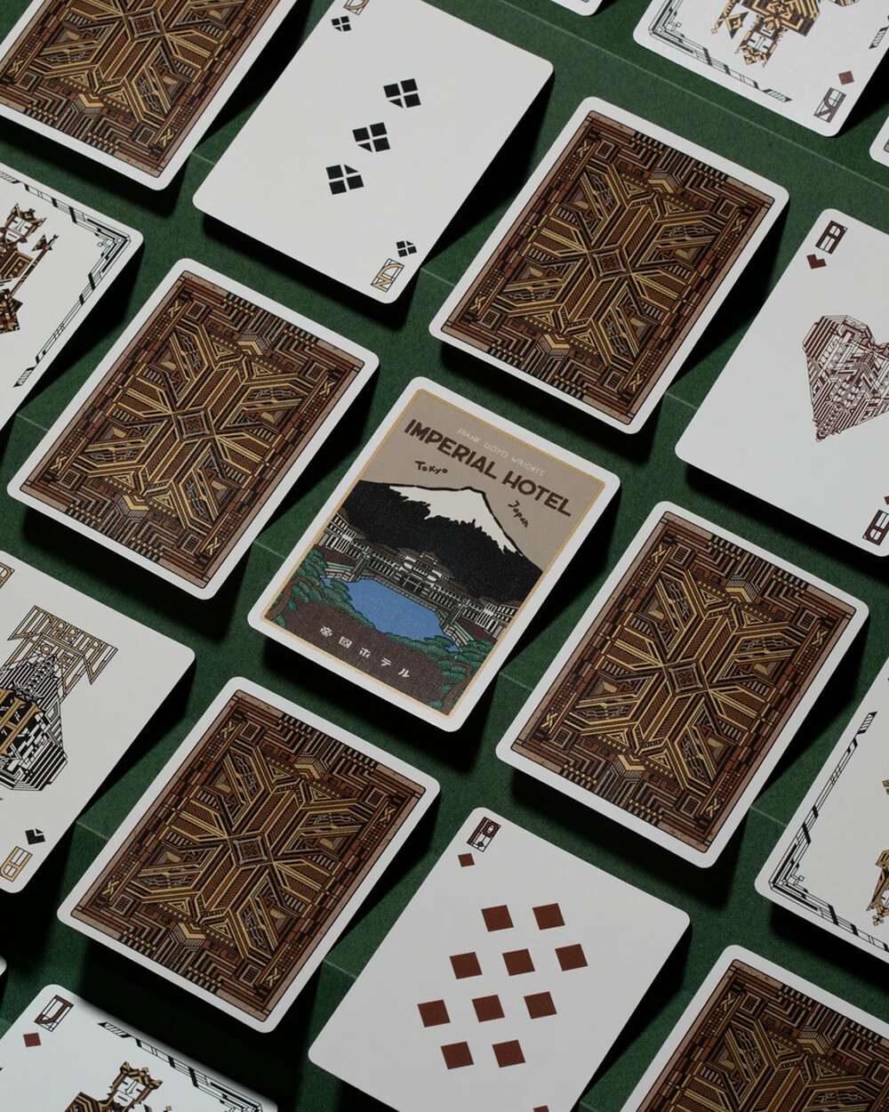 프랭크 로이드 라이트가 설계한 도쿄 임페리얼 호텔(1913–1922)의 100주년을 기념해, Frank Lloyd Wright Foundation × Art of Play가 라이트의 오리지널 도면을 바탕으로 제작한 기념 플레이잉 카드입니다. Ethan Kowaleski가 Brad Fulton, Dan & Dave Buck과 협업해 세부를 정교하게 일러스트레이션했으며, 호텔의 역사(본관·로비는 1968년 아이치현 메이지무라로 이전 복원)를 소개하는 스토리와 함께 컬렉터블로 완성도를 높였습니다.