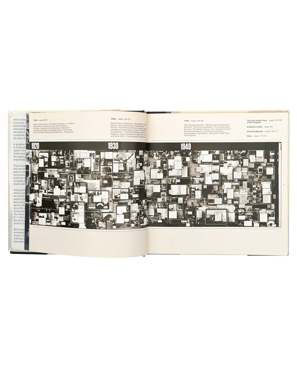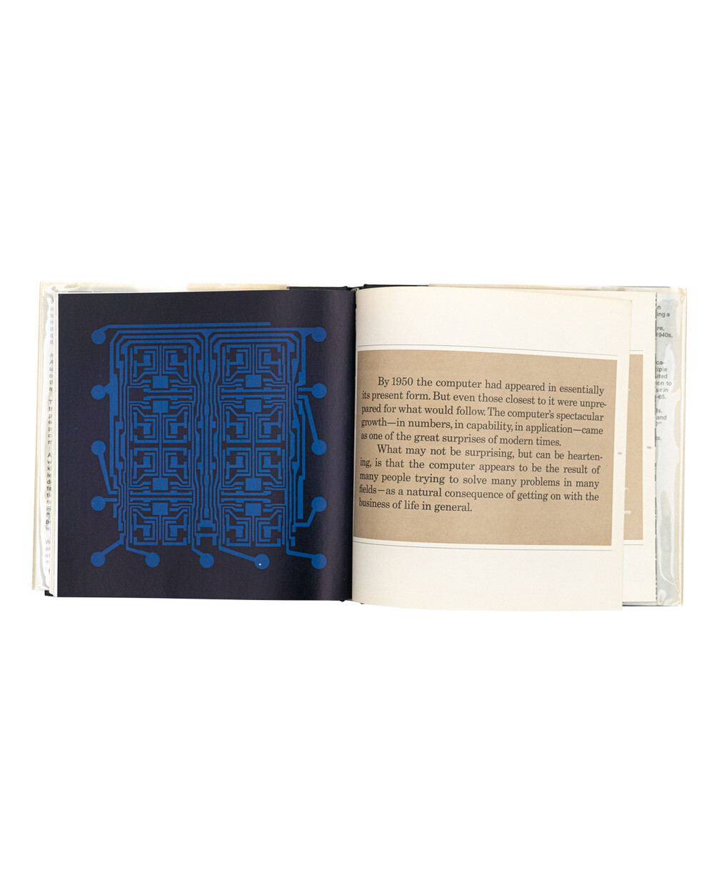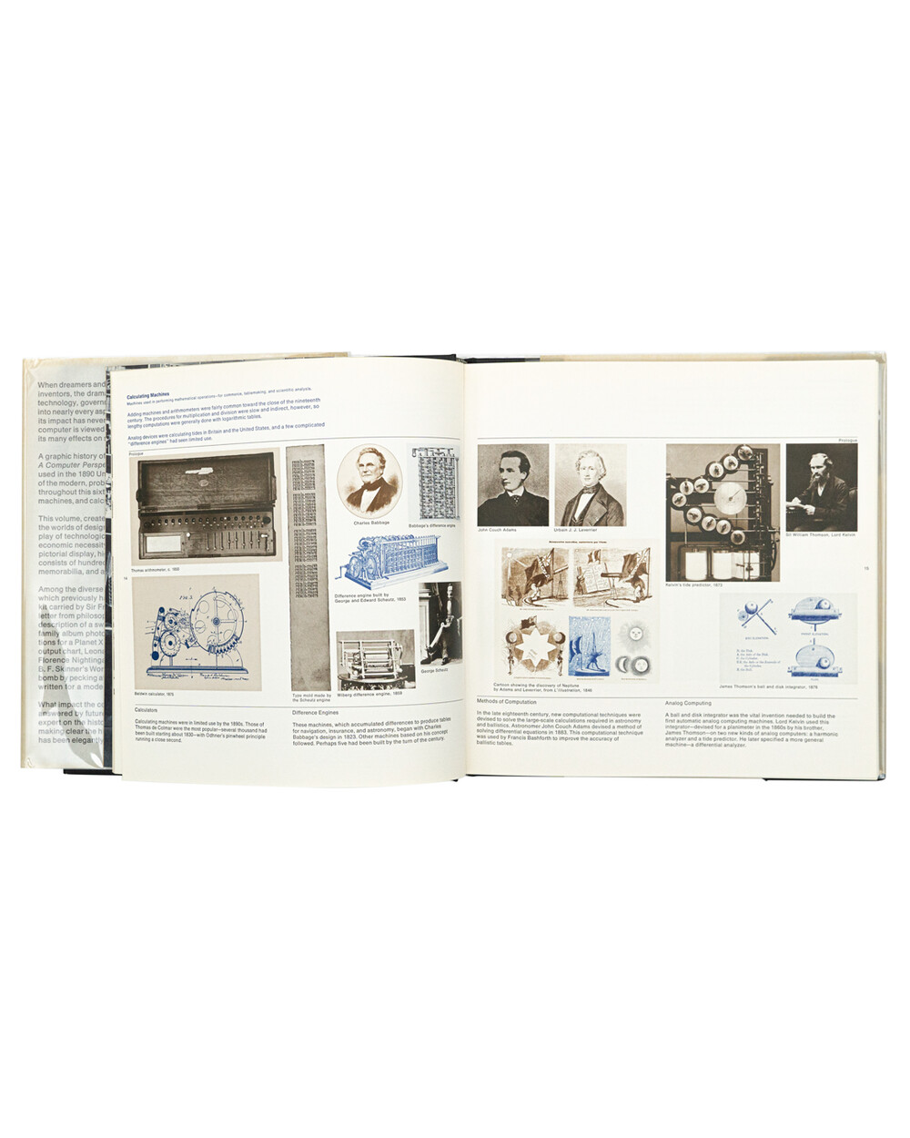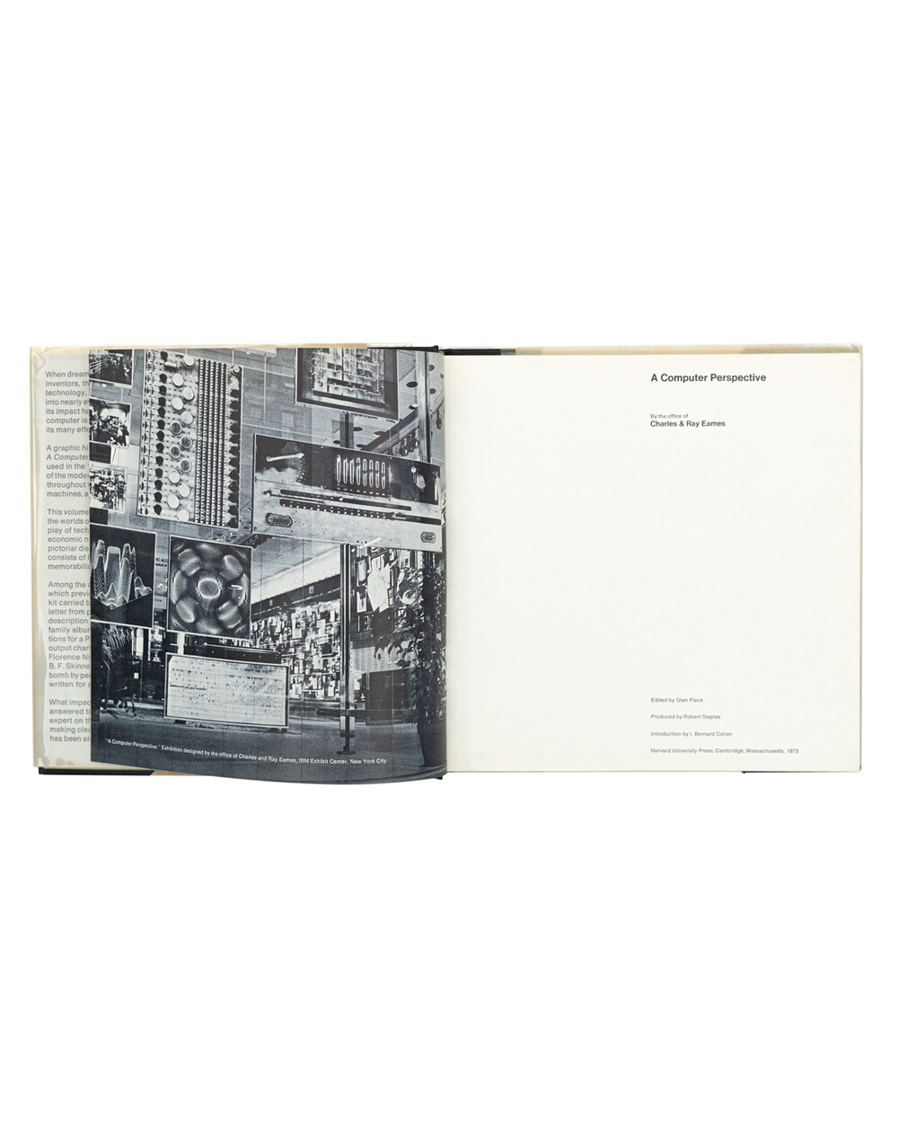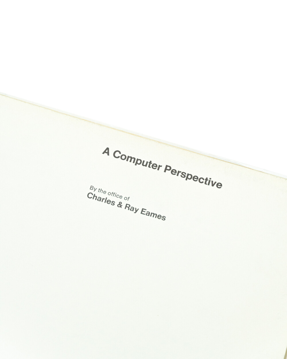 'A Computer Perspective' 은 1971년 IBM과 Eames Office가 공동 작업하여 만든 전시회로서 이 책은 전시 도록입니다. 전시회는 1890년부터 1940년까지의 빈티지하고 현대적인 기계, 컴퓨터 공예품, 텍스트, 사진 등 다양한 요소들을 콜라주하여 제작된 여섯 개의 역사 섹션, AV Rack이라고 불리는 다중 스크린 슬라이드 쇼, "Twenty Questions"라는 대화형 컴퓨터 게임 등 컴퓨터를 주제로 다양하고 매력적인 시대를 앞서간 전시 형태를 선보였습니다. IBM 기업 전시 센터에서 열린 이 전시는 매우 성공적이었고 1975년까지 4년여에 걸쳐 지속되었으며 책이 출판되기 이전에는 관련 영화 2편이 만들어졌습니다.