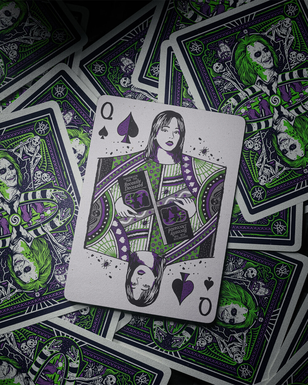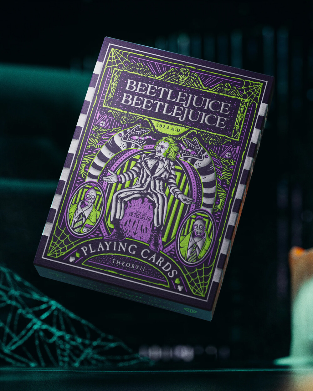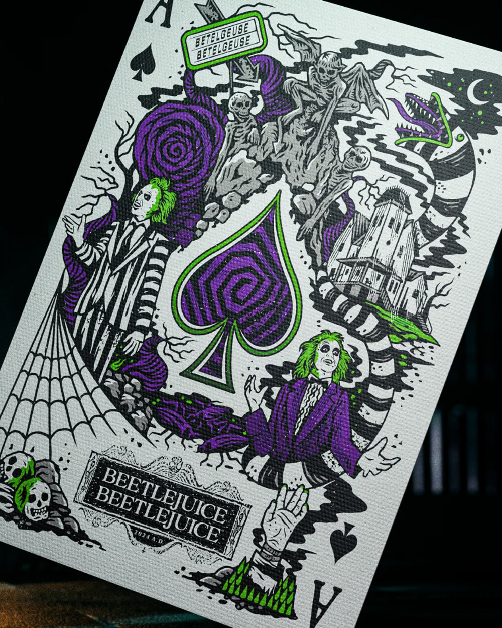 팀 버튼의 컬트 클래식 『비틀쥬스』와 36년 만에 돌아온 속편 세계관을 기반으로 한 공식 라이선스 프리미엄 플레잉 카드입니다. 슬라임 그린과 퍼플 포인트 컬러, 기묘하고 유쾌하게 기어 나오는 호러 코미디 무드 그대로. 비틀쥬스, 리디아, 델리아 등 주요 캐릭터가 다시 (또는 아직도) 살아 움직이듯 등장하며, 샌드웜 같은 상징적인 생물도 빠지지 않습니다. 팬이라면 테이블에 앉는 순간 “It’s Showtime!”을 외치게 되는 구성이에요.