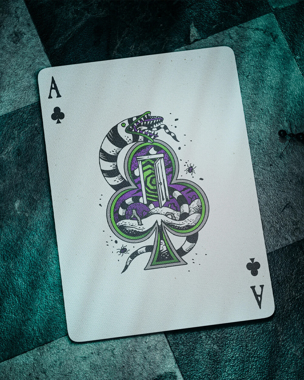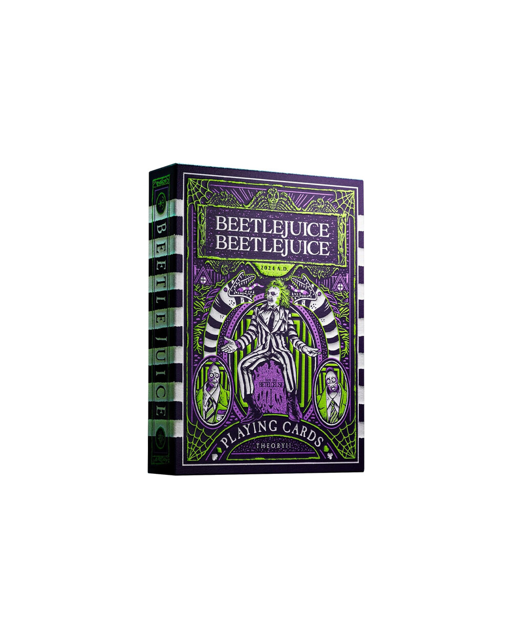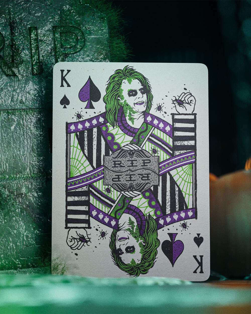 팀 버튼의 컬트 클래식 『비틀쥬스』와 36년 만에 돌아온 속편 세계관을 기반으로 한 공식 라이선스 프리미엄 플레잉 카드입니다. 슬라임 그린과 퍼플 포인트 컬러, 기묘하고 유쾌하게 기어 나오는 호러 코미디 무드 그대로. 비틀쥬스, 리디아, 델리아 등 주요 캐릭터가 다시 (또는 아직도) 살아 움직이듯 등장하며, 샌드웜 같은 상징적인 생물도 빠지지 않습니다. 팬이라면 테이블에 앉는 순간 “It’s Showtime!”을 외치게 되는 구성이에요.