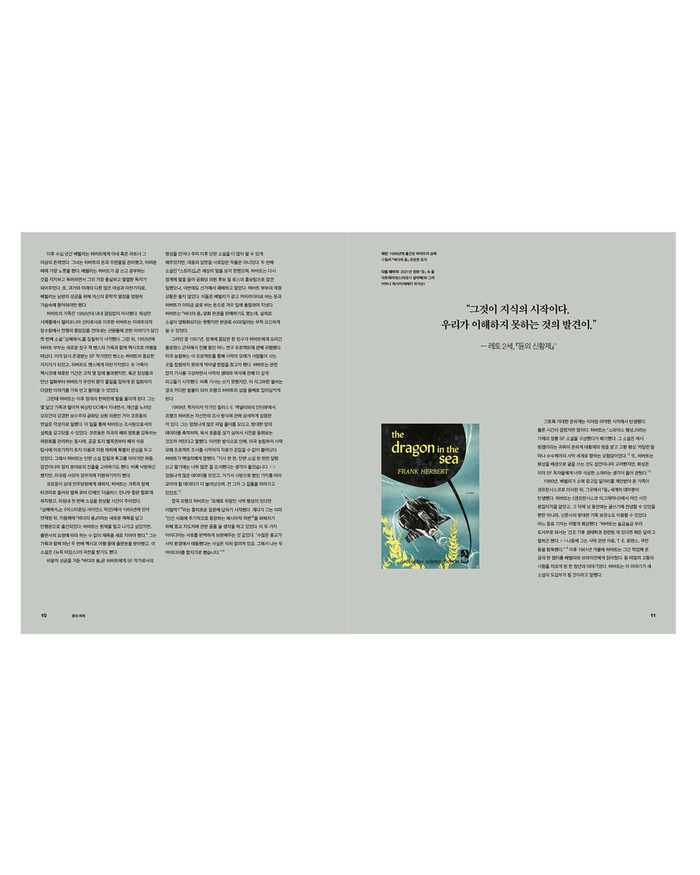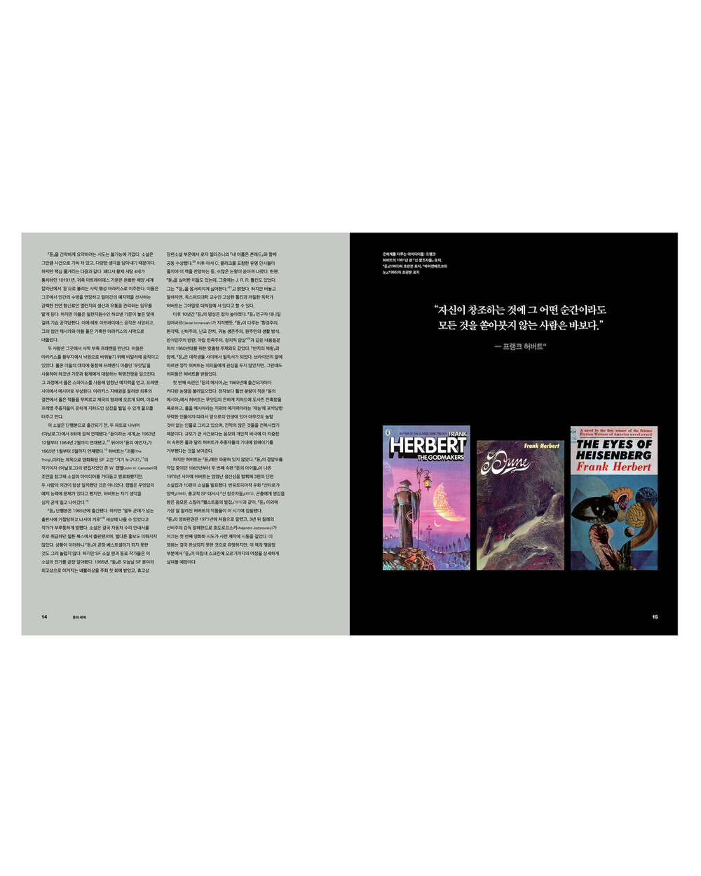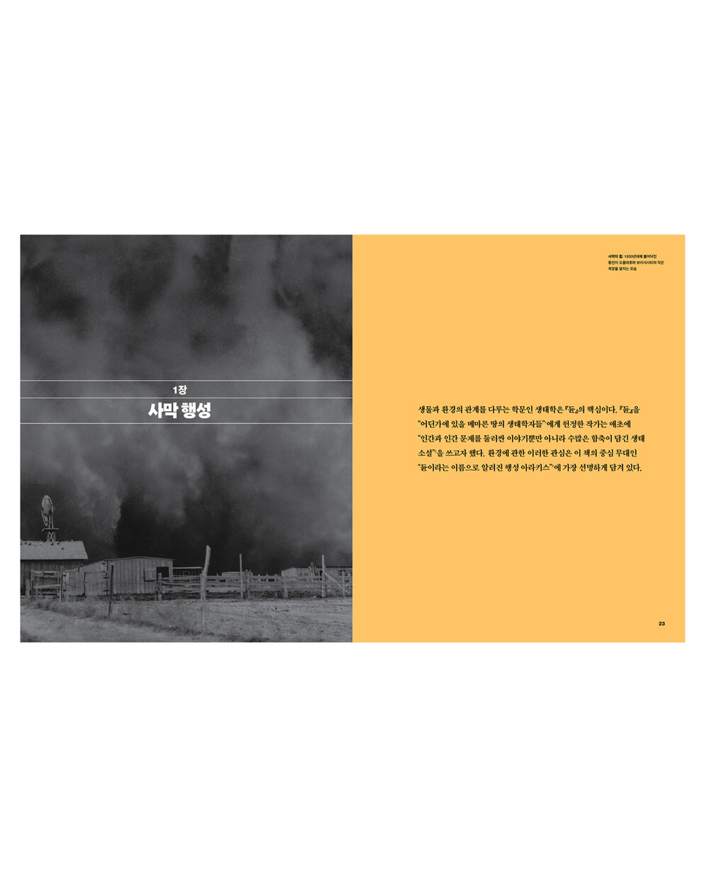 독자들은 이 책에서 『반지의 제왕』의 저자 J.R.R. 톨킨, 『파운데이션』의 저자 아이작 아시모프, 『죽어가는 지구』의 잭 밴스 등 동시대 유명 작가들과 관련된 일화는 물론이고, 고대부터 근현대사까지 OPEC, 이슬람 저항, 환경운동, 초심리학, 트로이 전쟁, 아라비아의 로렌스, 우생학, 칼리굴라, 새뮤얼 버틀러, 사담 후세인, 프리메이슨리 등 『듄』의 완성에 영향을 준 수많은 사상과 사건, 인물을 두루 살피며 방대한 『듄』의 세계관을 손 쉽게 이해하는 길을 안내받는다.