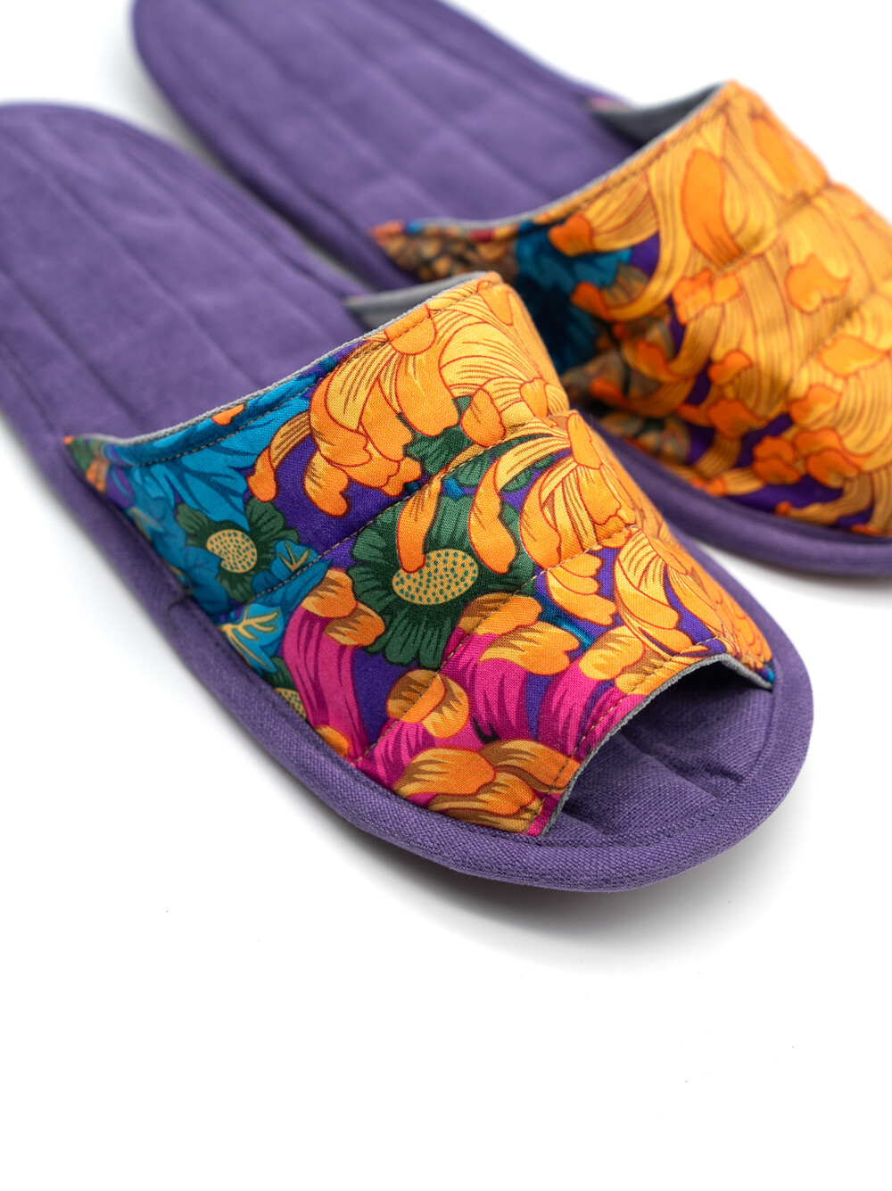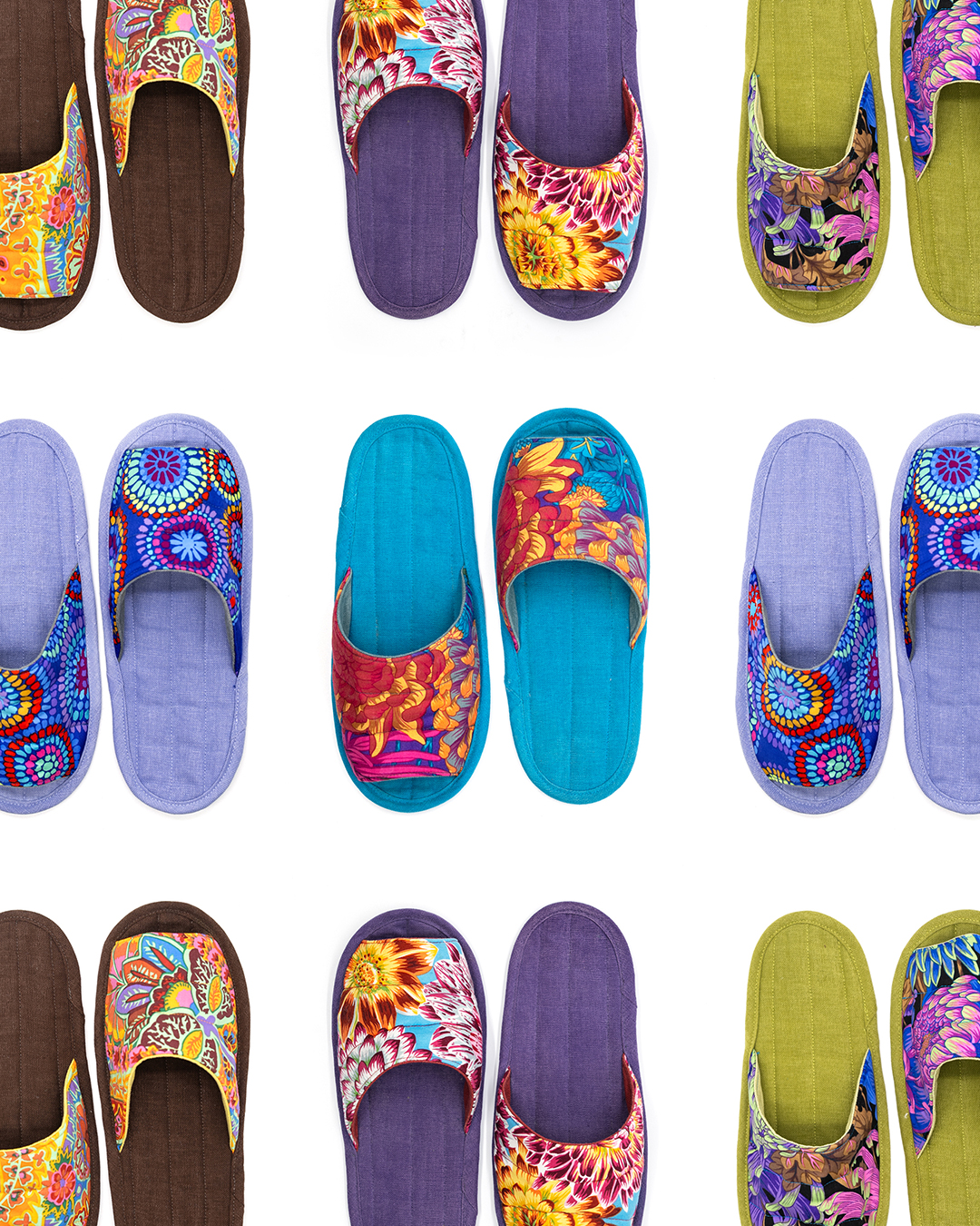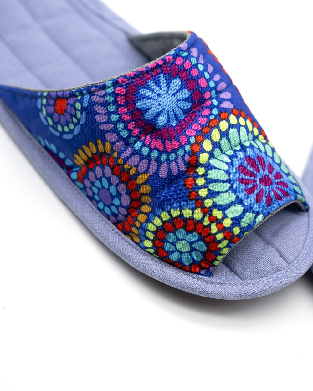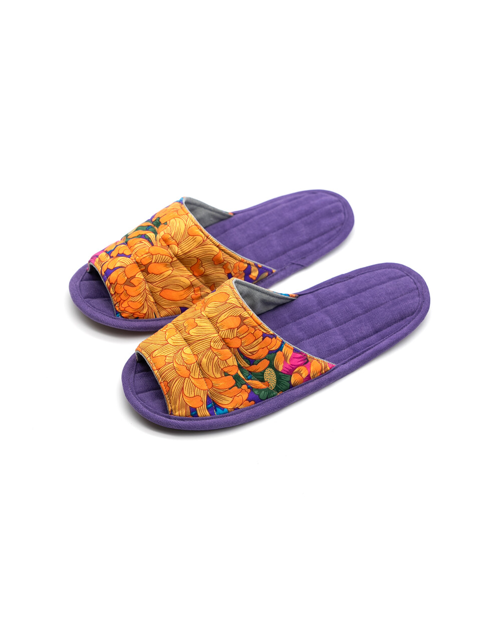 한국 섬유 산업의 호황기를 상징하는 과감한 텍스타일이 인상적인 누비 슬리퍼입니다. 재래시장 한켠에서 혹은 어르신들이 온돌방에 앉아 TV를 보며 신고 있을 법한, 익숙하면서도 정겨운 풍경이 자연스럽게 그려집니다. 이불이나 방석에서 비롯한 패턴들은 주로 꽃을 중심으로 한 문양과 화려한 배색으로 변주되었습니다. 좌식 및 온돌에 최적화된 두께 및 소재와 포근한 착화감으로 온가족이 사용하실 수 있습니다.