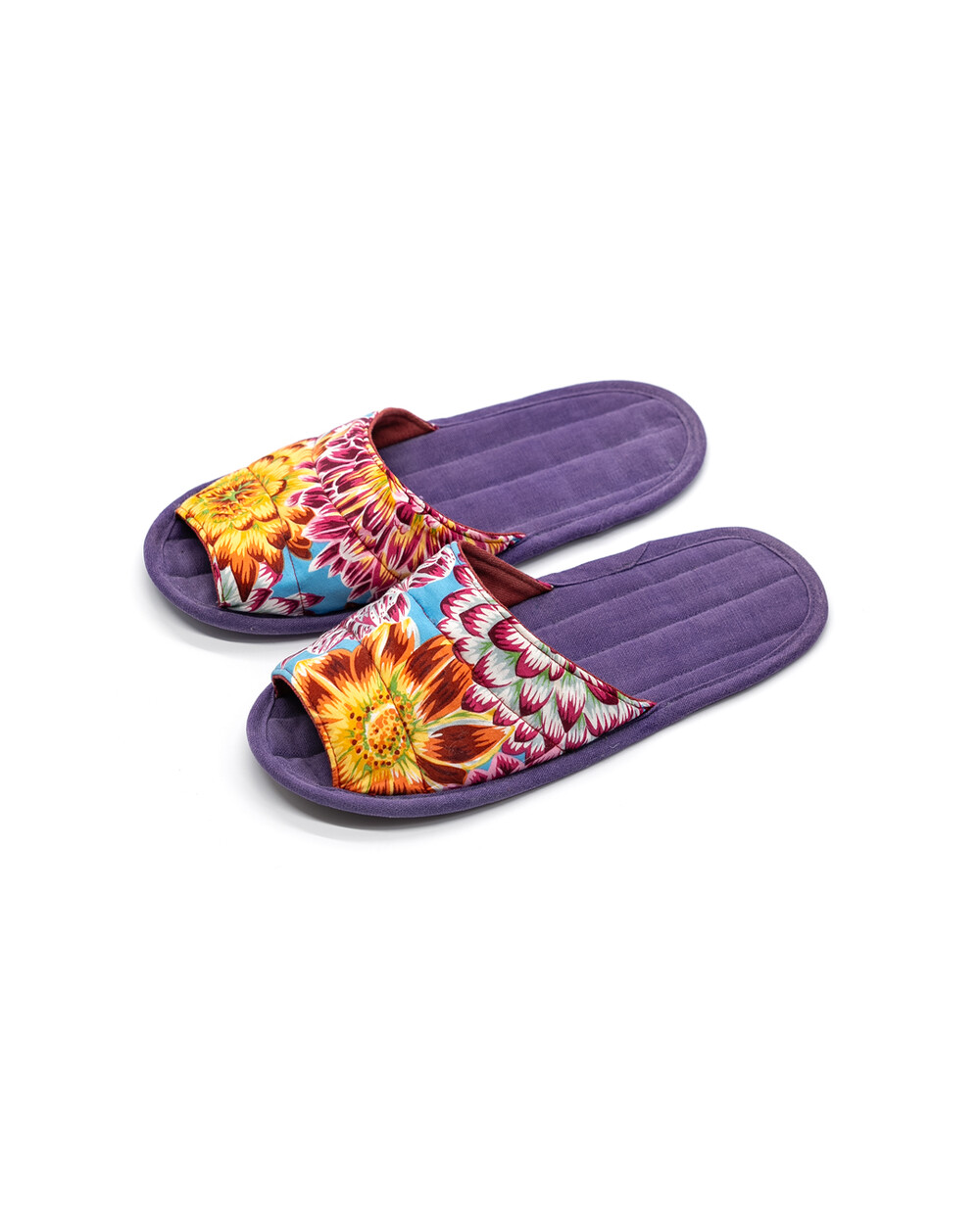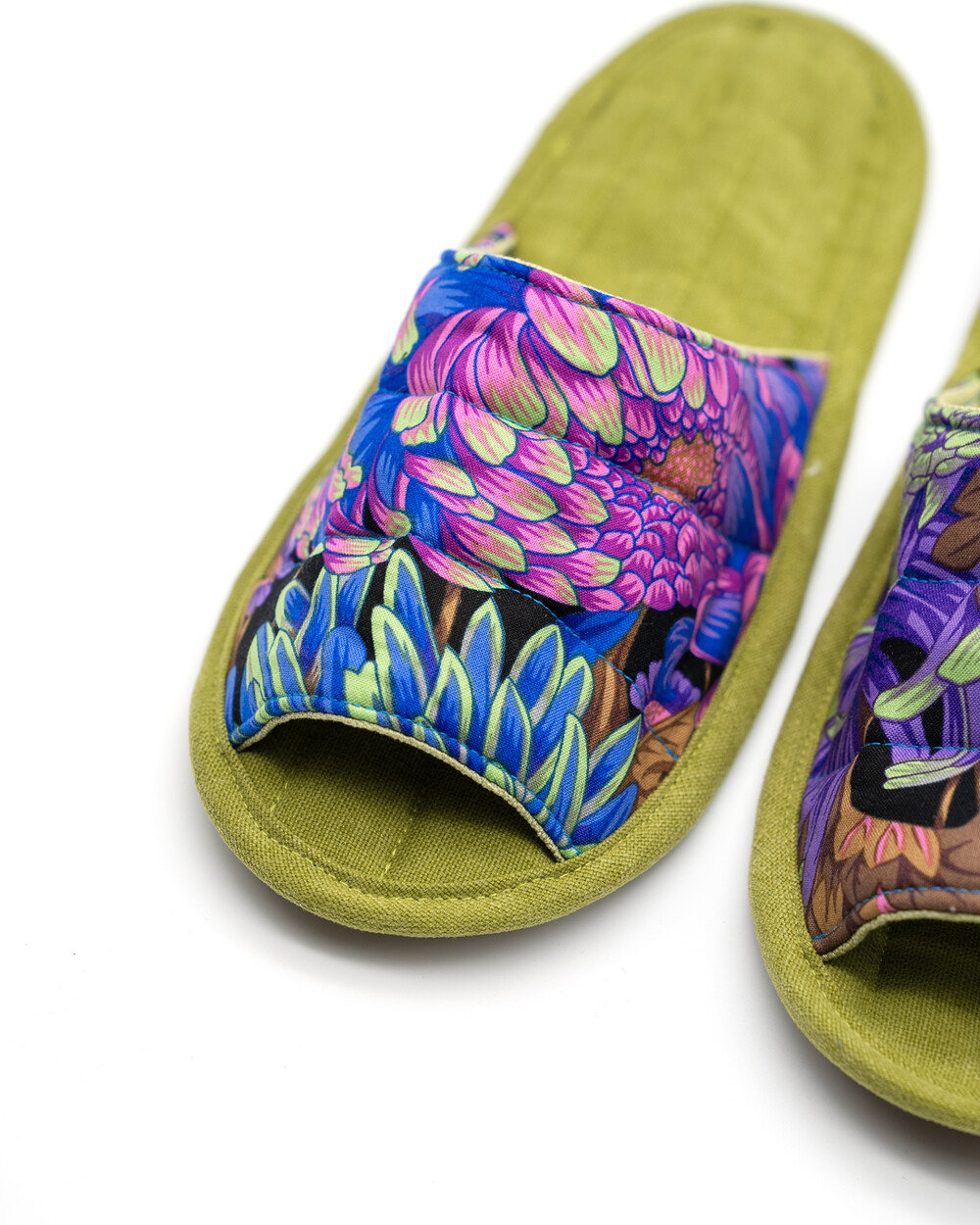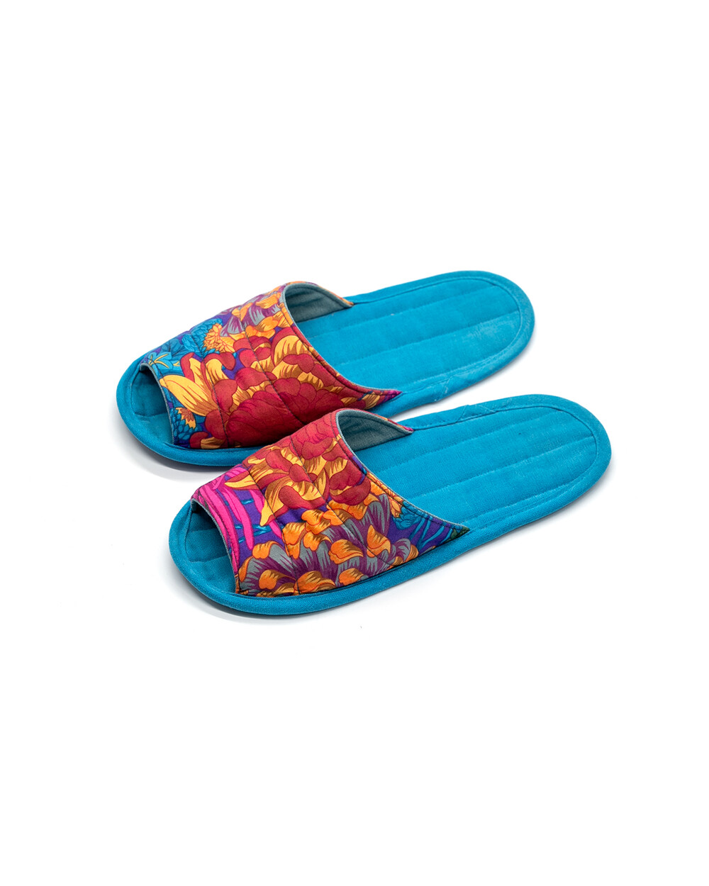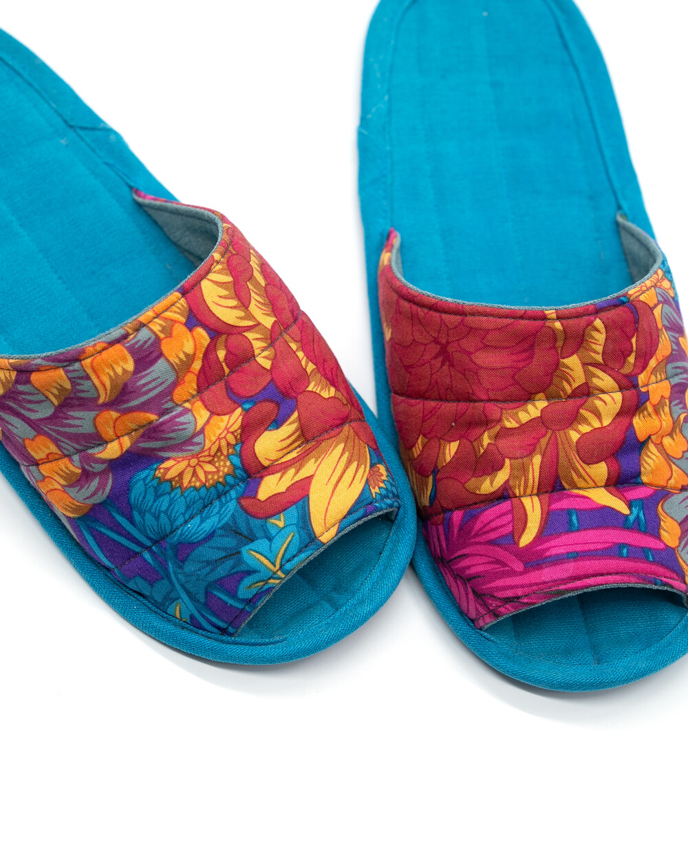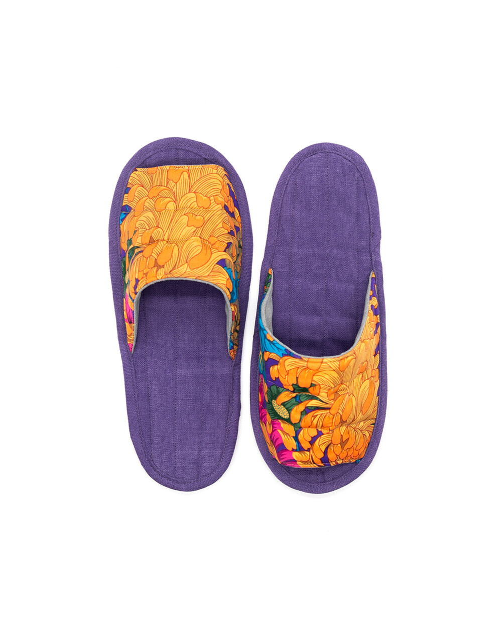한국 섬유 산업의 호황기를 상징하는 과감한 텍스타일이 인상적인 누비 슬리퍼입니다. 재래시장 한켠에서 혹은 어르신들이 온돌방에 앉아 TV를 보며 신고 있을 법한, 익숙하면서도 정겨운 풍경이 자연스럽게 그려집니다. 이불이나 방석에서 비롯한 패턴들은 주로 꽃을 중심으로 한 문양과 화려한 배색으로 변주되었습니다. 좌식 및 온돌에 최적화된 두께 및 소재와 포근한 착화감으로 온가족이 사용하실 수 있습니다.