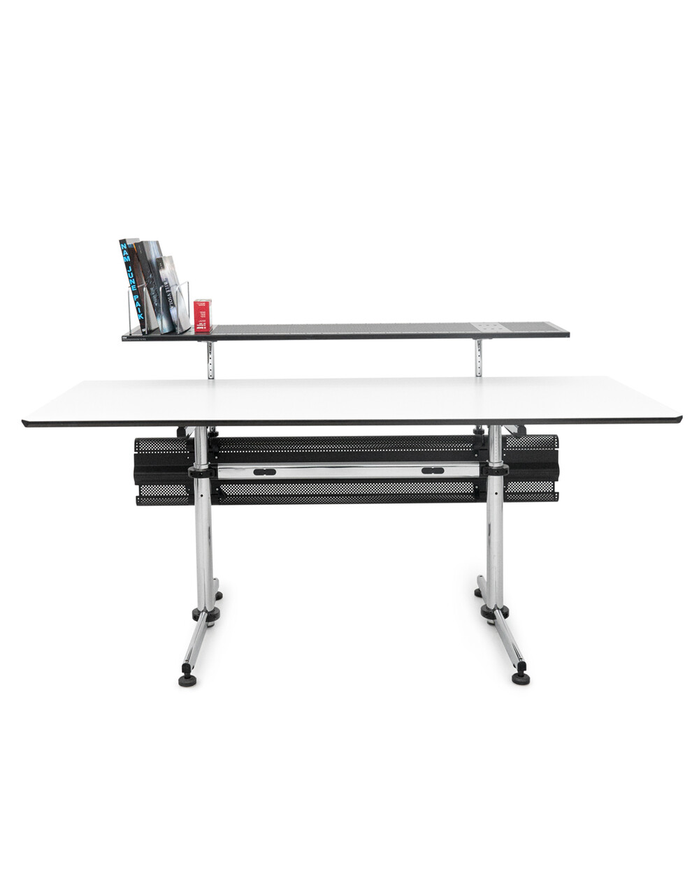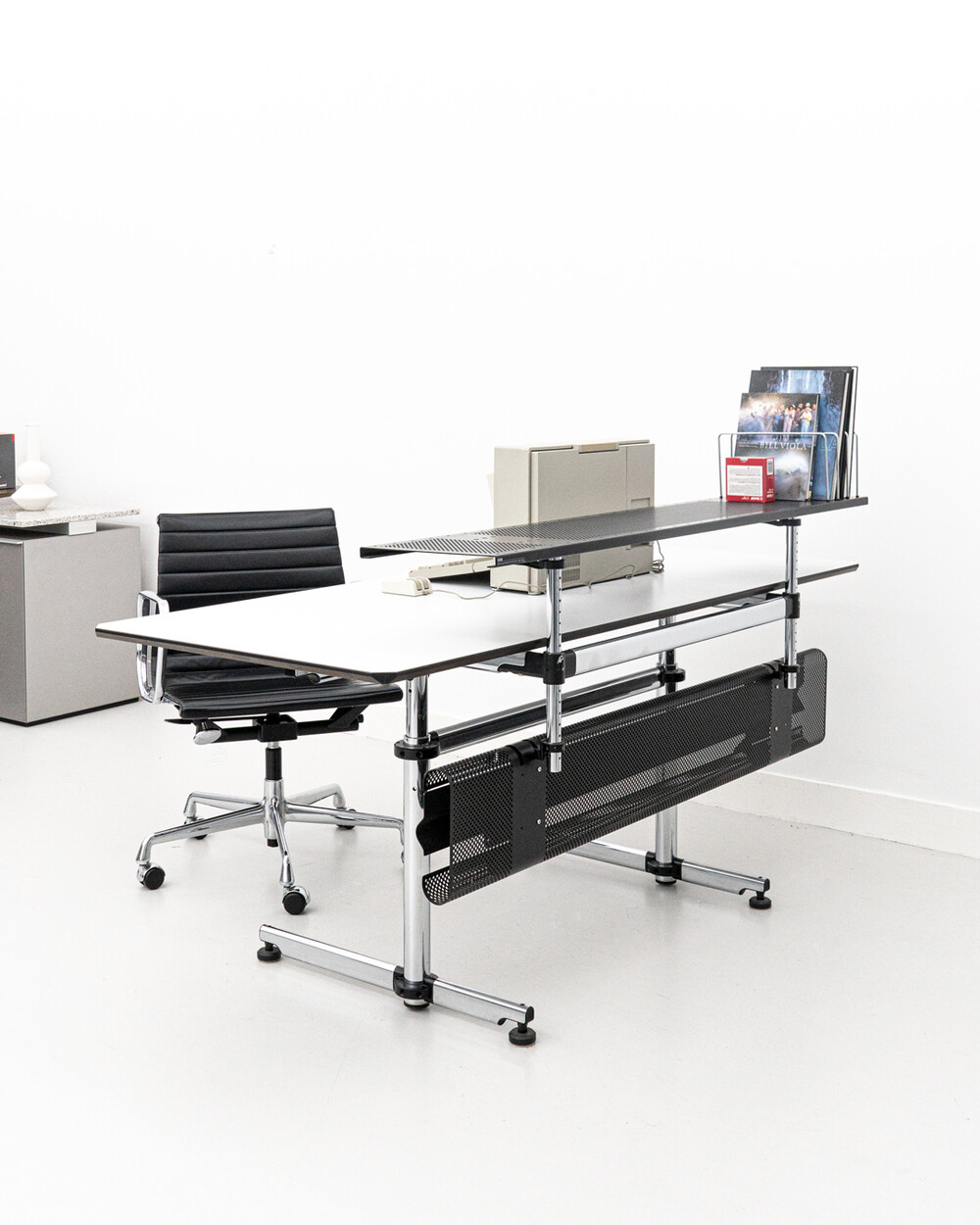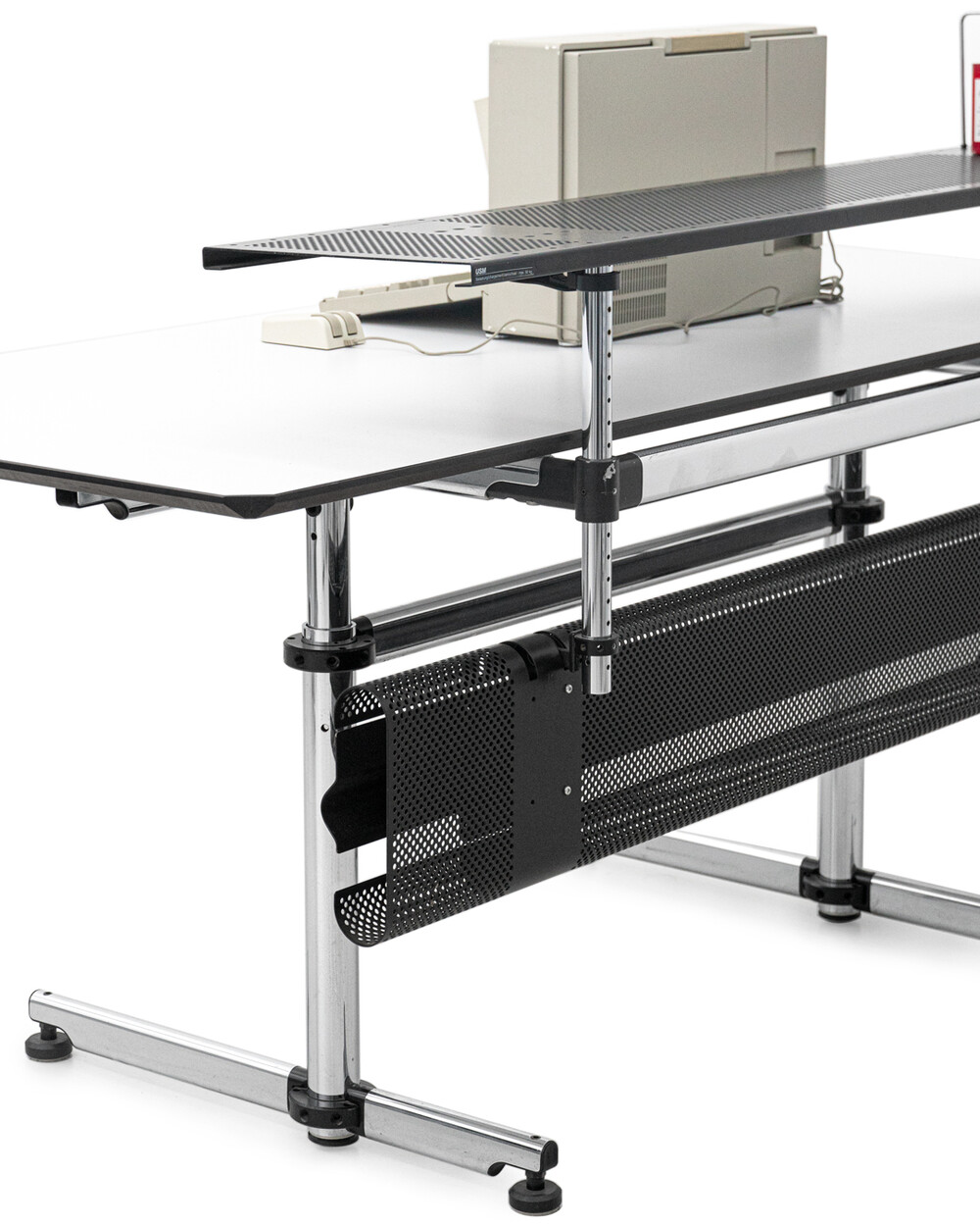 USM Kitos는 다양한 장점을 가지고 있는 테이블로서 USM Haller 가구와 완벽하게 어울립니다. 테이블은 수동으로 높이를 조정할 수 있으며 접이식 케이블 덕트를 이용해 케이블을 보기 좋게 정리할 수 있습니다. 또한 높이 조절이 가능한 추가 선반은 모니터를 올려놓거나 기타 사무 용품을 정리할 수 있습니다. USM Kitos Table + Additional Shelf은 홈 오피스 또는 개방형 사무실에 이상적입니다.