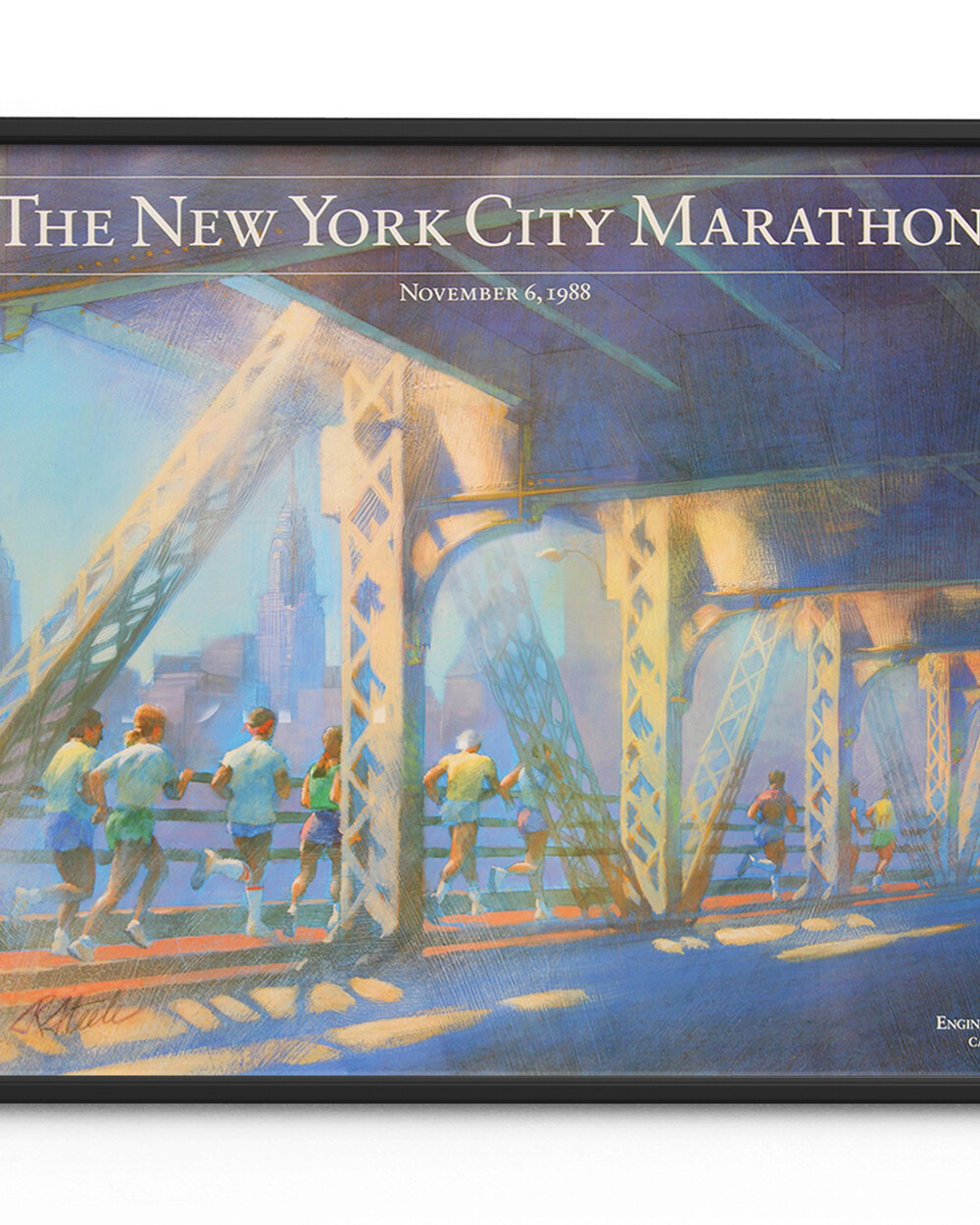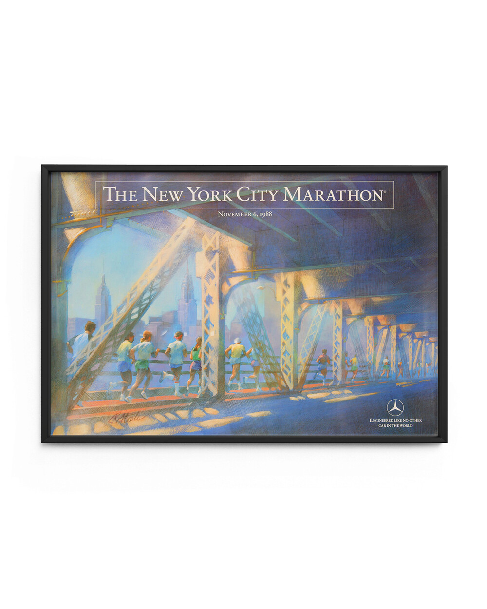 1988년 11월 6일, 19회 뉴욕 시티 마라톤은 스태튼아일랜드에서 출발, 총 22,405명(여성 3,974명)이 결승선을 통과해 대회 규모가 폭발적으로 성장하던 시기의 결정판이 되었습니다. 웨일스의 스티브 존스가 2:08:20으로 남자부 우승, 그레테 바이츠가 여성부 통산 9번째 우승을 거둬 ‘마라톤의 여왕’ 타이틀을 굳힌 해이기도 합니다. R. Steele의 따뜻한 브러시워크가 인상적인 이 포스터는 쏟아지는 가을 햇살과 함께 강철 트러스가 교차하는 다리 위 러너들의 ‘황금 순간’을 담았습니다. 다리 너머로 언뜻 보이는 엠파이어 스테이트 빌딩과 블루–오커 팔레트가 80년대 후반 뉴욕 특유의 낭만을 불러일으킵니다.