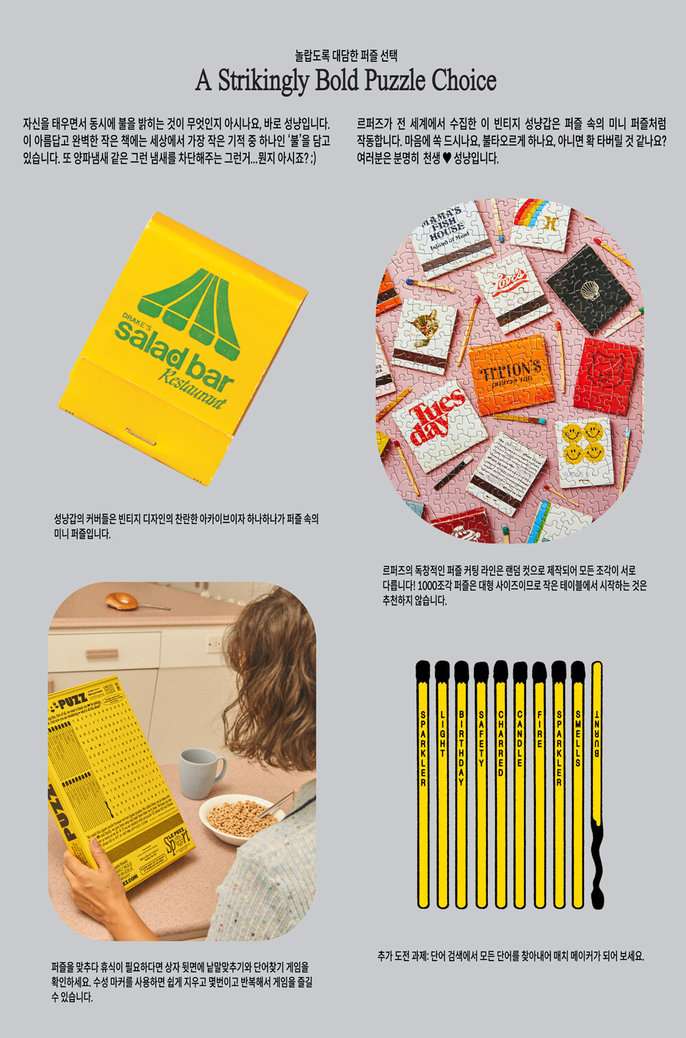 Match Made in Heaven은 방대한 빈티지 성냥갑 컬렉션을 정리한 퍼즐입니다. 르퍼즈는 빈티지 성냥갑들의 다채로운 컬러와 다양한 그래픽 디자인에 푹 빠졌습니다. 여러분도 마음에 드시길 바랍니다!