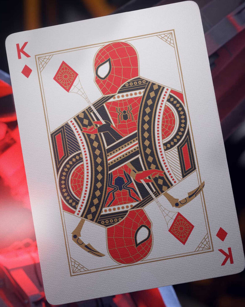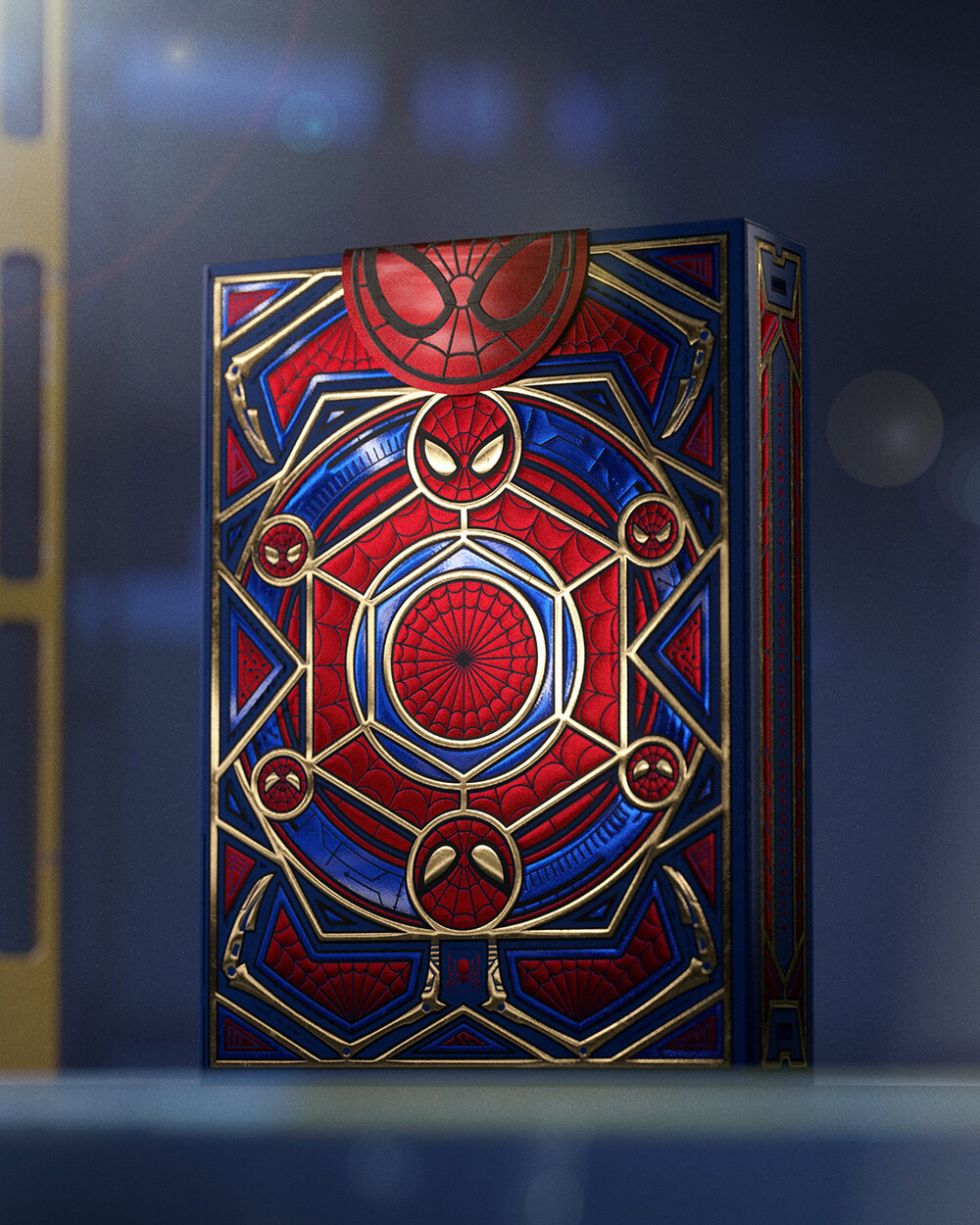 케이스는 아이언 스파이더 슈트에서 영감을 받은 강렬한 블루·레드·골드 포일을 사용해 거미줄처럼 시선을 잡아끄는 메탈릭 마감을 보여줍니다. 정밀한 엠보싱과 독자적인 텍스처(슈트 표면 감각을 살린 디테일)가 더해져 수집용으로도 전시용으로도 좋습니다.