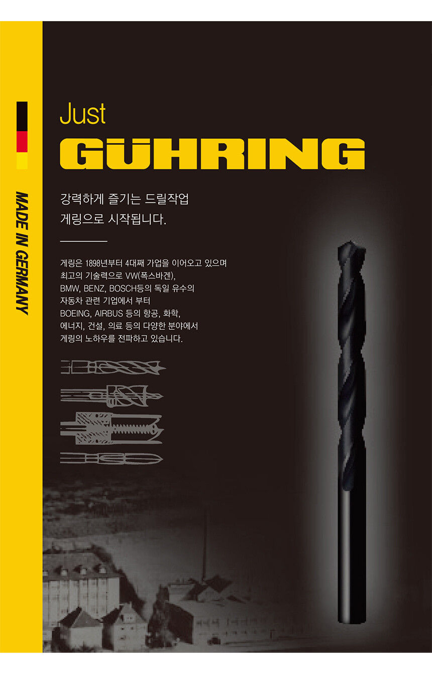 게링은 1898년에 최초의 하이스(HSS) 드릴을 생산했습니다. 게링의 다양한 드릴링 공구는 시장에서 타의 추종을 불허합니다. 게링 제품의 포트폴리오는 고속도강(HSS)부터 초경 또는 산업용 다이아몬드(PCD)까지 여러 가지 소재로 제작된 최소 0.05mm 직경의 제품부터 180mm 직경까지 매우 다양합니다.