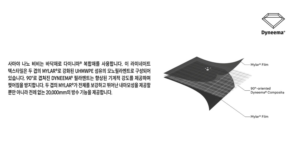 ❗바닥재인 다이니마 원단은 당김이나 긁힘에는 강한 소재이지만 뾰족한 가지나 돌 등 날카로움에는 비교적 약한 소재입니다. 설치 시 지면 상태가 고르지 않다면 풋 프린트 사용을 권장합니다.