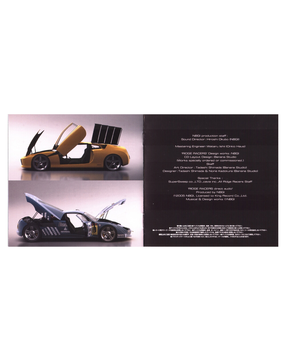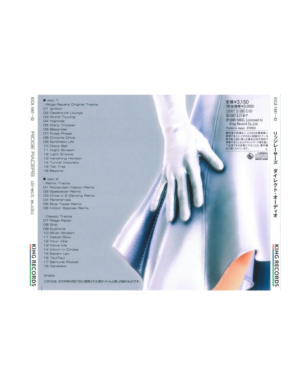 PSP 런칭 타이틀 'Ridge Racers' 의 에너지와 질주감을 그대로 담은 정식 오리지널 사운드트랙. Disc 1은 신곡 중심의 오리지널 트랙, Disc 2는 리믹스 & 클래식 트랙으로 구성되어, 시리즈의 유산(“Ridge Racer”, “Naked Glow”, “Movin’ in Circles” 등)과 2005년형 사운드 업데이트를 한 번에 즐길 수 있습니다.