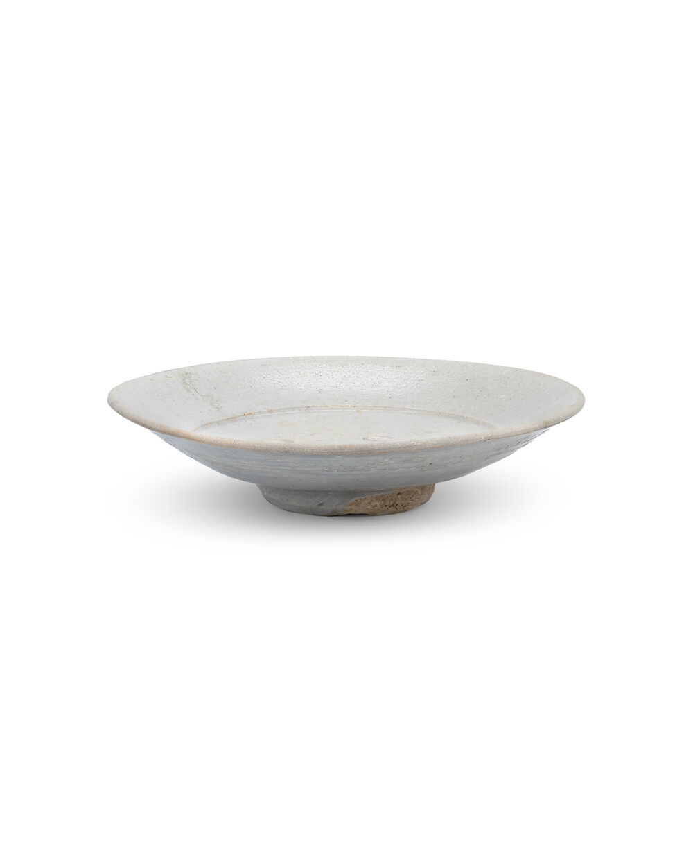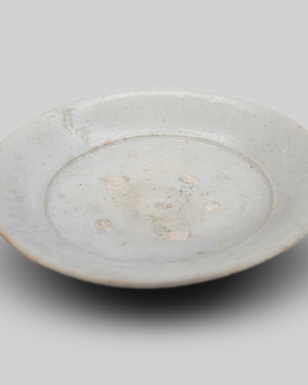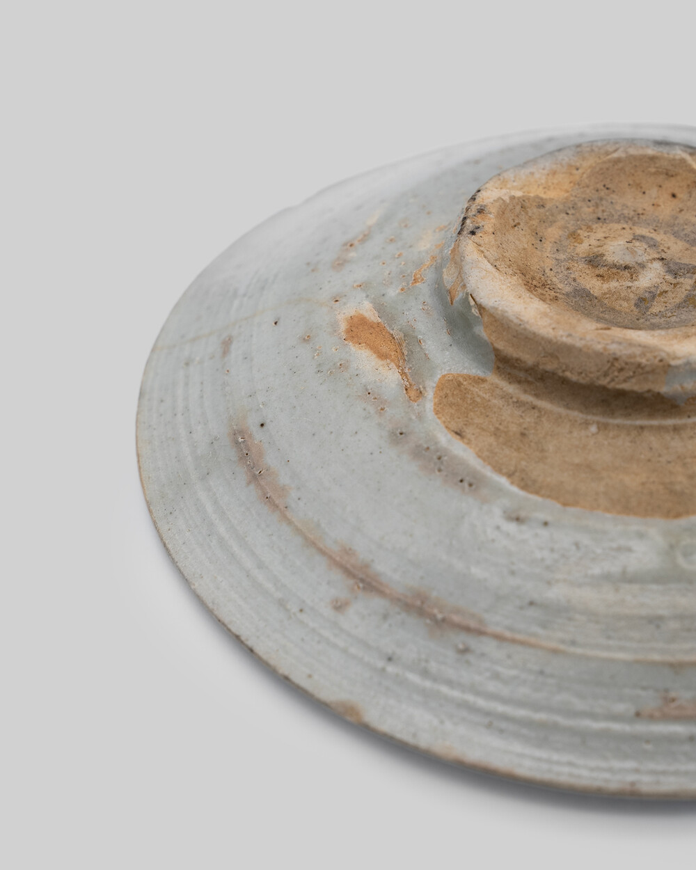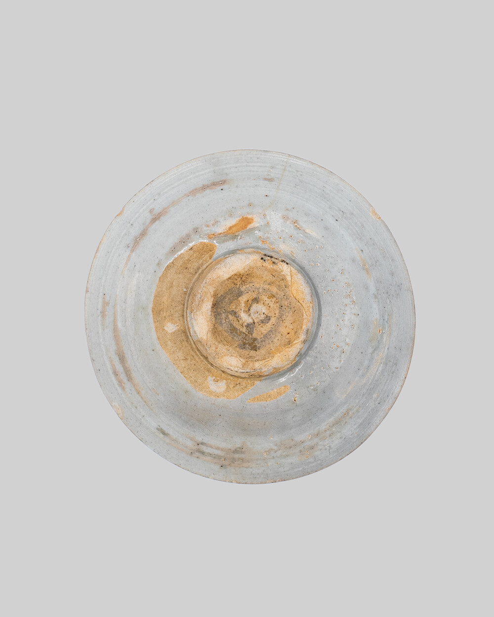 조선 전기(15세기 후반~16세기 초) 제작된 분청계 초기 백자 접시입니다. 얇게 발린 담청색 유약과 자연스러운 유약 흐름, 그리고 굽 주변에 남은 가마 받침 흔적이 노천 야외 가마 소성의 특징을 고스란히 보여줍니다. 림은 얇고 넓게 퍼지며 중앙부는 완만하게 오목한 형태를 이루어 고요한 조형미와 안정된 비례를 드러냅니다. 복원이나 보수 없이 자연 상태를 유지하고 있으며 담백한 아름다움 속에 조선 초기 도자기의 절제된 미감을 온전히 담아낸 접시입니다.