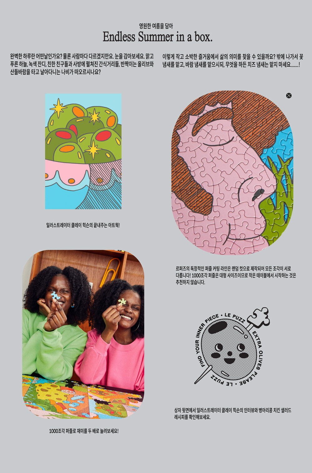Have a Groovy Day는 일러스트레이터 클레이 힉슨과 협업한 퍼즐입니다. 그의 독창적인 레트로 스타일의 아트웍에서 어느 평범한 날의 여름 바람을 느껴보세요.