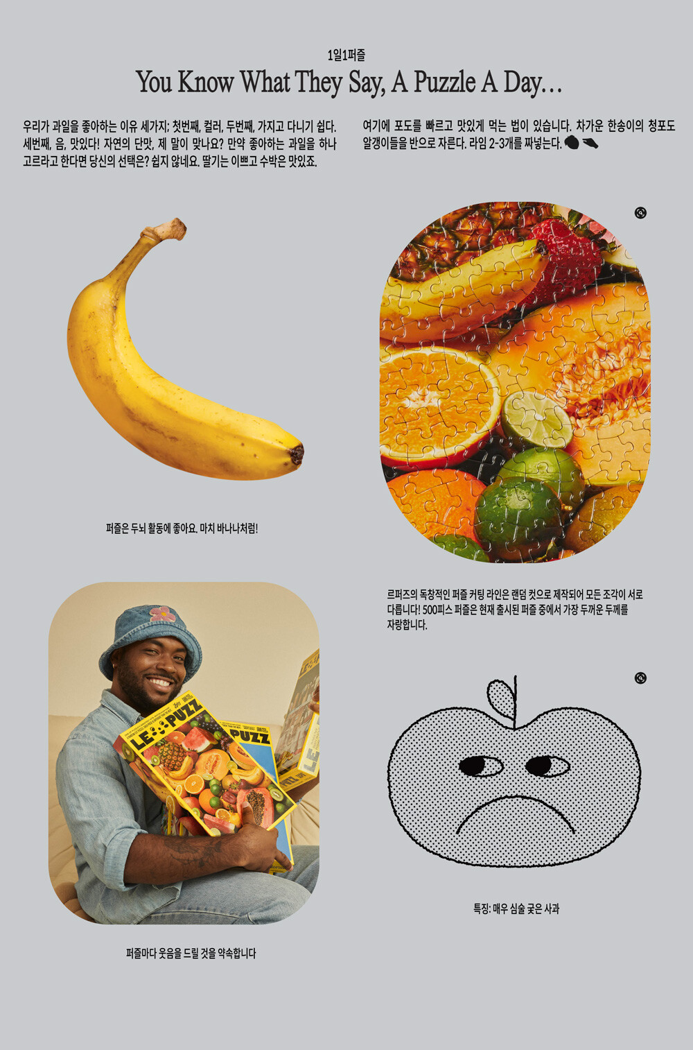 쥬시의 주제는 고전적인 직소 퍼즐의 대명사, 과일입니다! 가장자리부터…혹은 라임부터 시작해보세요. 딸기와 파파야의 씨가 환공포증을 유발할 수 있습니다. 😂