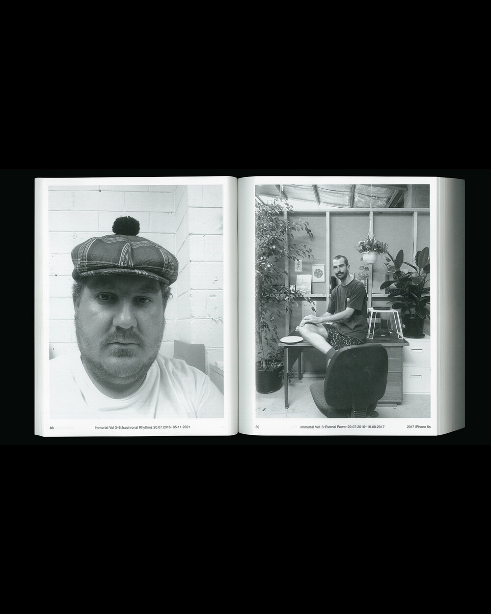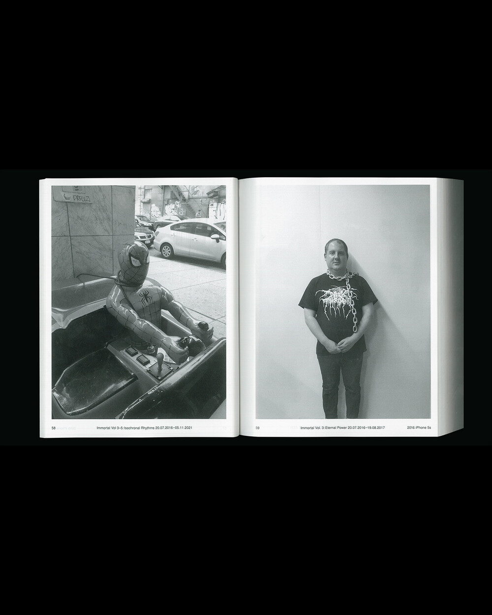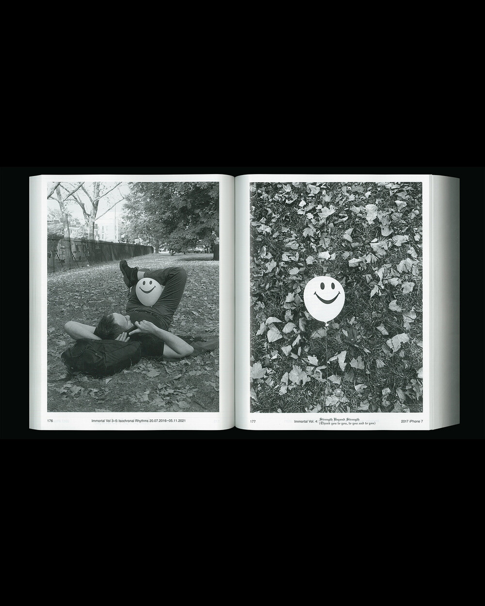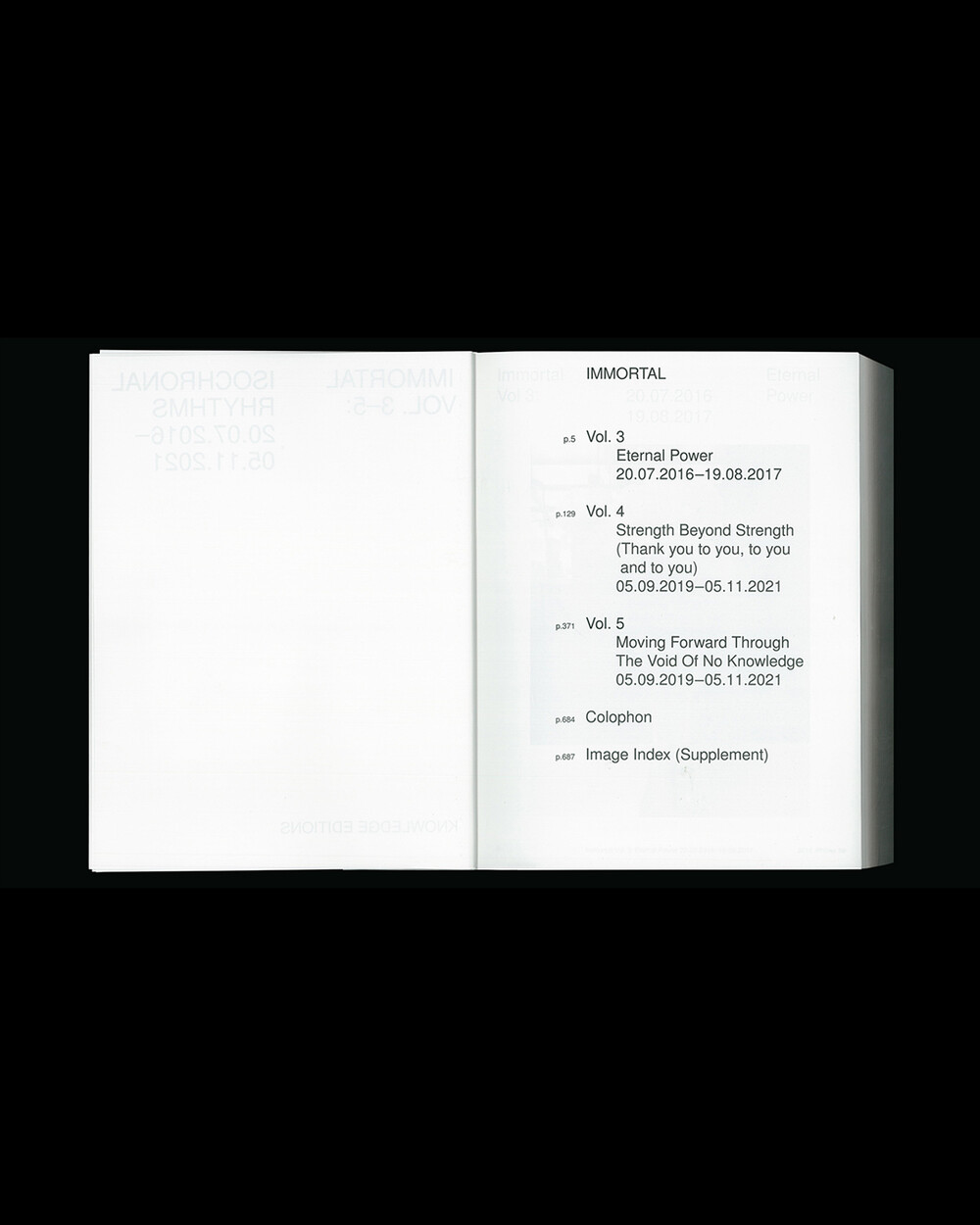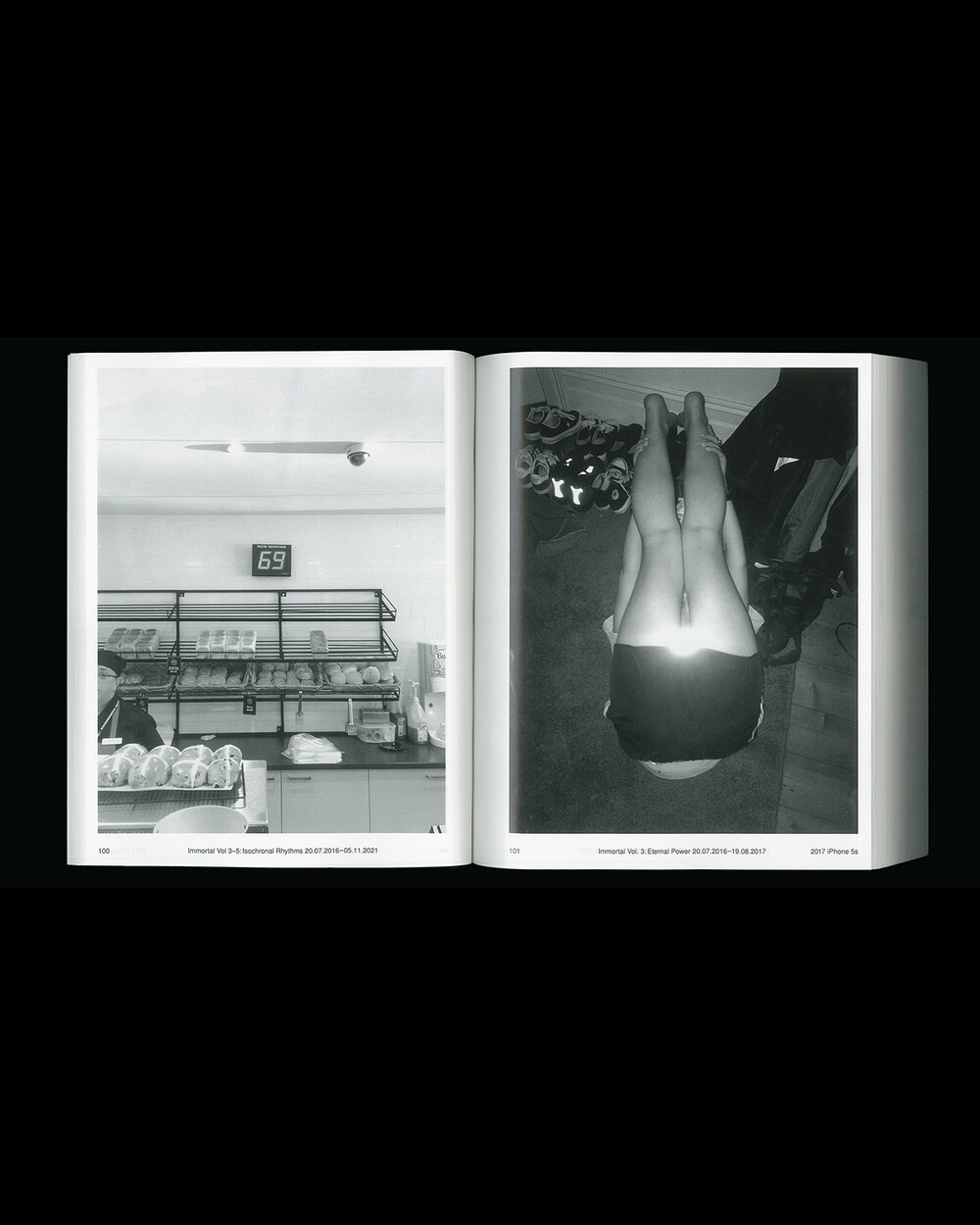 IMMORTAL Vol. 3-5: Isochronal Rhythms는 5년에 걸친 일상 관찰을 iPhone 사진을 통해 기록한 것입니다. 3개의 iPhone으로 촬영, 3개의 볼륨으로 구성된 이 책은 수만 장의 iPhone 사진들을 엄선하여 시간 순서대로 배열되었으며 이 서사 속에서 의식적이고 무의식적으로 형성되고 흐르는 일정한 리듬(isochronal rhythms)이 만들어졌습니다. IMMORTAL은 iPhone으로 촬영된 사진들을 지속적으로 아카이빙하는 작업으로 일상 속의 환희, 유머, 호기심, 단조로움, 그리고 부조리함의 순간들을 유형화한 것입니다.