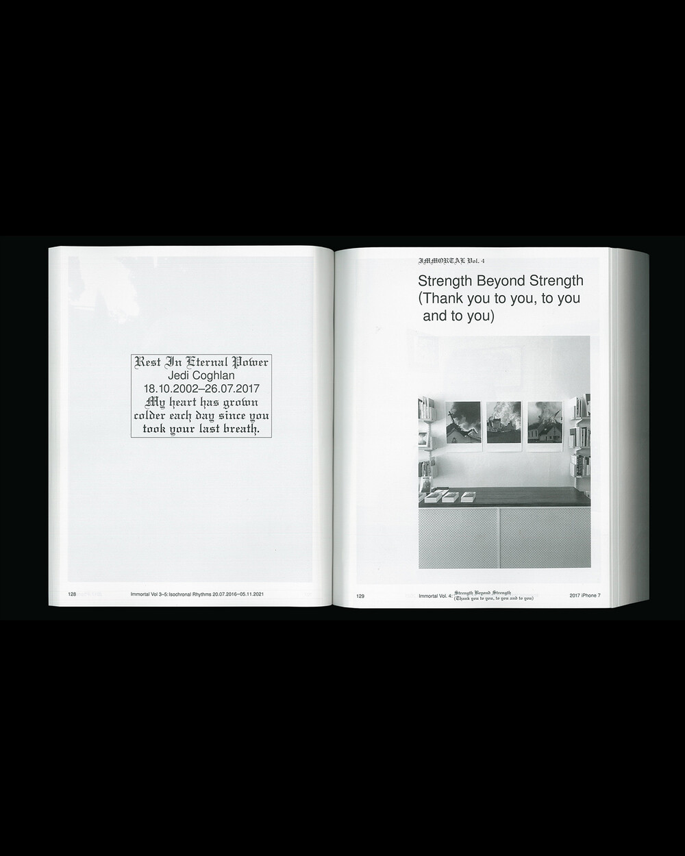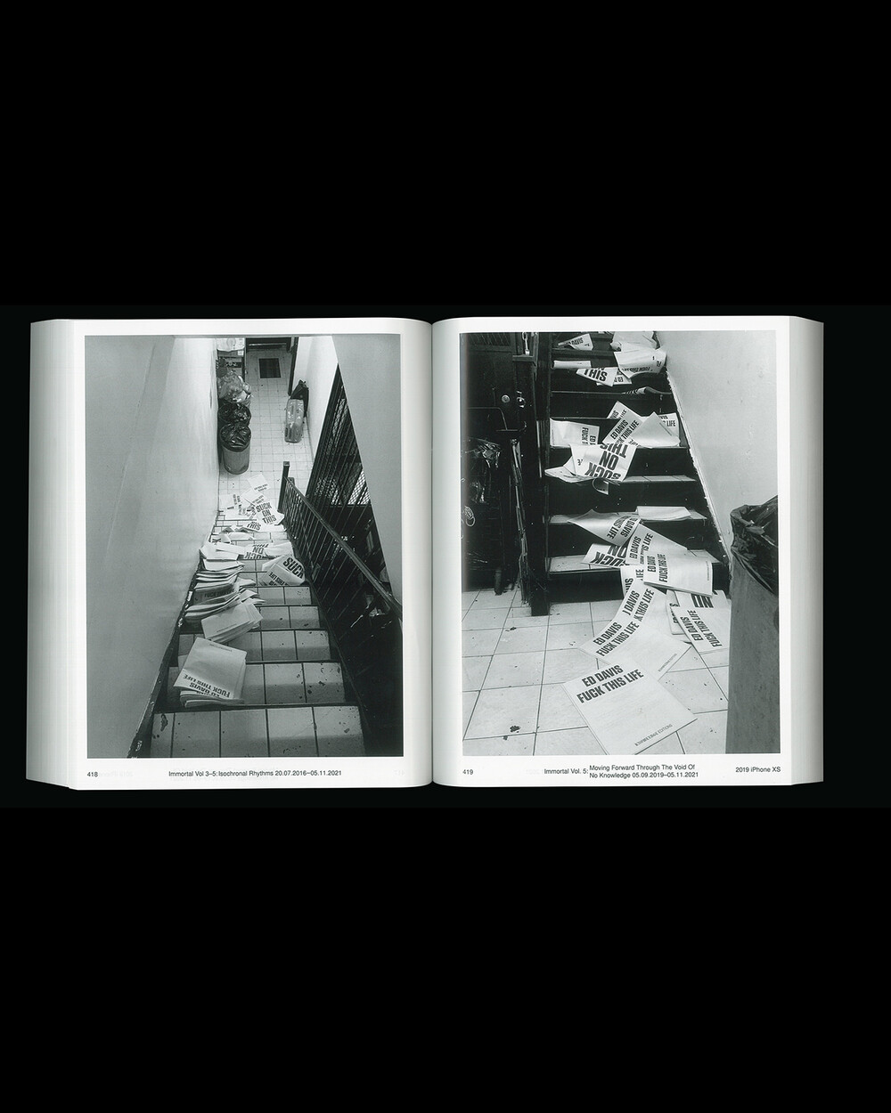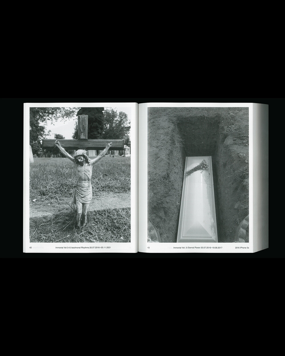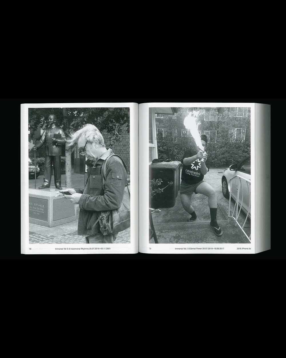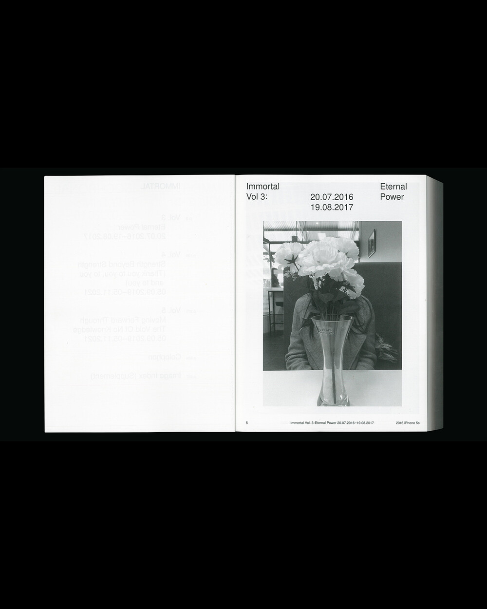 IMMORTAL Vol. 3-5: Isochronal Rhythms는 5년에 걸친 일상 관찰을 iPhone 사진을 통해 기록한 것입니다. 3개의 iPhone으로 촬영, 3개의 볼륨으로 구성된 이 책은 수만 장의 iPhone 사진들을 엄선하여 시간 순서대로 배열되었으며 이 서사 속에서 의식적이고 무의식적으로 형성되고 흐르는 일정한 리듬(isochronal rhythms)이 만들어졌습니다. IMMORTAL은 iPhone으로 촬영된 사진들을 지속적으로 아카이빙하는 작업으로 일상 속의 환희, 유머, 호기심, 단조로움, 그리고 부조리함의 순간들을 유형화한 것입니다.