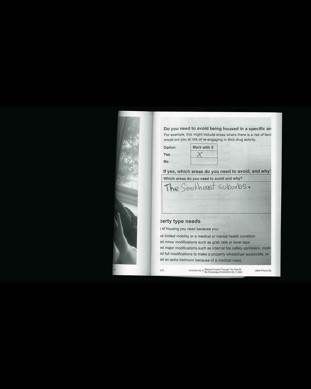 책과 함께 제공되는 32페이지의 부록은 각 사진에 대해 iPhone이 수집한 모든 메타데이터를 문서화합니다. 메타데이터는 iPhone이 각 사진에 대해 생성한 파일 이름, 촬영된 날짜와 시간, 사용된 iPhone 기기, 사용된 카메라(전면 카메라, 후면 카메라), 사진의 크기와 파일 크기, ISO, 초점 거리, 노출, 조리개 값, 셔터 속도 및 촬영된 위치로 구성되어 있습니다. 이 부록은 메타데이터를 주요 초점으로 하여 보통 사람들이 관심을 갖지 않거나 보지 않는 모든 정보를 표시하며 각 사진에 대해 얼마나 많은 데이터가 수집되는지를 보여줍니다.