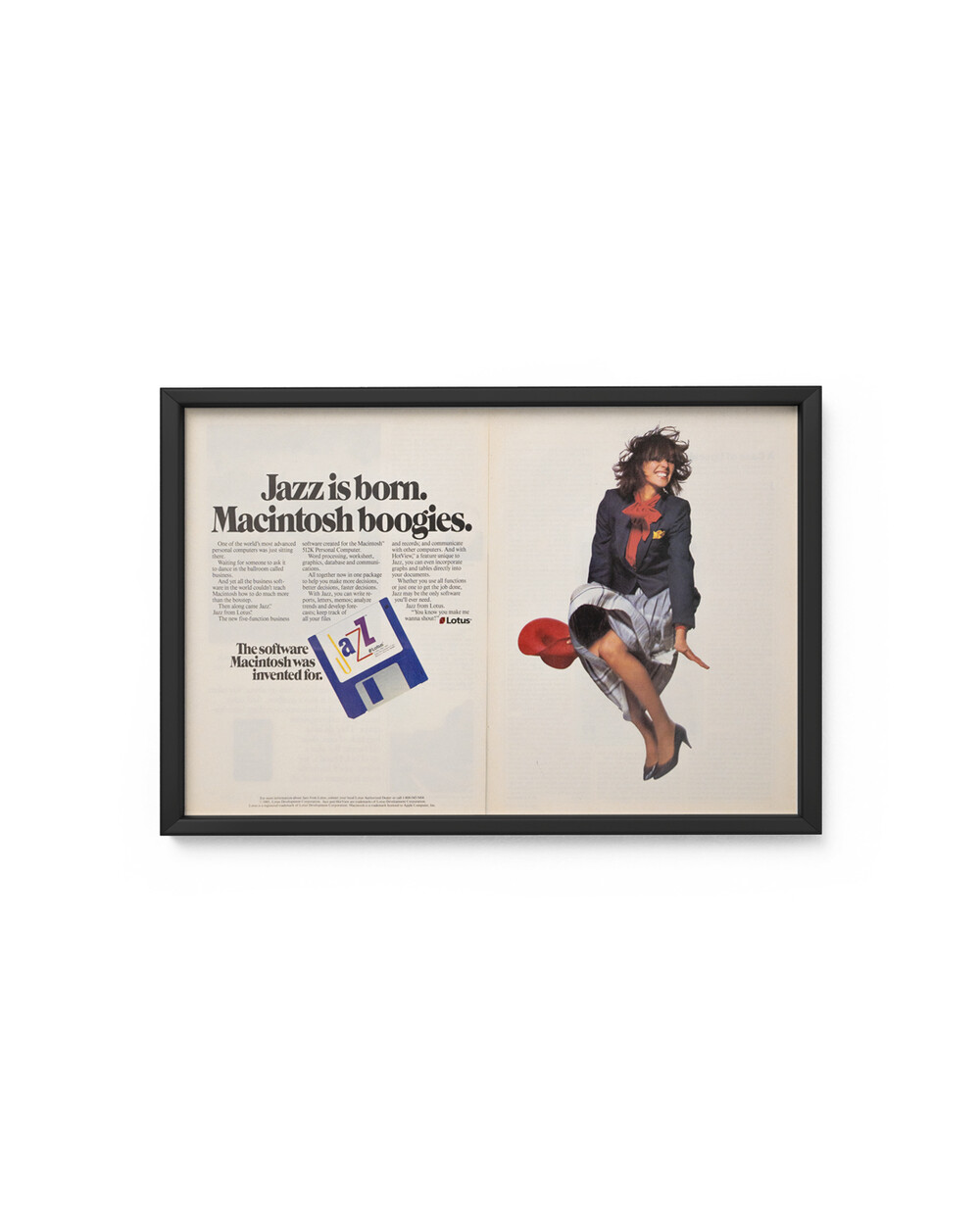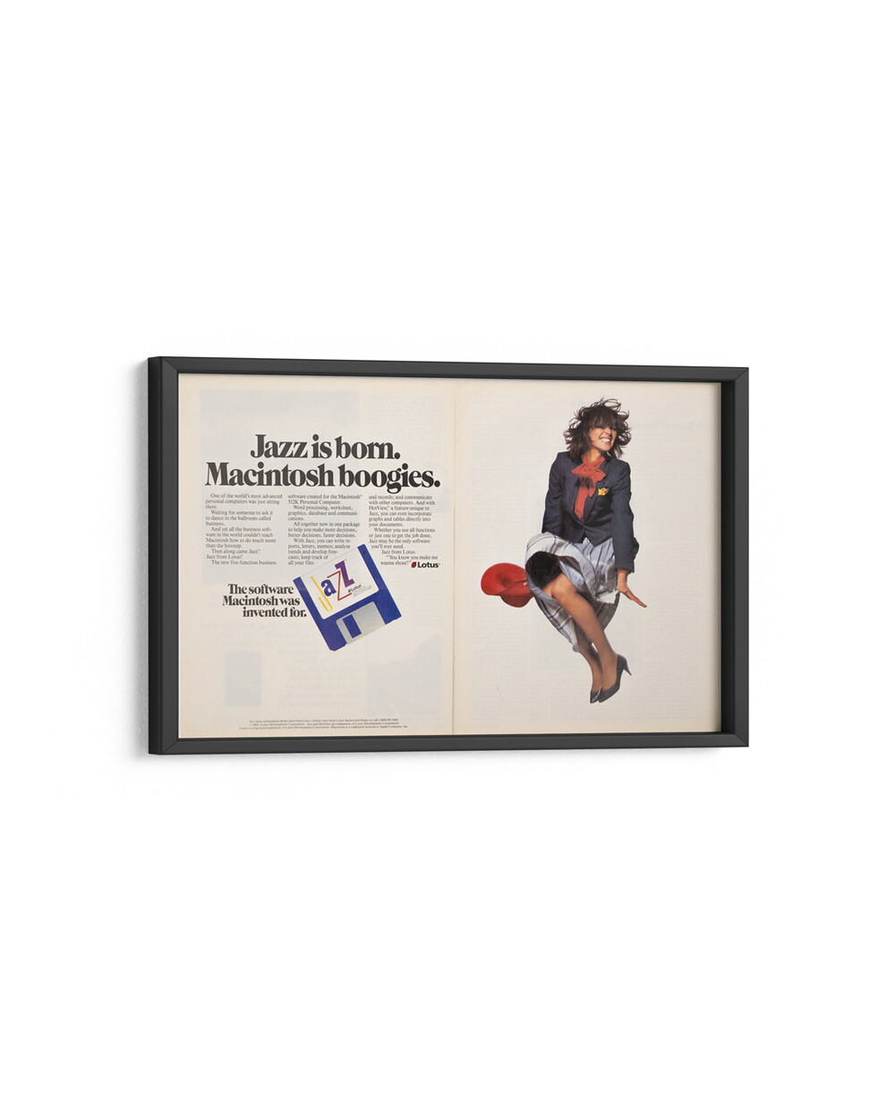 1985년 로터스 소프트웨어에서 Apple Macintosh 512k를 위해 제작한 Lotus Jazz의 광고 프린트입니다. 컴퓨터 소프트웨어로는 매우 특이한 이름인 Lotus Jazz는 워드 프로세서, 스프레드시트, 그래프 작성, 데이터베이스 및 커뮤니케이션 프로그램이 포함된 올인원 통합 사무용 제품군으로 제작되었으며 이것은 재즈의 편성-퀸텟과 앙상블을 암시합니다. Jazz는 모든 사무직 근로자를 위한 범용 솔루션을 목표로 삼았지만 거대한 마케팅 비용에도 불구하고 소비자의 선택을 받지 못했습니다. 하지만 컴퓨터와 재즈를 매칭하려고 했던 그들의 시도는 현재에도 신선한 재미를 줍니다!