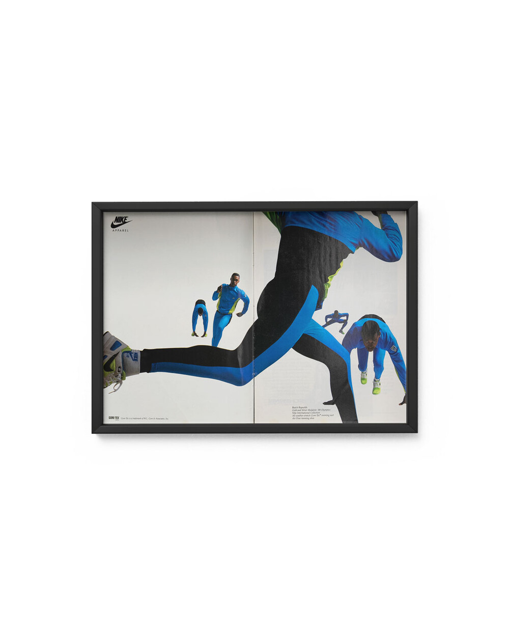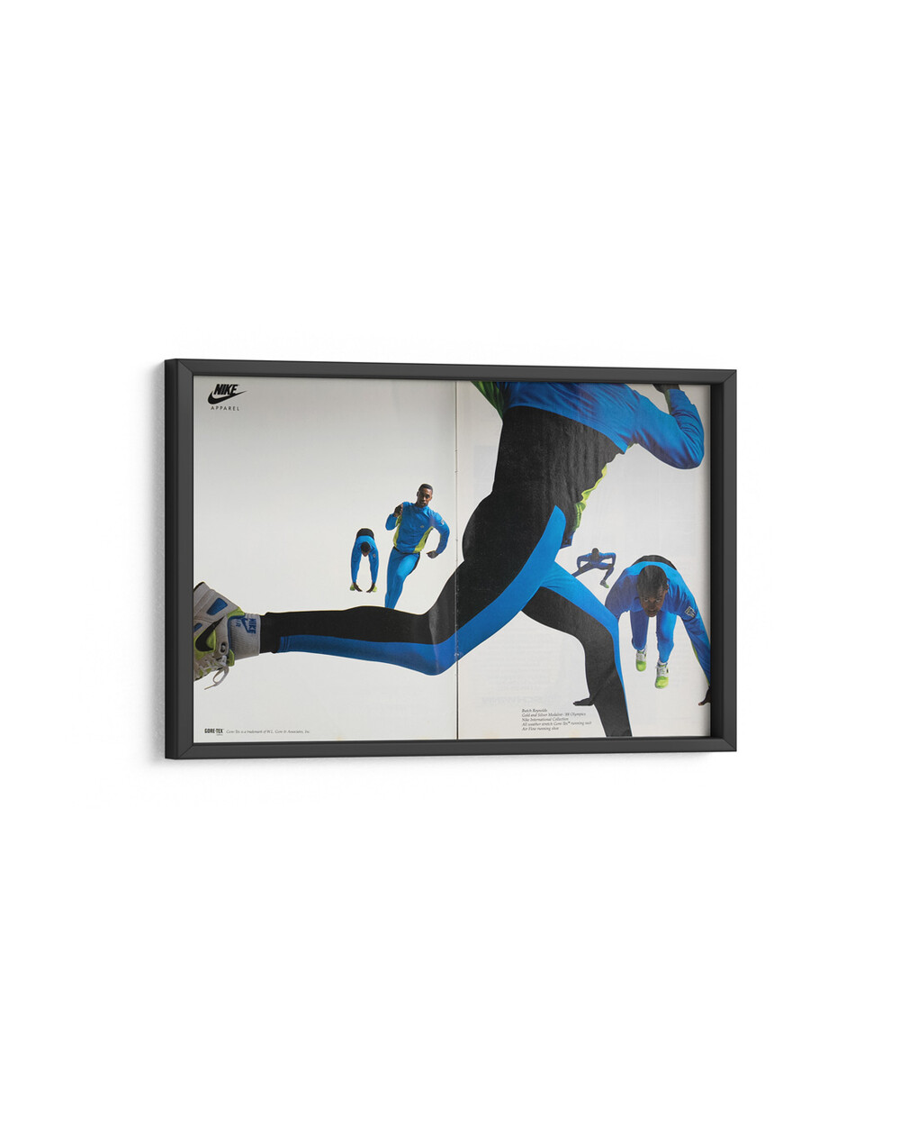 88 서울 올림픽 400 m 은메달리스트 버치 레이놀즈(Butch Reynolds)를 모델로 내세운 나이키 의류 라인 광고입니다. 짙은 블랙-블루 러닝 타이츠와 GORE-TEX® 윈드 재킷, 그리고 당시 혁신 러닝화였던 Air Flow를 ‘컷-아웃 콜라주’처럼 배치해 속도감을 극대화한 비주얼이 특징입니다. 80’s 후반 나이키가 퍼포먼스 의류 분야에서 본격적으로 존재감을 드러내던 순간을 담은 오리지널 지면 광고 프린트입니다.