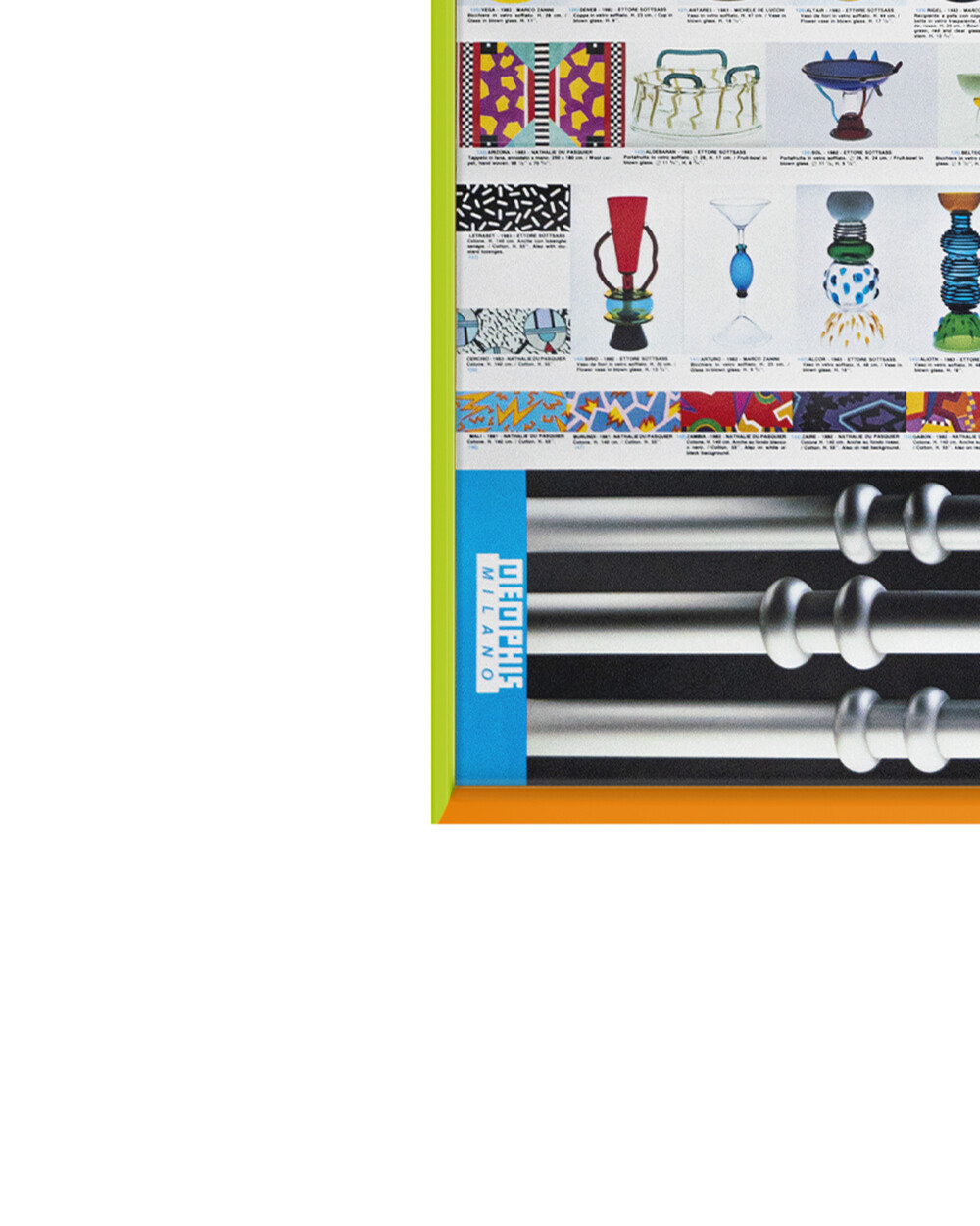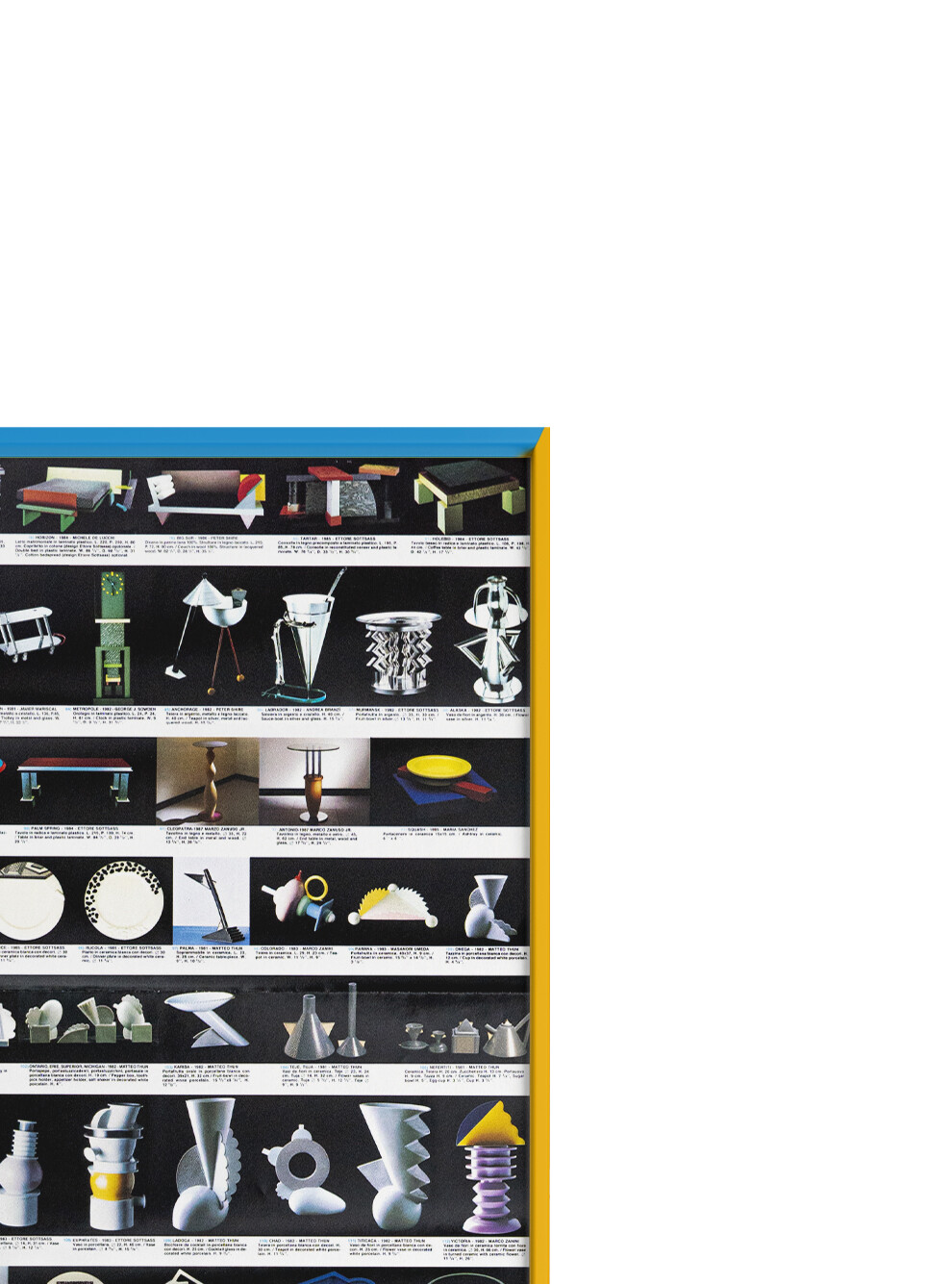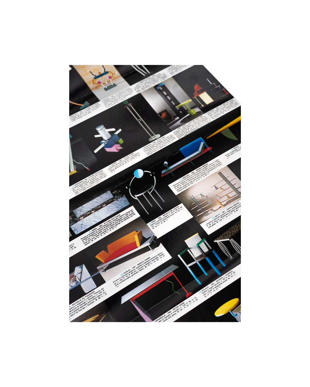 에토레 소트사스의 주도하에 멤피스 디자인이라는 새로운 물결을 일으켰던 멤피스 밀라노는 1980-1988년까지 매년 새로운 컬렉션을 선보이며 현재까지 영향을 준 전위적인 그룹입니다. 멤피스 밀라노에서 발행된 이 포스터는 마르티네 베딘, 마테오 툰, 미켈레 데 루치, 에토레 소트사스 등 멤피스 그룹의 대표 디자이너 152개의 작품들이 실려있으며 각 그림에는 제목, 연도, 디자이너, 기술적 특성 및 스펙이 포함된 자세한 캡션이 함께 제공됩니다.