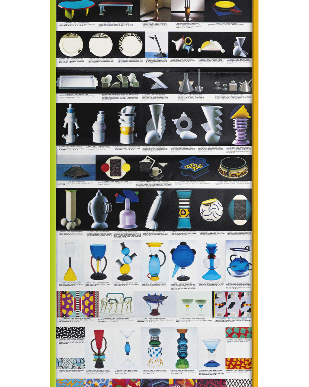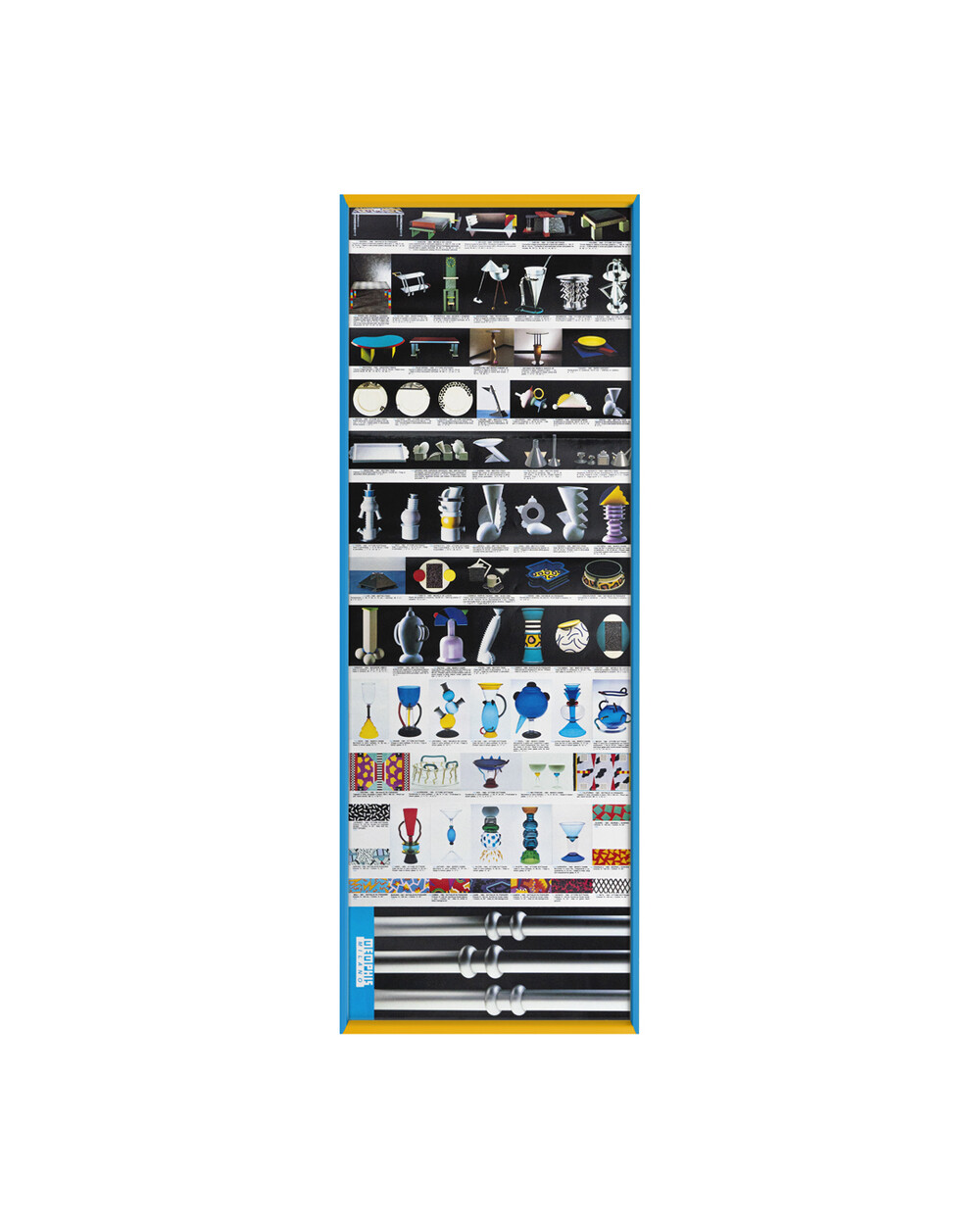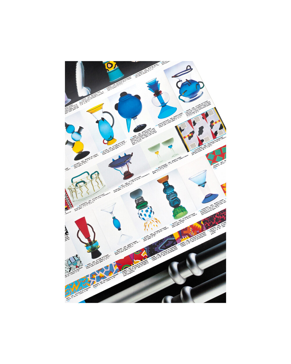 에토레 소트사스의 주도하에 멤피스 디자인이라는 새로운 물결을 일으켰던 멤피스 밀라노는 1980-1988년까지 매년 새로운 컬렉션을 선보이며 현재까지 영향을 준 전위적인 그룹입니다. 멤피스 밀라노에서 발행된 이 포스터는 마르티네 베딘, 마테오 툰, 미켈레 데 루치, 에토레 소트사스 등 멤피스 그룹의 대표 디자이너 152개의 작품들이 실려있으며 각 그림에는 제목, 연도, 디자이너, 기술적 특성 및 스펙이 포함된 자세한 캡션이 함께 제공됩니다.