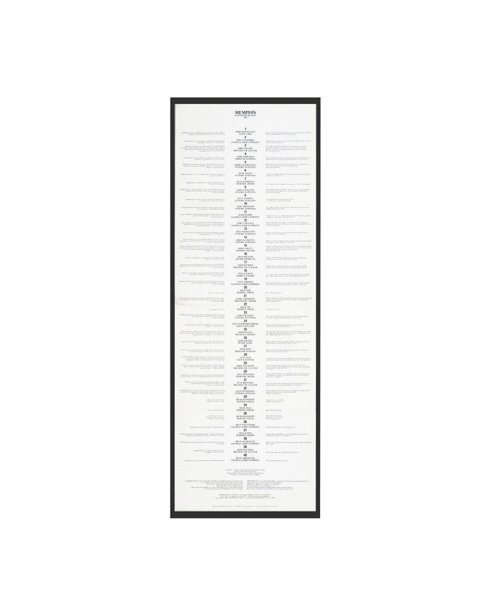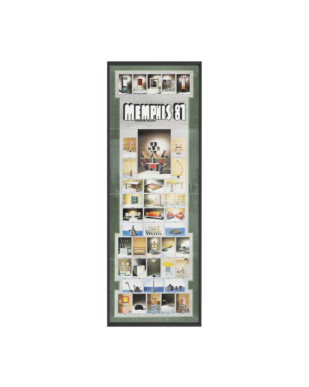 에토레 소트사스의 주도하에 멤피스 디자인이라는 새로운 물결을 일으켰던 멤피스 밀라노는 1980-1988년까지 매년 새로운 컬렉션을 선보이며 현재까지 영향을 준 전위적인 그룹입니다. 멤피스 밀라노에서 발행된 이 포스터는 마르티네 베딘, 마테오 툰, 미켈레 데 루치, 에토레 소트사스 등 멤피스 그룹의 대표 디자이너 40개의 작품들이 실려있으며 각 그림에는 제목, 연도, 디자이너, 기술적 특성 및 스펙이 포함된 자세한 캡션이 함께 제공됩니다.