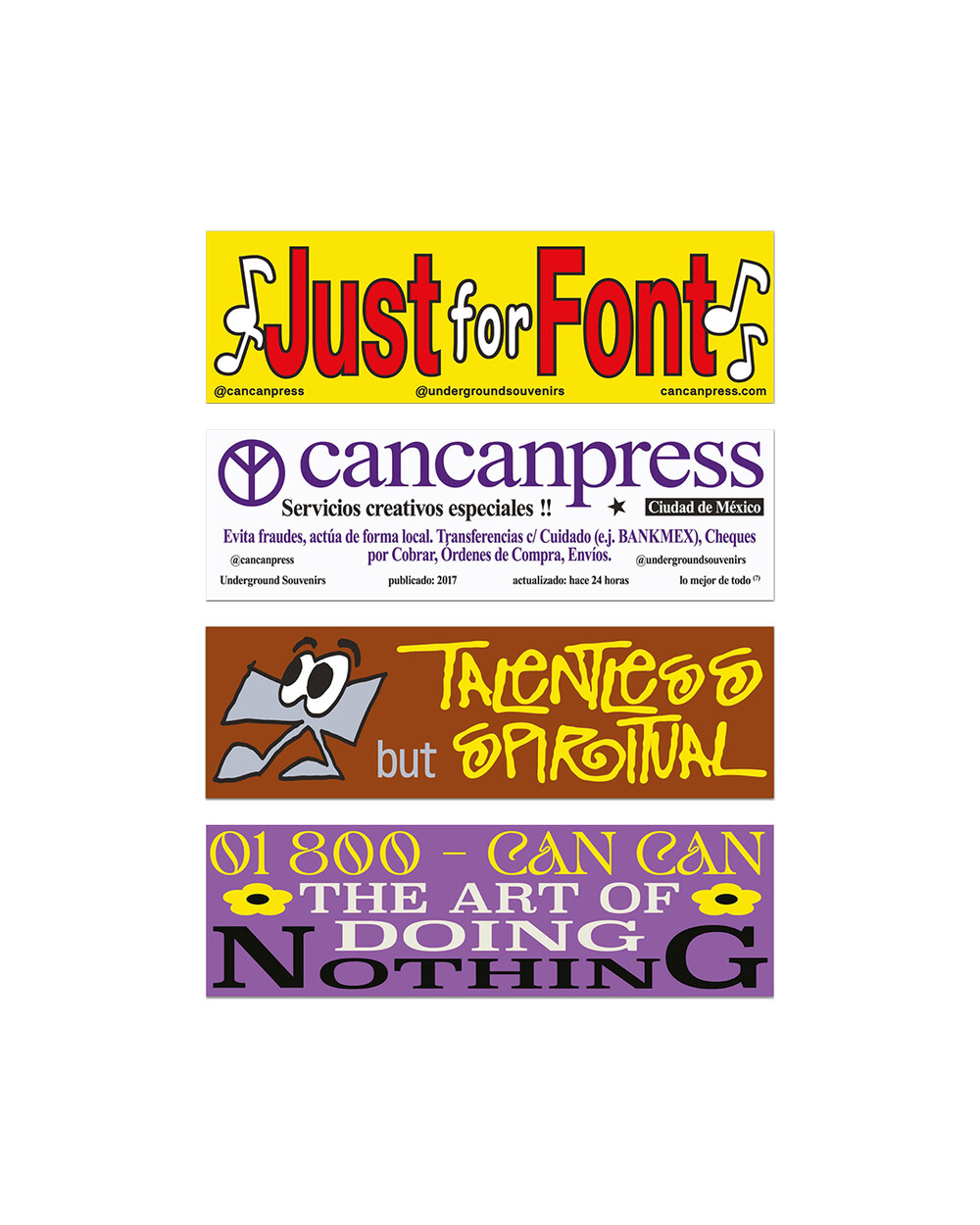 멕시코시티 크리에티브 스튜디오 Can Can Press가 2025년 Underground Souvenirs 시리즈로 선보인 2025 Bumper Sticker Pack은 차량·스케이트보드·노트북 어디에 붙여도 단번에 시선을 훔치는 네 장 한 세트의 아트 스티커입니다. 웹 그래픽·낙서·팬진 감성을 오가는 캔캔 특유의 아이콘이 가득해 판지 상자나 여행 가방에 한 장씩 붙이는 순간 평범한 사물이 즉석에서 DIY 포스터처럼 변신합니다. 매트 마감 방수 비닐(vinyl) 소재를 사용해 차체·헬멧·물병에도 오래 견디며 뒷면은 균일한 점착층으로 찢김 없이 깔끔하게 부착·제거가 가능합니다.