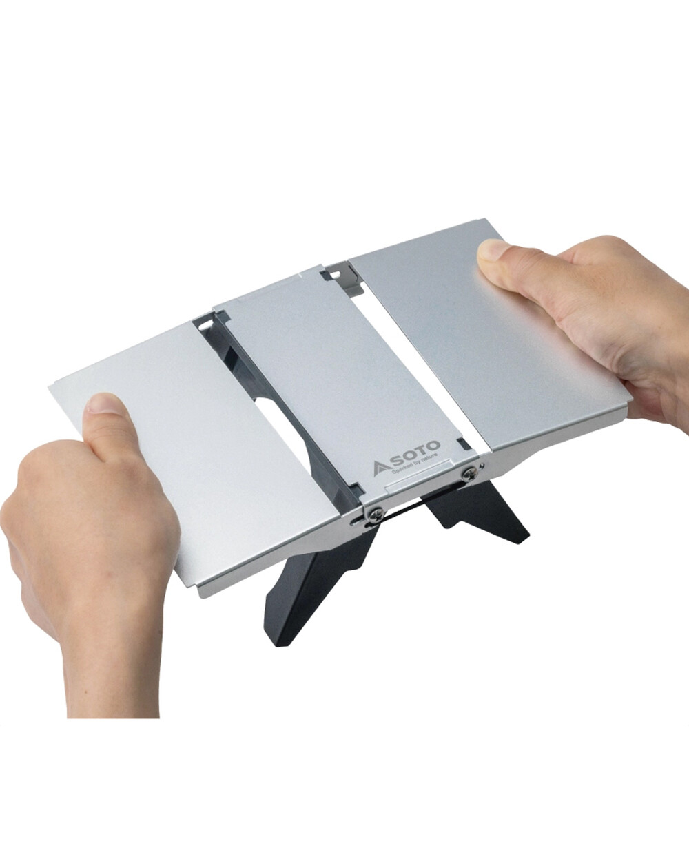 무게 135g의 초경량을 자랑하는 산악용 미니 테이블입니다. 단순히 가벼운 테이블을 넘어, SOTO의 레귤레이터 스토브 'TriTrail(ST-350)'과 최고의 호흡을 맞추도록 설계되었습니다. 사용 시에는 부탄가스 캔(CB캔) 위를 덮는 형태로 설치하여 죽은 공간(Dead Space)을 유용한 테이블로 활용할 수 있으며, 동시에 복사열로부터 가스 캔을 보호하는 역할도 수행합니다.