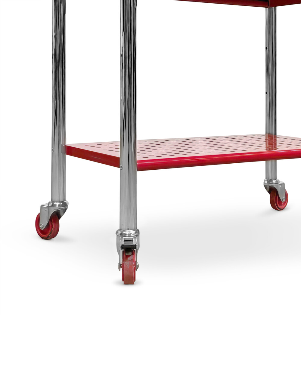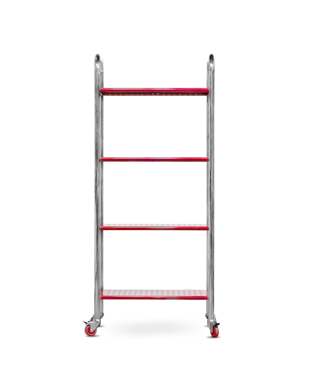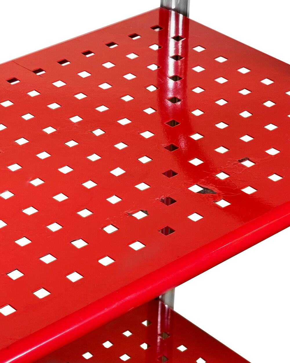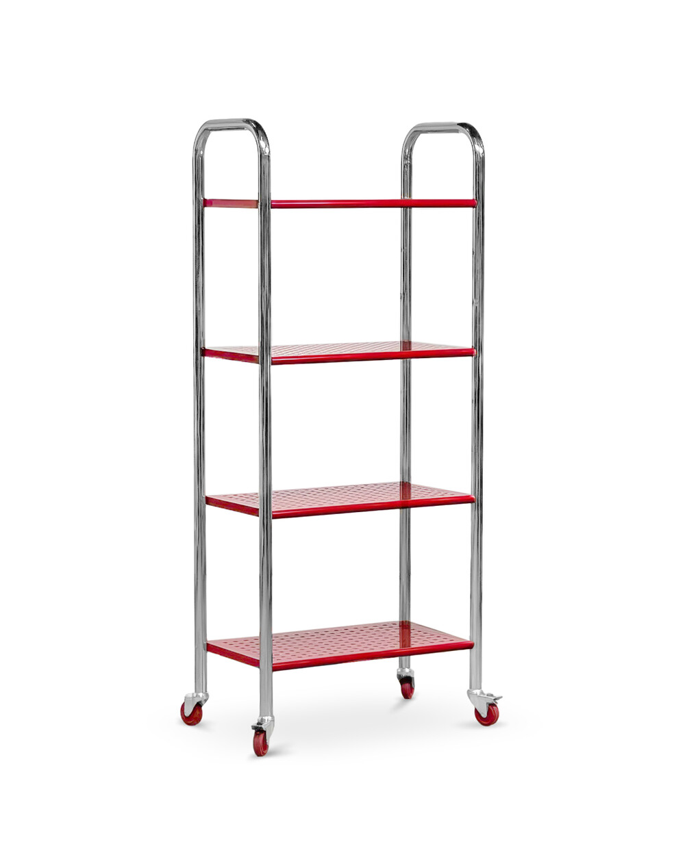 레드 컬러 타공 선반과 크롬 스틸 프레임이 멋스럽게 조화를 이루며, 하단에 달린 캐스터로 이동이 용이합니다. 4단 선반은 다양한 아이템을 효율적으로 수납할 수 있어 실용적이고, 빈티지와 모던함이 어우러진 스타일로 공간에 독특한 분위기를 더해줍니다.