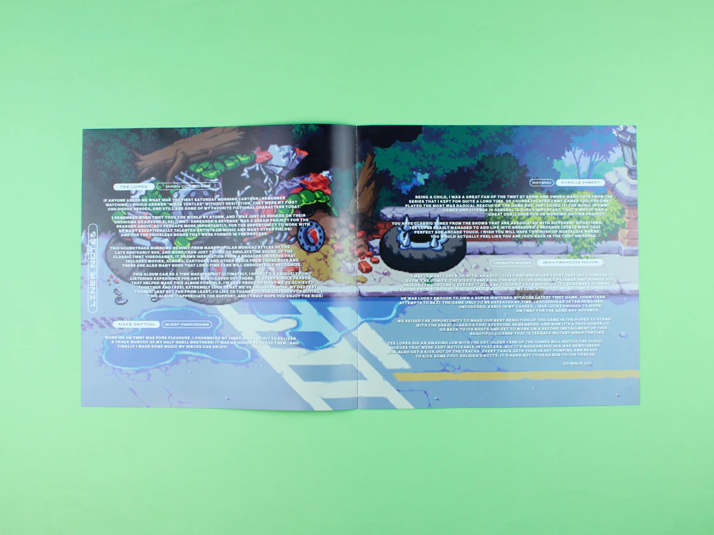 2022년 출시한 TMNT: 슈레더의 복수는 역사상 가장 상징적인 팝 컬처 중 하나인 TMNT의 올드 게임들을 계승한 게임으로서 Sonic Mania와 Streets of Rage 4: Mr X's Nightmare의 음악 제작에 참여한 Tee Lopes가 이 게임의 Original Game Soundtrack을 맡았습니다. 그의 음악적 비전은 닌자 거북이의 정신과 이전 TMNT 게임들의 특성을 반영하는 것으로 고전 TMNT 곡에 대한 찬사와 80/90년대 일렉트로, 펑크, 록 및 칩튠 바이브와 함께 재즈 곡 사이를 유동적으로 전환합니다.여기에 전설적인 힙합 크루 Wu-Tang Clan의 Raekwon The Chef 와 Ghostface Killah, Faith No More 및 Mr Bungle의 프론트맨 Mike Patton과 같은 전설들이 참여한 것은 매우 경이로운 일입니다. 그들 모두는 게임과 OST를 위해 특별히 녹음된 독점 트랙을 연주했습니다.
