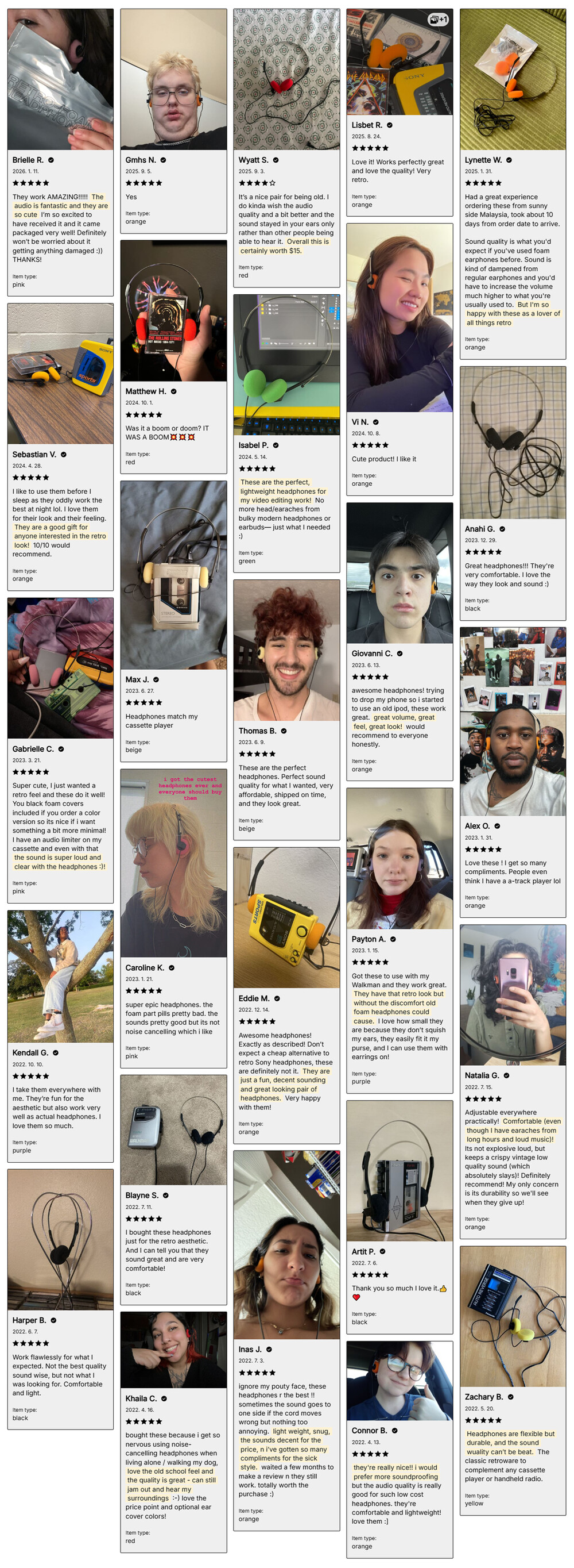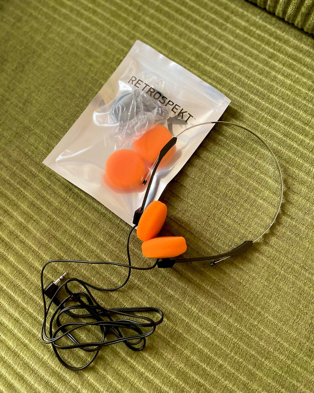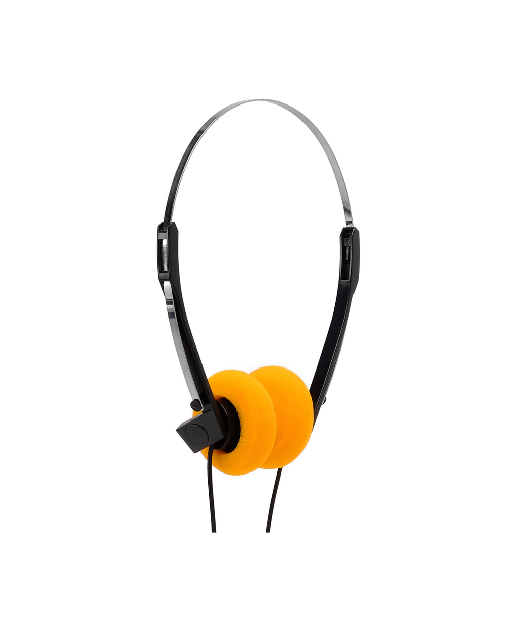 워크맨 시대 감성 그대로의 폼 패드 온이어 헤드폰. 밝은 컬러 폼과 슬림 메탈 밴드, 조절식 플라스틱 클립으로 가볍고 편하게 착용되며, 레트로 무드의 로파이 청취용으로 최적화되었습니다. 3.5mm AUX 잭으로 기기 호환이 쉽고, 약 4ft(≈1.2m) 케이블은 휴대·이동에 간편합니다.