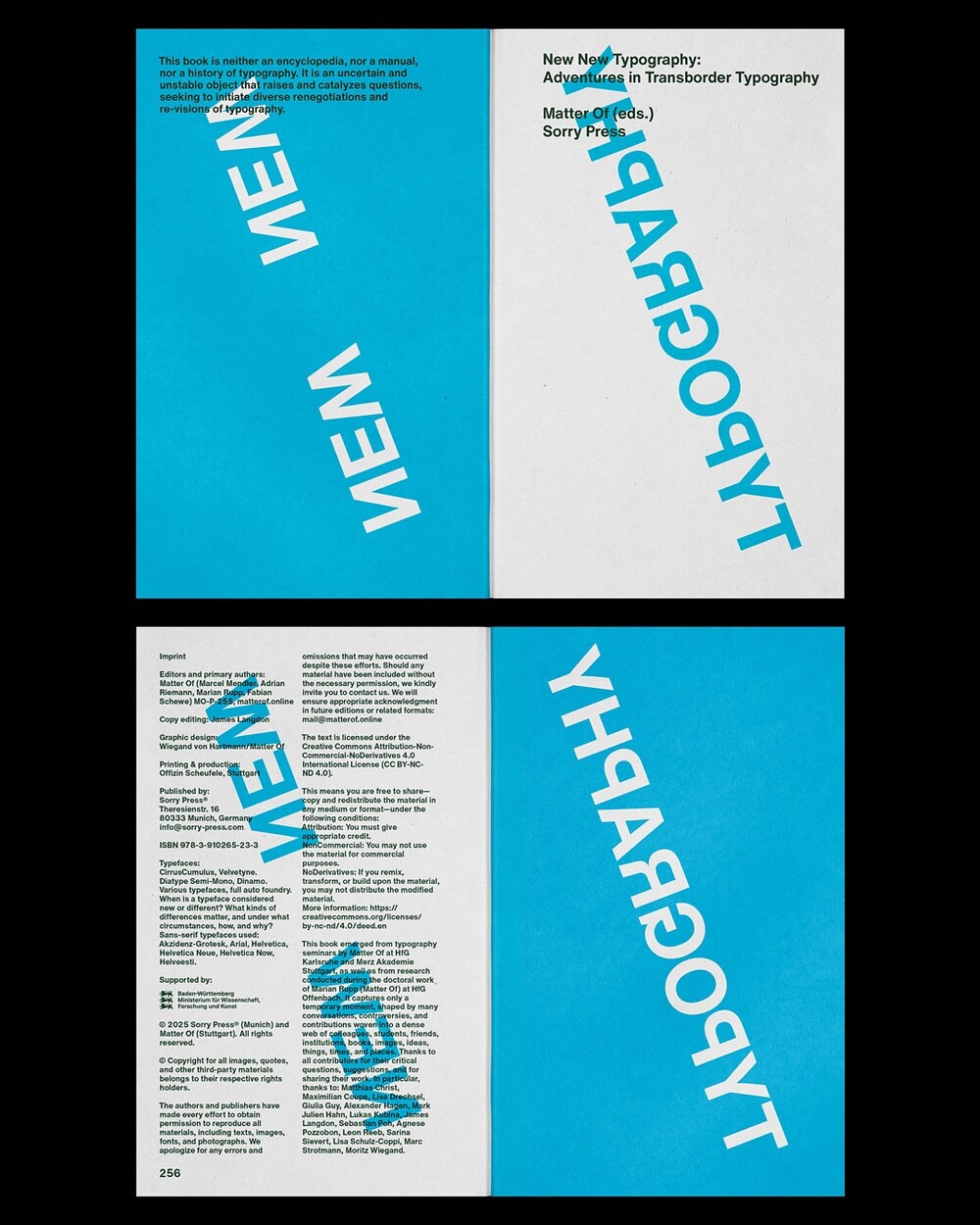 중앙 유럽에서 이른바 'New Typography(신 타이포그래피)'가 선언된 지 100년이 지난 지금, 약간 아이러니한 질문인 'New New Typography'가 등장합니다 — 이것은 단순한 업데이트라기보다 보편적인 규칙에 이의를 제기하는 질문입니다. 그 결과 이 책은 기존의 패러다임을 뒤흔들고, 타이포그래피를 더 확장되고 더 포괄적인 어휘로 열어 보이려고 합니다. 여기서 'New New'는 혁신이나 진보라기보다 재지향(reorientation), 즉 과거와 현재 사이에서 관점을 새로 잡아 그동안 소외되거나, 주변화되거나, 배제돼 온 실천들을 전면으로 끌어올리는 행위를 뜻합니다.