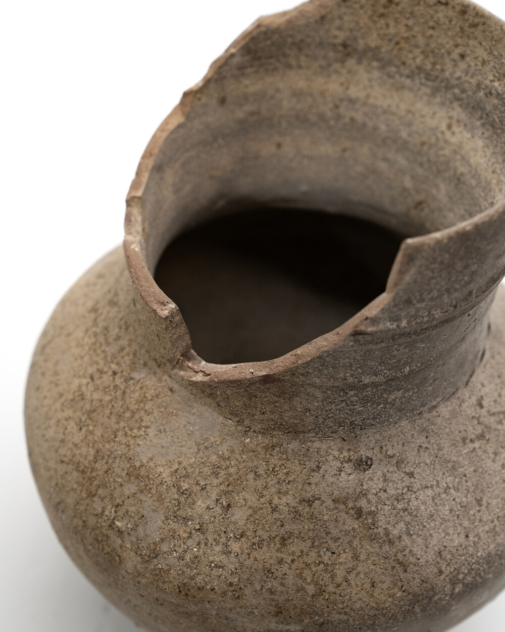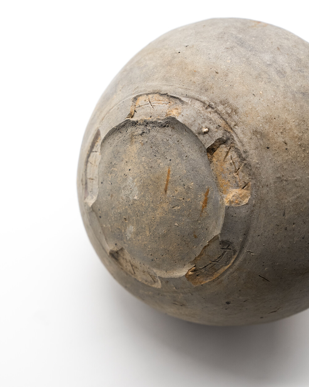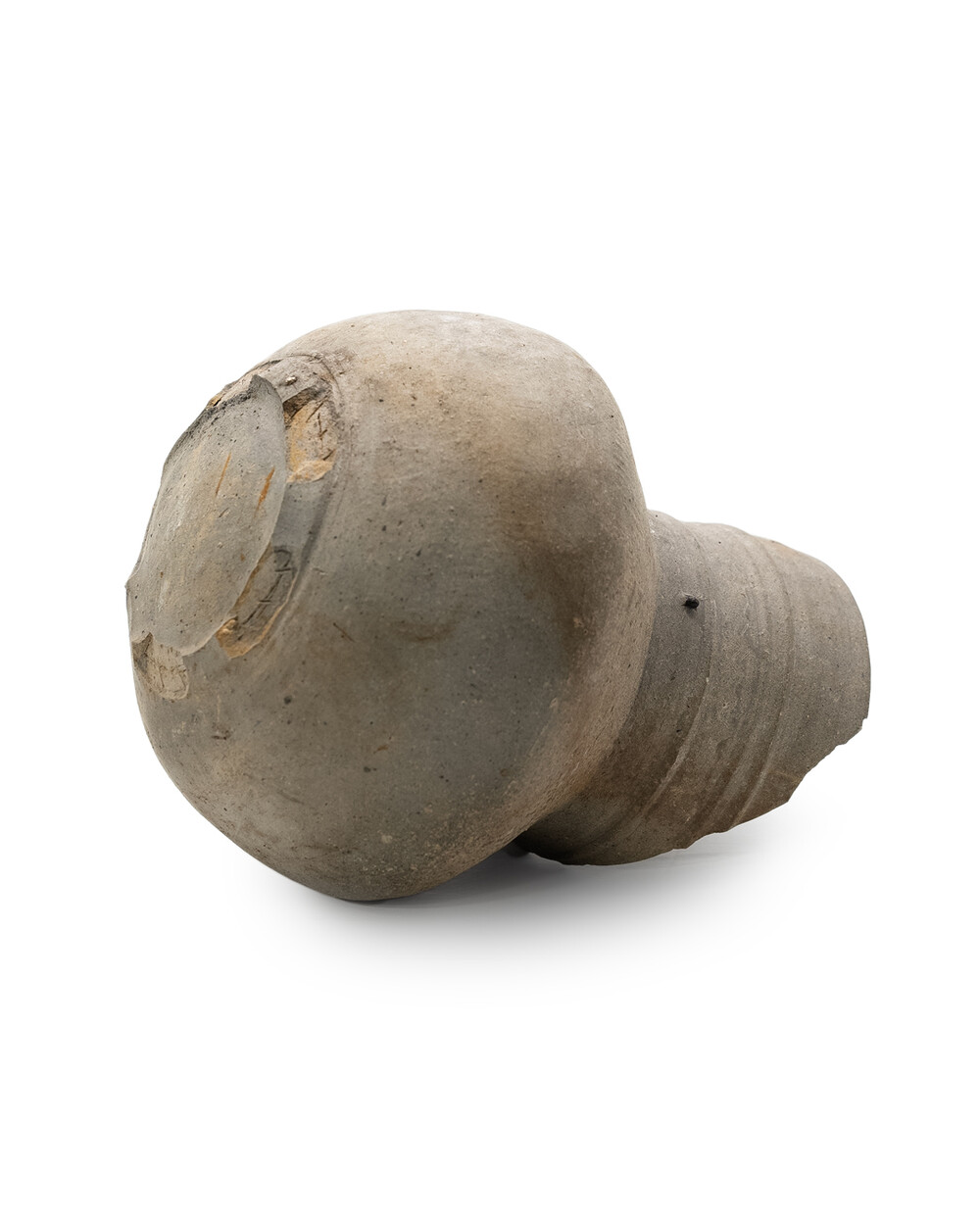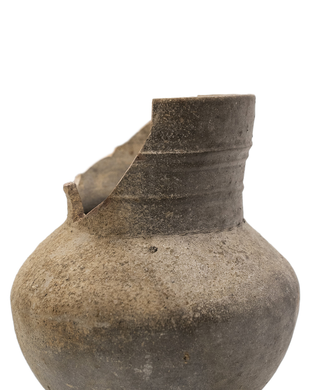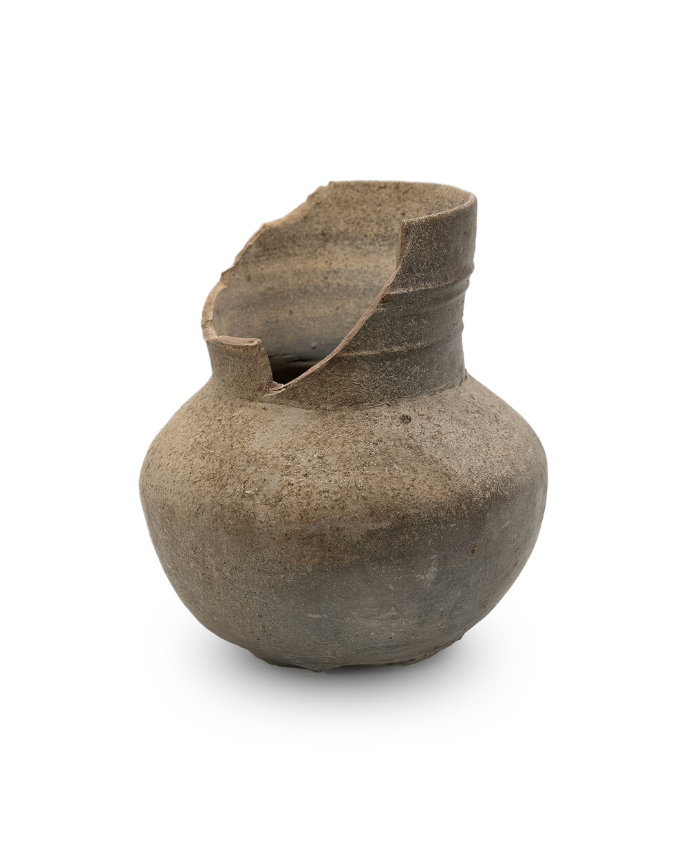 백제 중·후기(5 ~ 6세기) 생활 ·의례용 장경호 (목항아리)입니다. 야외 가마에서 환원 소성된 흑갈색 토기로, 목 둘레에 새긴 삼선 띠가 백제 토기의 특징을 잘 보여줍니다. 몸체는 난형으로 빚은 뒤 패들로 다듬고, 표면을 가볍게 연마해 은은한 광택을 남겼습니다. 림과 목 일부가 결실되었지만 몸통은 안정적으로 보존되었으며 표면 토양 침착·소성 흔적이 백제 토기의 질박한 미감을 드러냅니다.