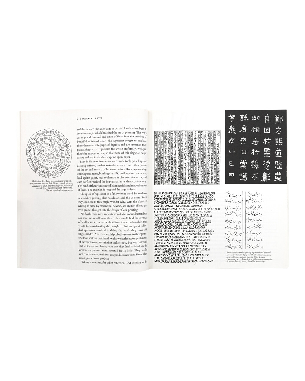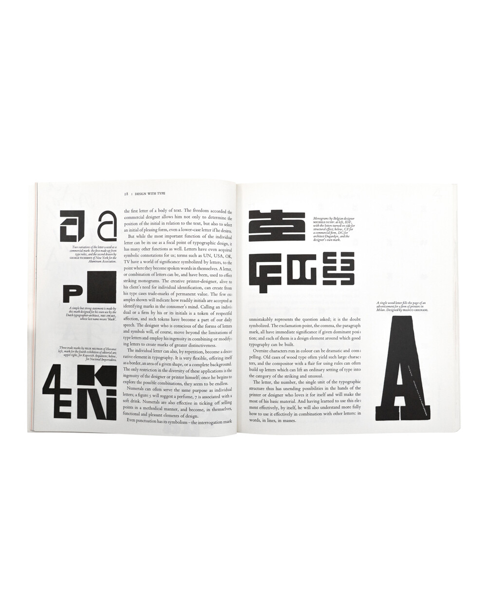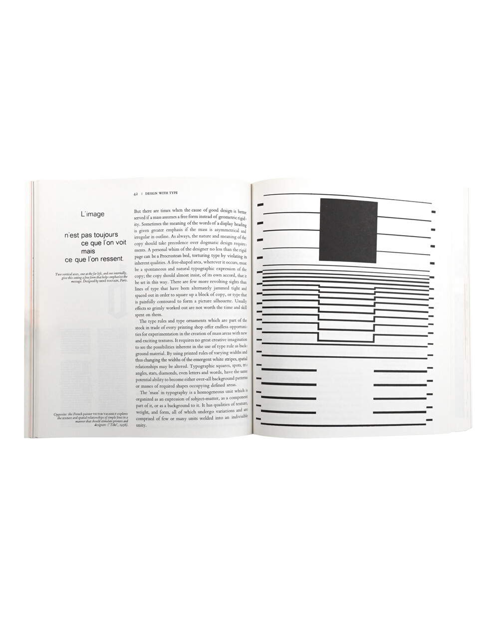 Design with Type은 1952년에 처음 출판되어 여러 상을 수상하고 1967년 재출간되었습니다. 이 개정판은 미국 그래픽 아트 협회(AIGA)에서 올해의 책으로 선정된 최초의 캐나다 작품이며 저작자인 Carl Dair(1912-1967)는 커뮤니케이션 수단뿐만 아니라 디자인 재료로서의 활자에 대해 논의하면서, 오늘날에도 여전히 사용되고있는 타이포그래피의 시각적 디자인 원칙을 개발했습니다. 그는 개별 문자의 검토로 시작하여 단어, 행 및 텍스트 덩어리로 진행되는 타이포그래피 연구를 통해 독자를 안내합니다.