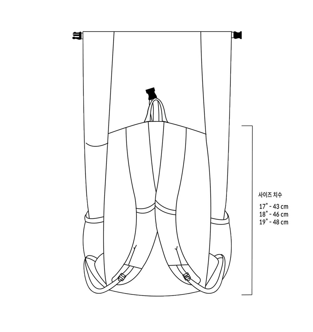 19" (약 48 cm) : 173 cm 이상 / 평균 이상 신장·넓은 가슴·허리 벨트 활용이 잦은 하이커에게 권장.
