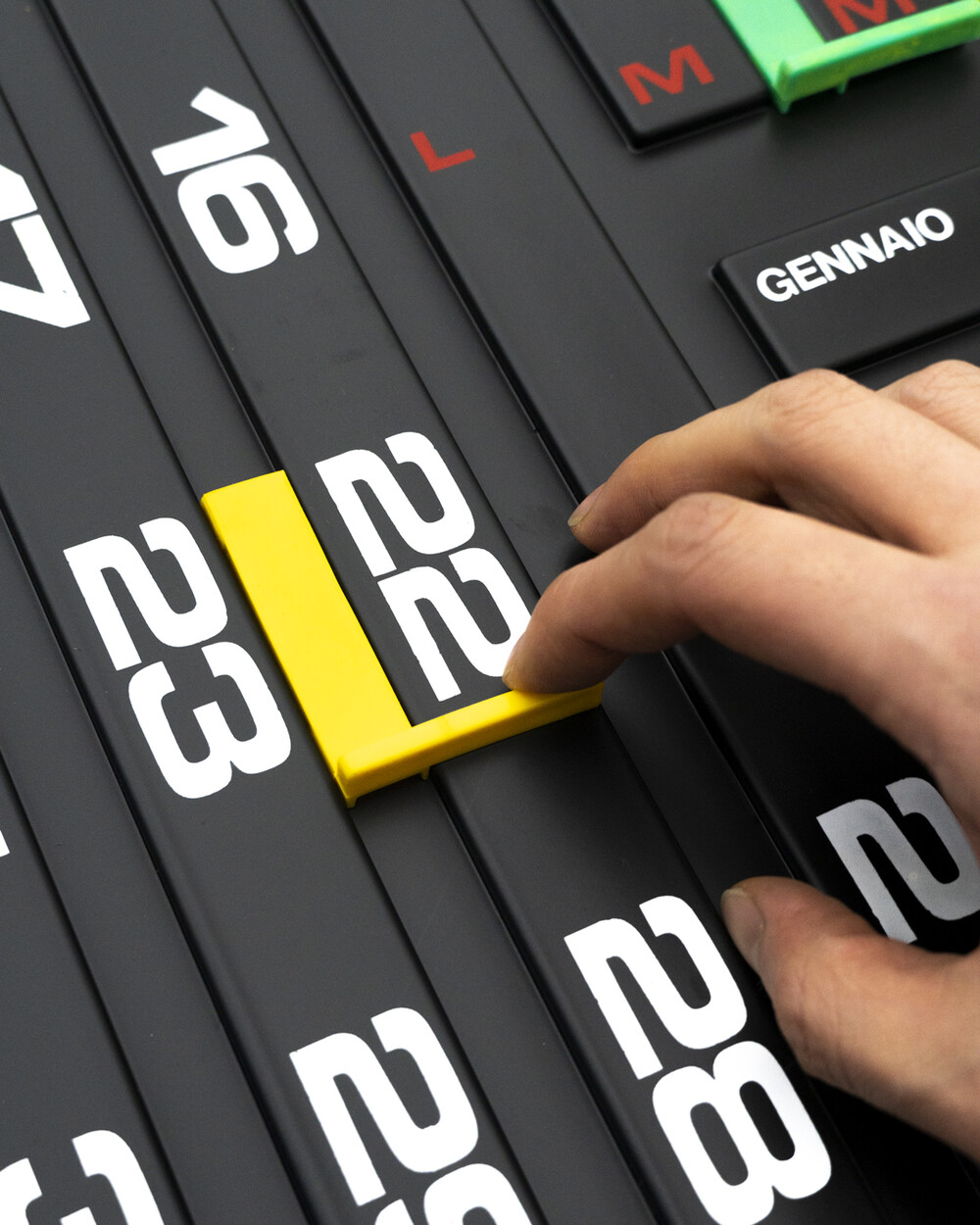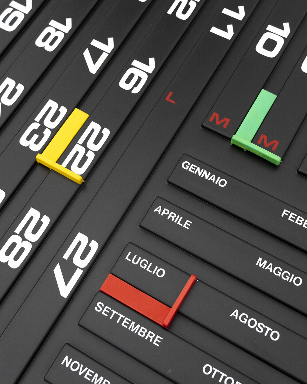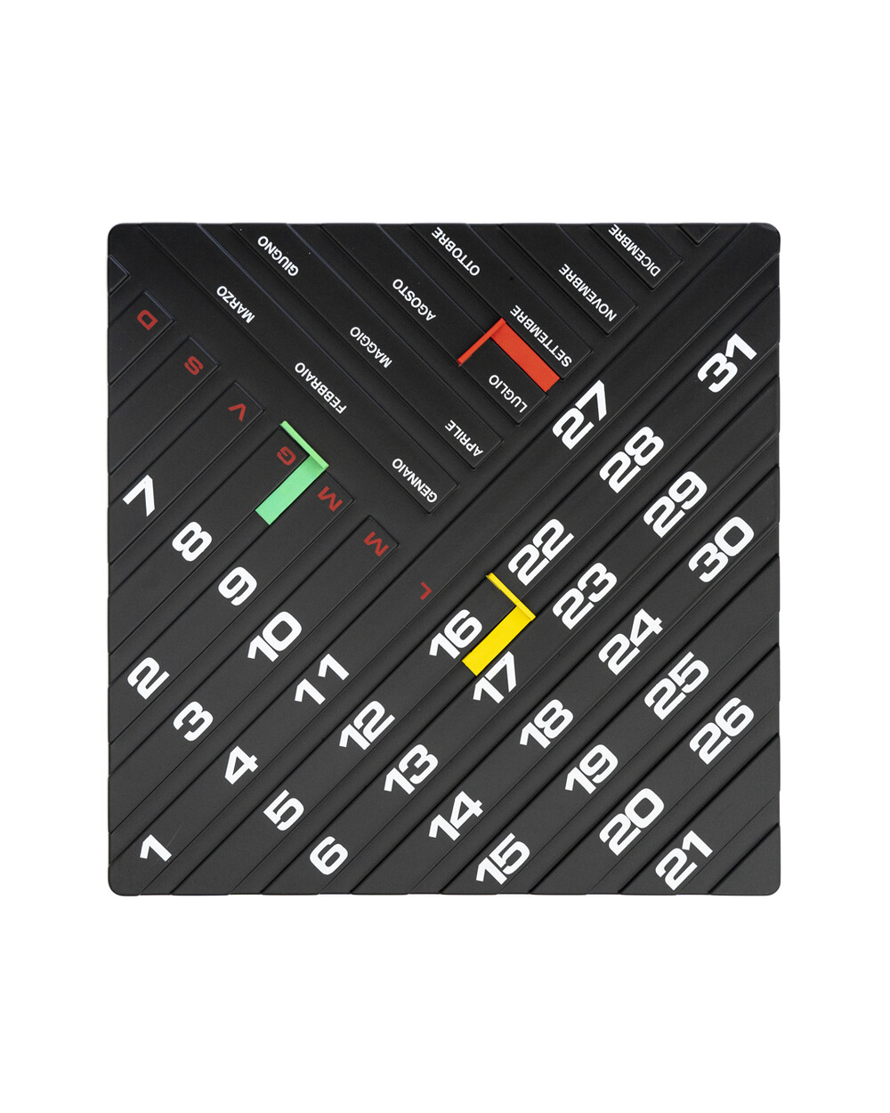 Yellow, Green, Red 클립을 이동하여 날짜를 조정하실 수 있습니다. 뒷면의 홈을 이용해 벽에 거는 것도 가능합니다.