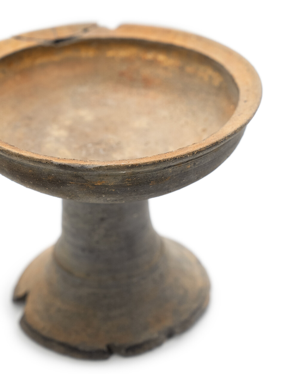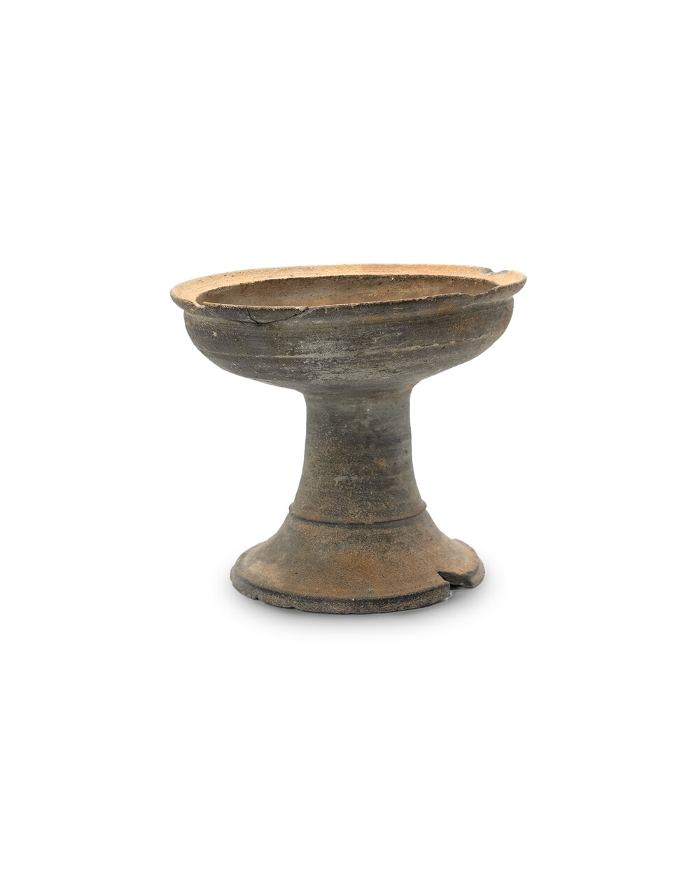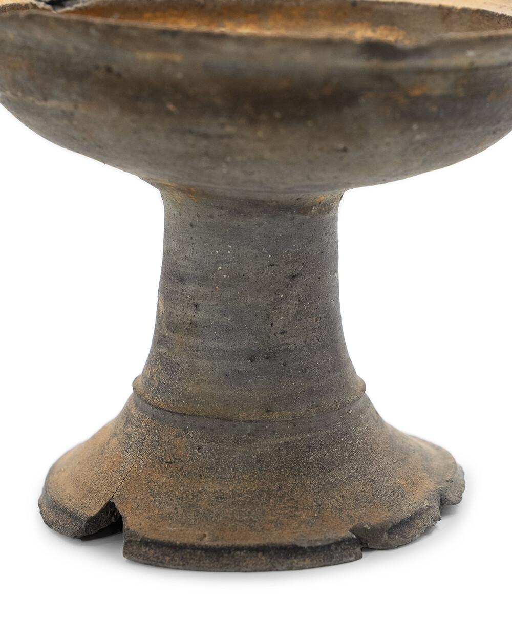 6세기 전반 신라 지역 무덤에서 주로 확인되는 흑갈색 고배(높은굽접시) 입니다. 넓은 접시판과 높은 굽이 결합돼 제사 음식이나 곡물을 올리기에 적합했으며, 굽과 접시 연결부에 두른 가는 환선이 당시 토기의 장식성을 보여 줍니다. 유약을 전혀 쓰지 않고 환원 소성해 얻은 짙은 회흑색 표면은 시간이 흐르며 갈색 산화 얼룩을 품어 고대의 질박한 미감을 전합니다. 림과 굽에 소규모 치핑·균열이 있으나 구조는 안정적이며, 표면 토양 침착은 1,400 여 년의 시간성을 증언합니다.