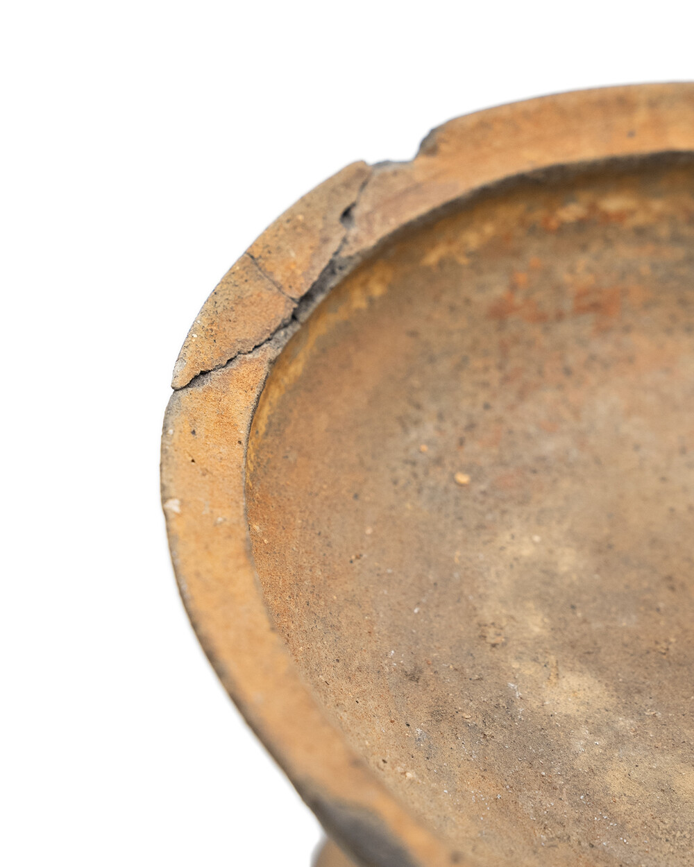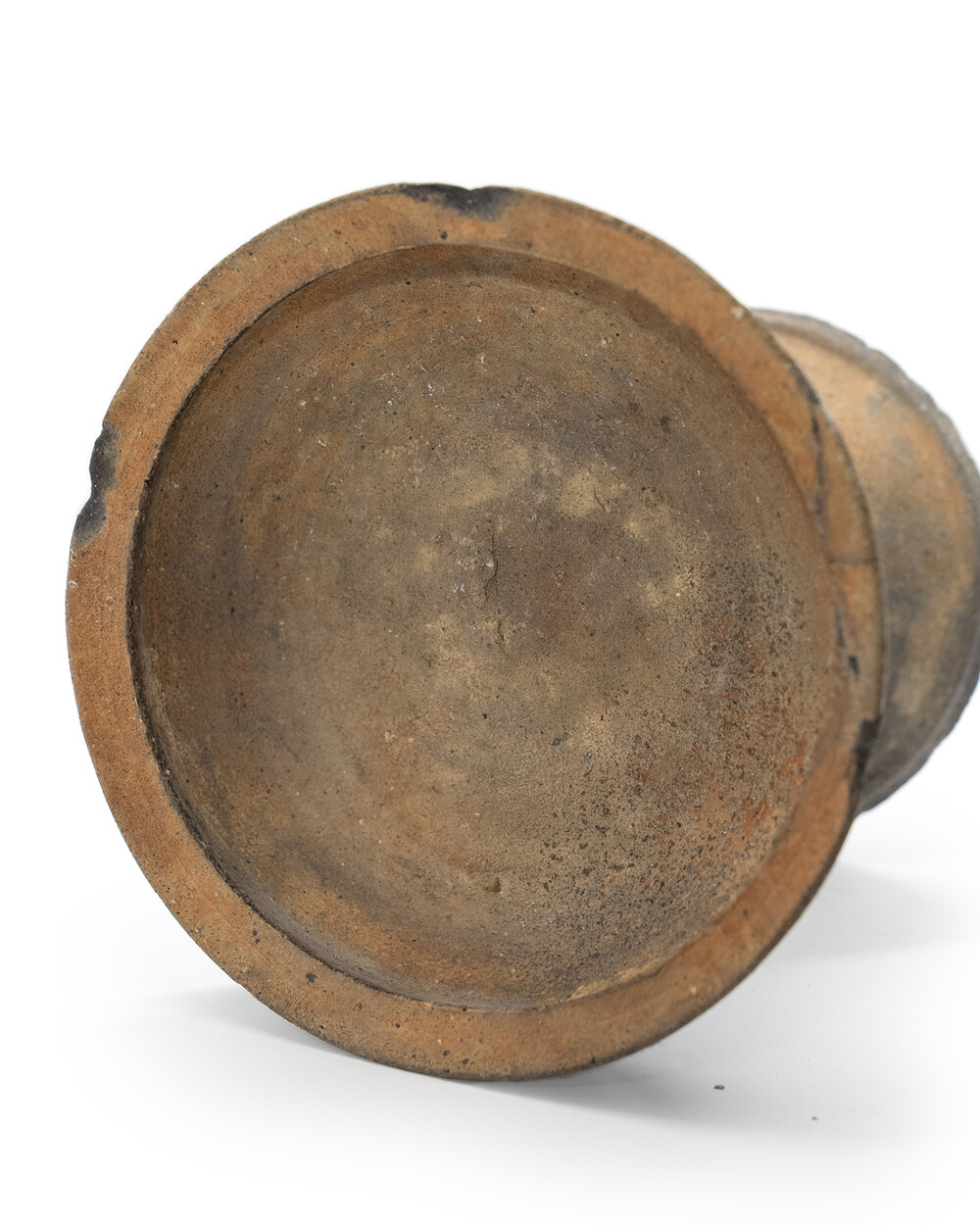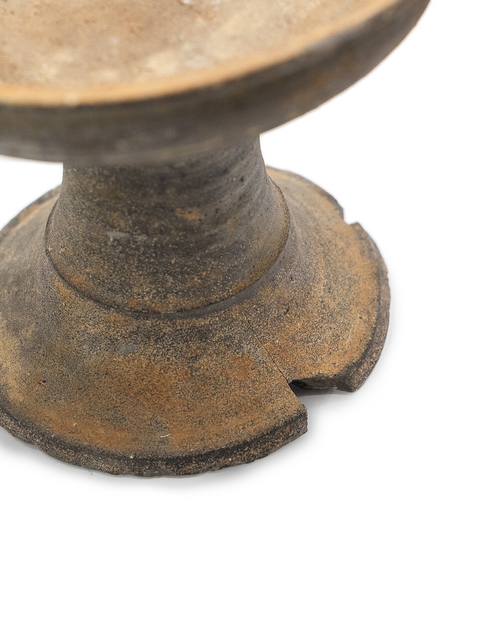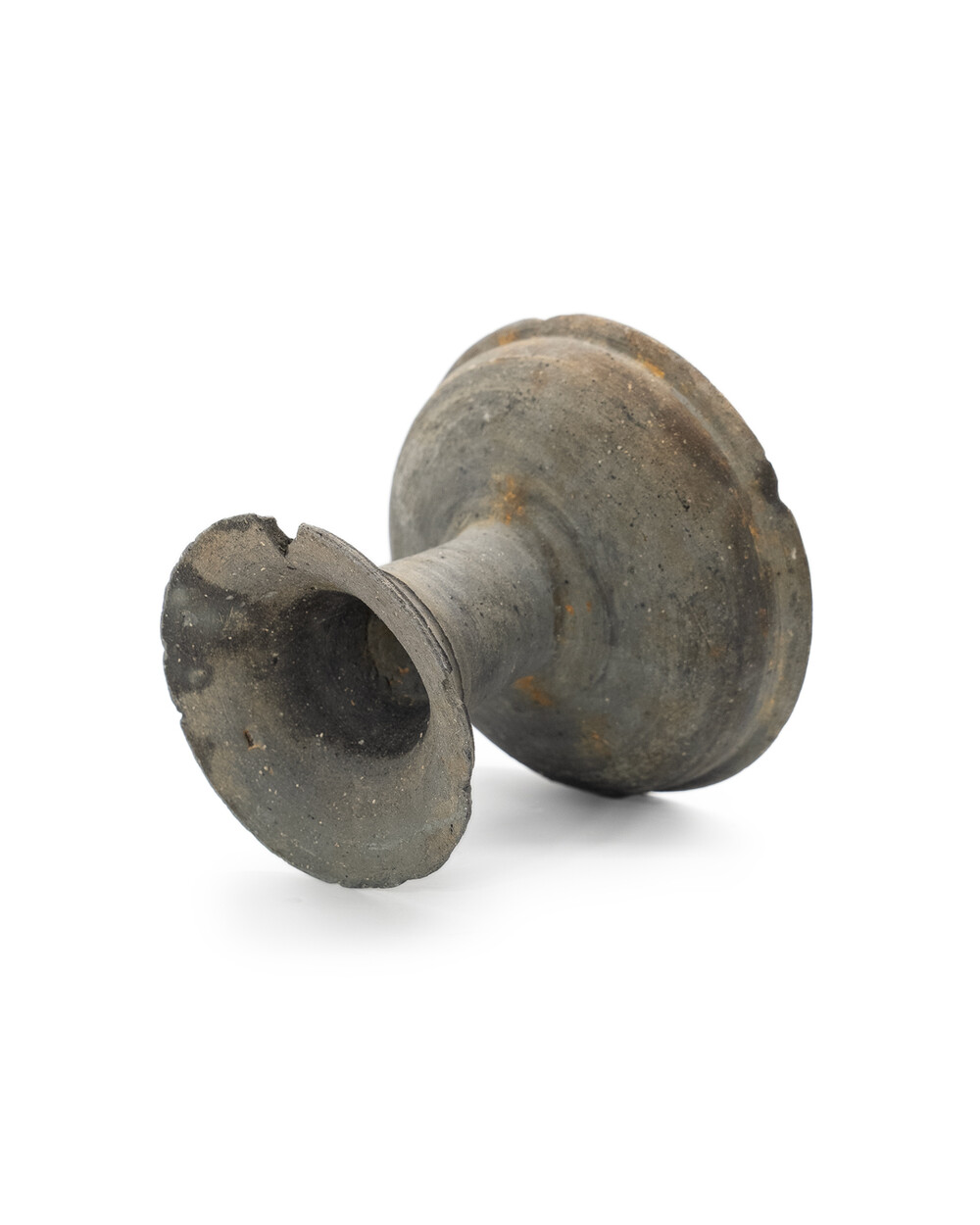 6세기 전반 신라 지역 무덤에서 주로 확인되는 흑갈색 고배(높은굽접시) 입니다. 넓은 접시판과 높은 굽이 결합돼 제사 음식이나 곡물을 올리기에 적합했으며, 굽과 접시 연결부에 두른 가는 환선이 당시 토기의 장식성을 보여 줍니다. 유약을 전혀 쓰지 않고 환원 소성해 얻은 짙은 회흑색 표면은 시간이 흐르며 갈색 산화 얼룩을 품어 고대의 질박한 미감을 전합니다. 림과 굽에 소규모 치핑·균열이 있으나 구조는 안정적이며, 표면 토양 침착은 1,400 여 년의 시간성을 증언합니다.