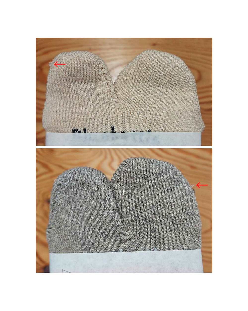 본 상품은 독창성이 높은 타비 형태 디자인과 도톰한 강파일 니팅을 통해 쿠션감과 착용감을 높인 제품입니다. 이로 인해 아래 이미지처럼 실이 나온 것처럼 보이는 경우가 있을 수 있으나 실제로 올이 풀릴 걱정은 없는 정상 제품입니다. 이는 편직 머신 및 제품 설계 특성상 불가피한 부분이므로 이 점 양해하신 후 구매를 검토해 주시기 바랍니다.