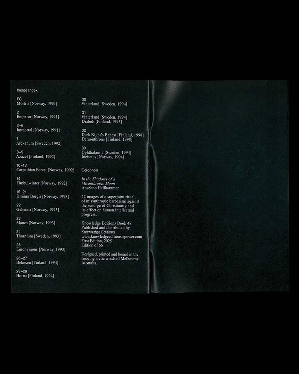 안셀모 헬해머의 아카이브에서 선별한 42컷의 비공개 이미지로, 기독교 헤게모니에 대한 라디컬/반종교적 세계관을 북유럽 블랙 메탈 신(Scene)의 상징들과 함께 시각화한 소형 진입니다. Mortiis, Emperor, Immortal, Arckanum, Azazel, Carpathian Forest, Fimbulwinter, Dimmu Borgir, Gehenna, Manes, Thornium, Euronymous, Behexen, Horna, Vinterland, Diaboli, Dark Night’s Behest, Demonthrone, Ophthalamia, Incitatus 등 1990–1998년 아카이브 이미지를 밴드/연도/국가와 함께 정리했습니다.