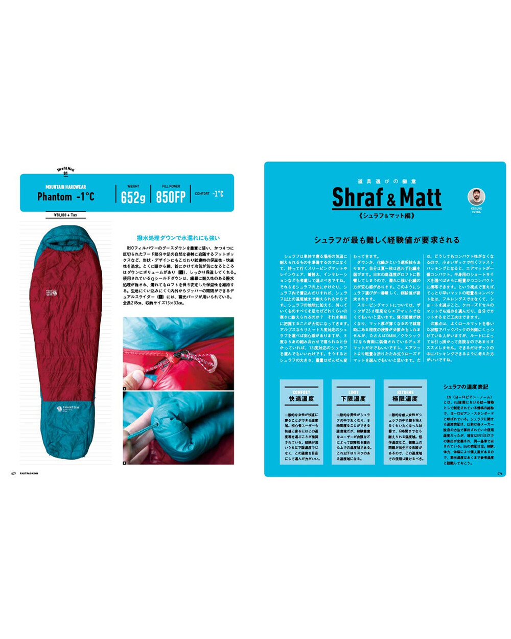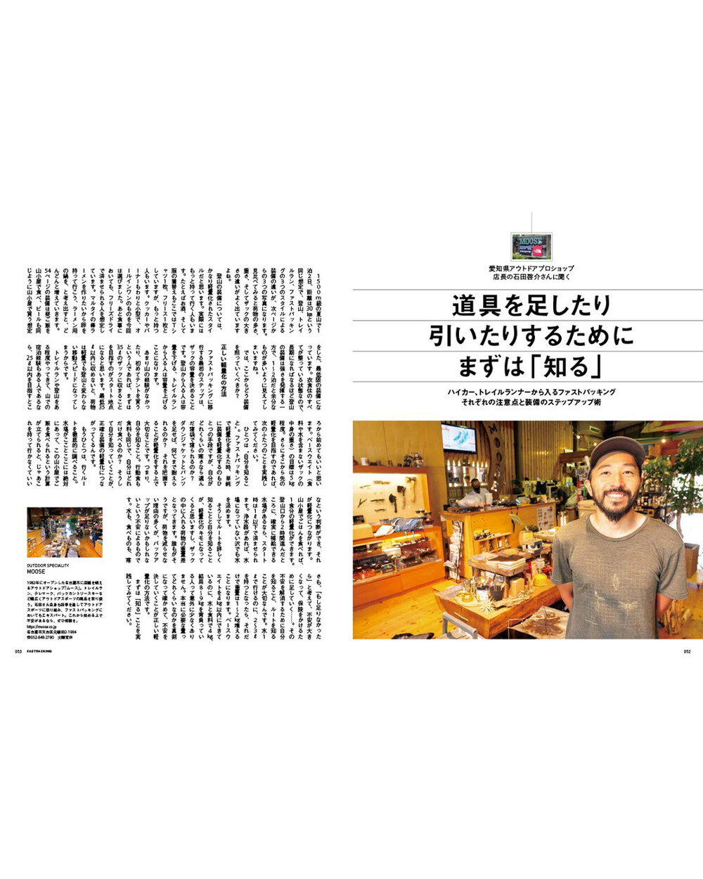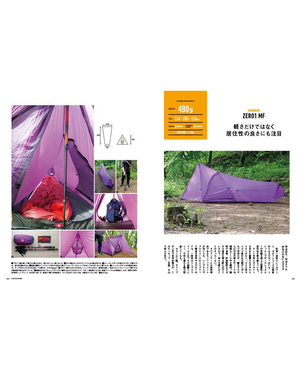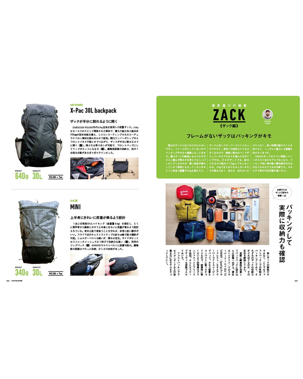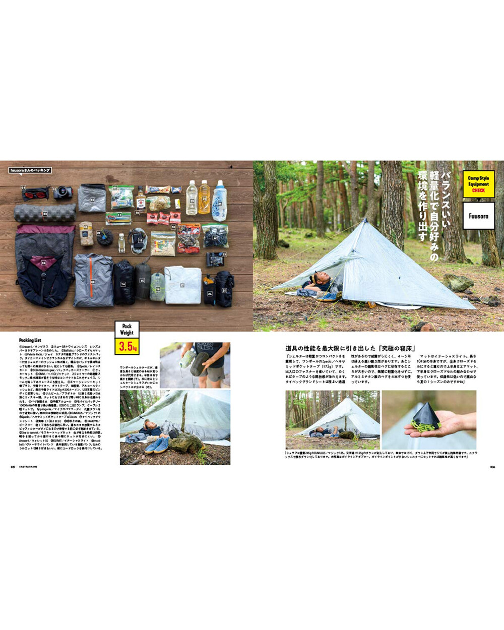 주요 콘텐츠로는 Fuusora, 핫토리 켄지, 고바야시 다이스케 등 전문가 3인의 대담을 수록하여 패스트 패킹의 입문 방법과 각자의 장비 세팅 스타일을 비교 분석합니다. 또한 텐트, 침낭, 매트, 쿠커, 신발, 배낭 등 카테고리별 장비 카탈로그를 제공하며, 산에서의 비상 상황 대비책(Mountain Emergency) 및 셀프 장비 유지 보수 방법 등을 포함하고 있습니다.