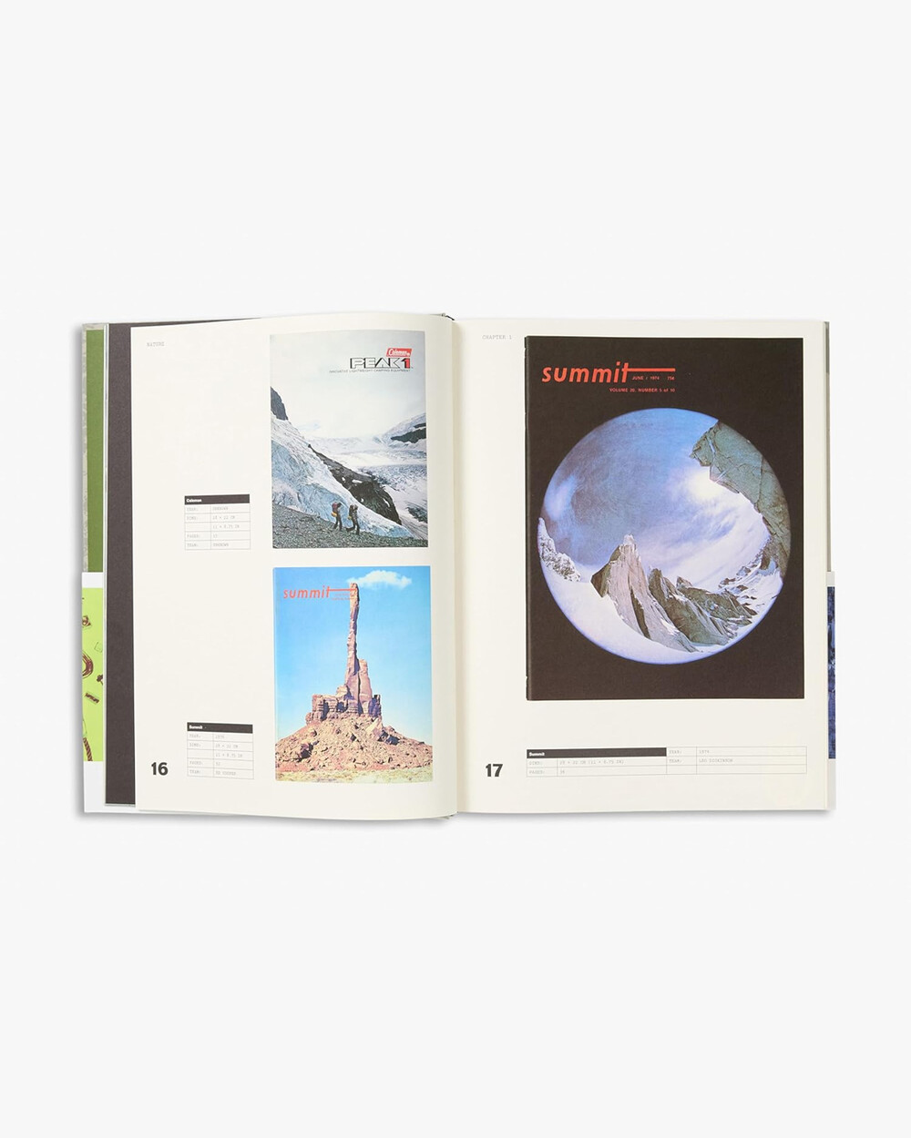 책에 실린 이미지는 거친 클라이밍 사진부터 캠핑 일러스트, 풍경, 제품, 타이포그래피까지 다양하며 ‘매체별(chapter by medium)’로 구성되어 있어 독자는 자신이 관심 있는 시각 언어만 골라 볼 수도 있습니다. 각 장에는 그 매체가 어떤 역할을 해왔는지에 대한 짧은 해설이 붙고, 사진가 Chris Burkard, 디자이너 Jeff Staple, 클라이머 Conrad Anker 등 업계 인물 20여 명이 개인적인 코멘트를 덧붙입니다.