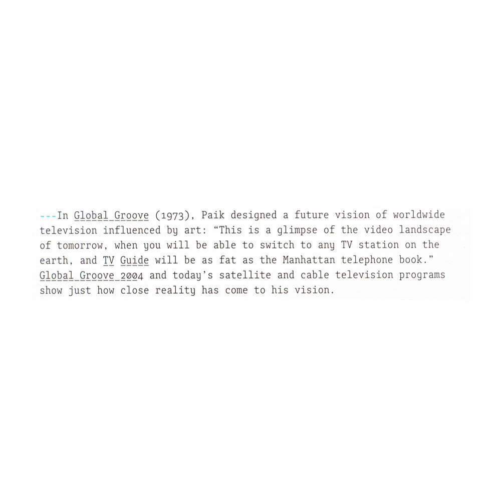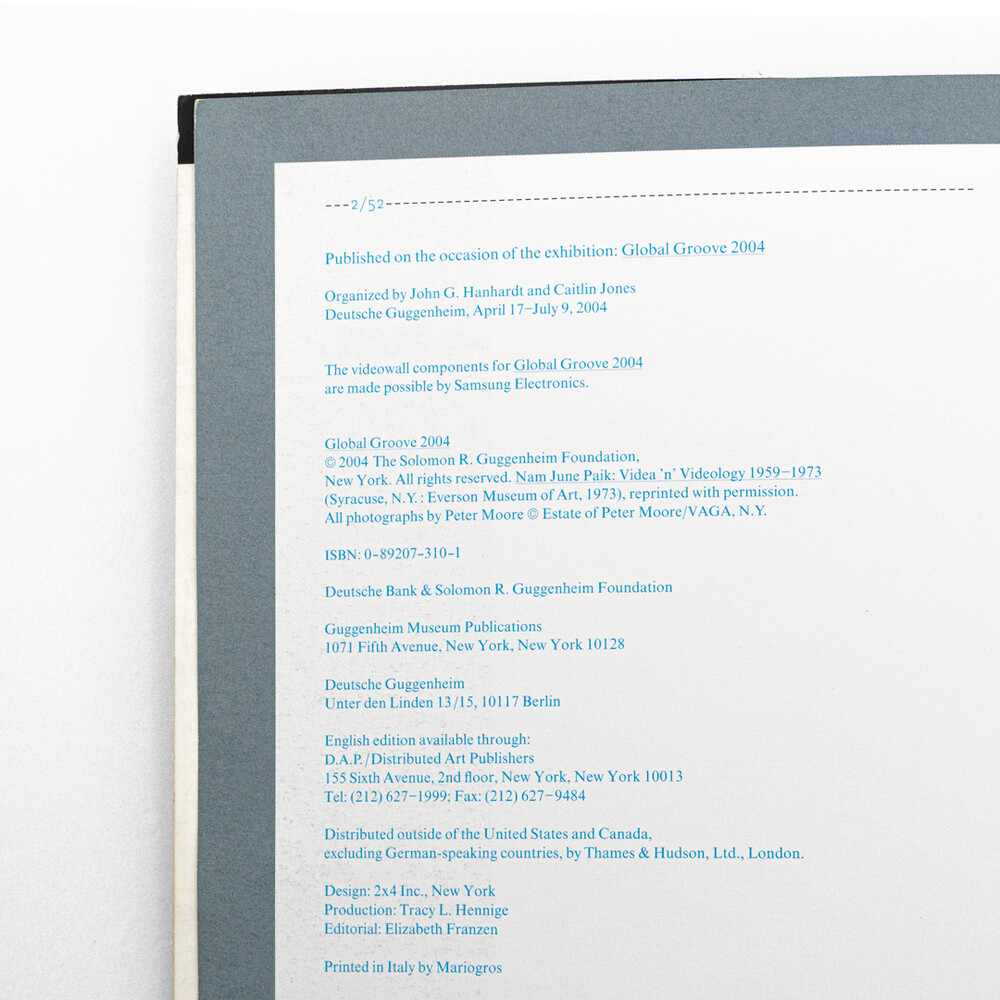 Globa Groove의 30주년을 기념하며 도이치 구겐하임 베를린에서 전시된 Global Groove 2004는 백남준의 주요한 텔레비전 프로젝트 작업들을 기록하고 기념합니다.이 책은 당시 전시도록의 일종으로 역사적으로 백남준의 작업들이 가진 중요성, 비디오와 텔레비전을 예술가의 매체로서 재해석하고 인터넷 아트로의 발전에 기여한 바를 조사하고 해석한 에세이들이 함께 실려있습니다.