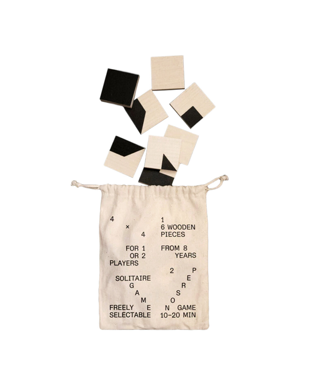 하나의 정사각형을 8등분하여 얻을 수 있는 16가지의 기하학적 패턴 타일로 구성되어 각 타일의 명암 패턴이 서로 이어지도록 배치해 4x4 크기의 사각형을 조립하는 퍼즐 게임입니다. 혼자서 또는 두 명이서 플레이할 수 있습니다.