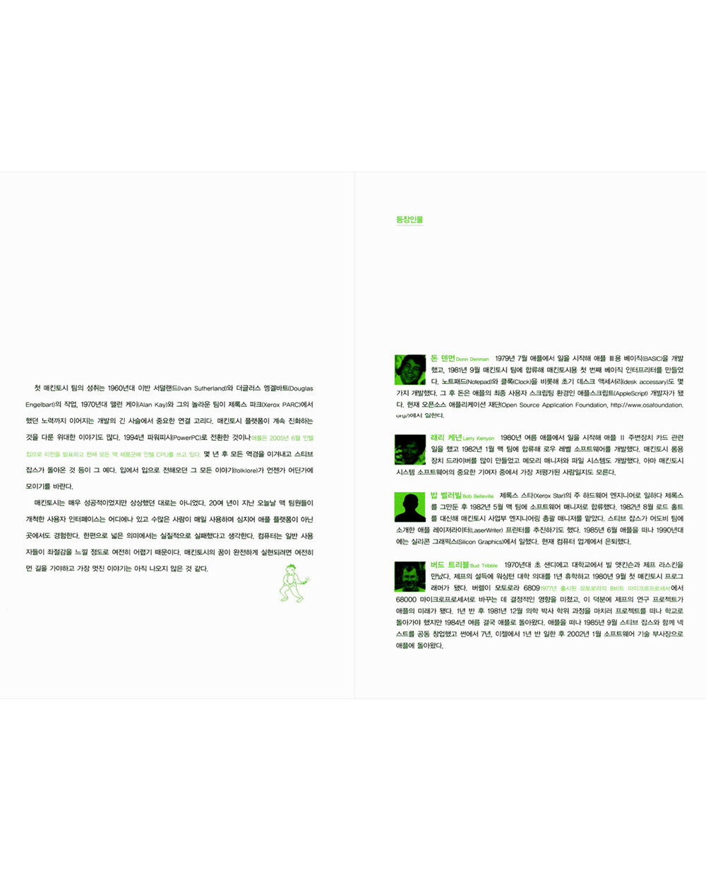 이 책은 1984년 출시된 맥 개발팀의 일원이었던 앤디 허츠펠트가 당시 맥 팀 동료들과 함께 folklore.org에 연재한 글을 2004년 맥 출시 20주년을 맞아 오라일리에서 책으로 엮은 것이다. 맥 개발자중 한 명인 스티브 워즈니악은, 맥을 개발하던 시기는 ‘혁신의 규칙이 돈이 아니라 내면의 보상에 의해 이끌어지던 매우 좋았던 시절’이라고 말한다. 맥 개발자들의 헌신적인 노력은 혁신의 현장에서 세상을 바꿀 꿈을 꾸고, 세상을 움직이는 힘은 말이 아니라 실천가의 행동이라는 중요한 사실을 깨닫게 한다. PC 개발자들의 순수한 열정과 낭만을 엿볼 수 있는 책이다.