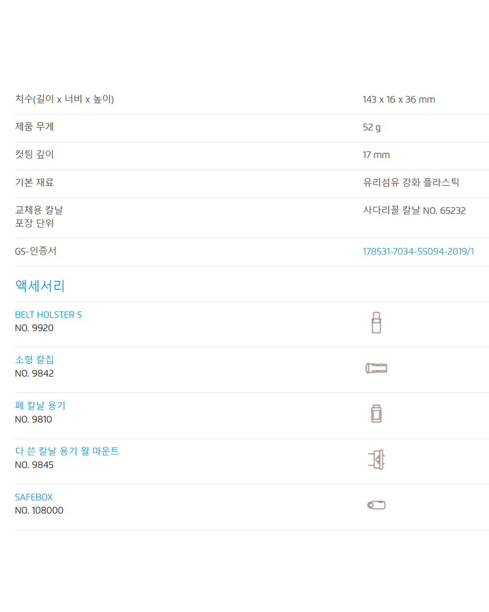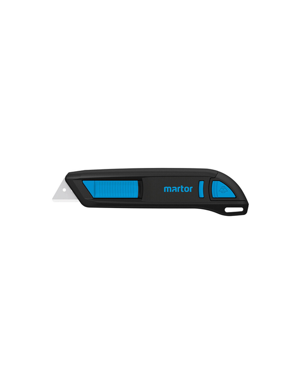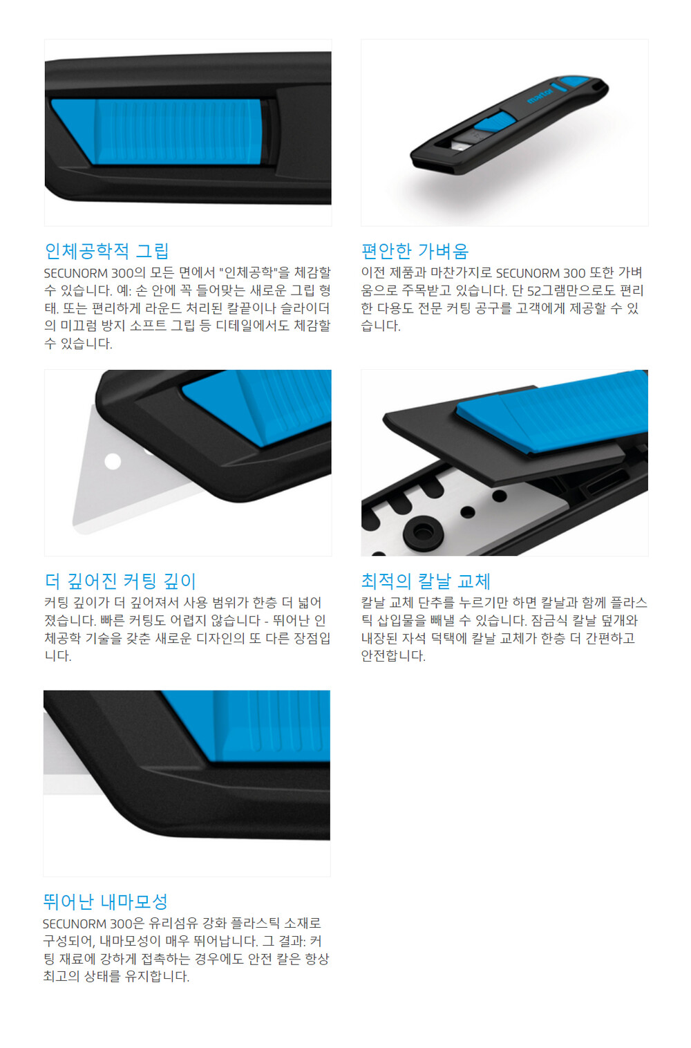Secunorm 안전칼은 입증된 자동 칼날 후퇴 기능, 인체공학적 디자인, 양면 슬라이더, 편리한 칼날 교체가 특징입니다.
