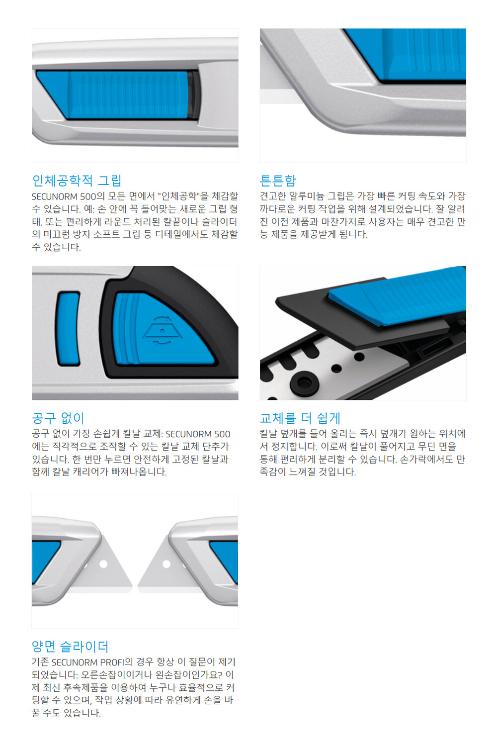 Secunorm 안전칼은 입증된 자동 칼날 후퇴 기능, 인체공학적 디자인, 양면 슬라이더, 편리한 칼날 교체가 특징입니다.