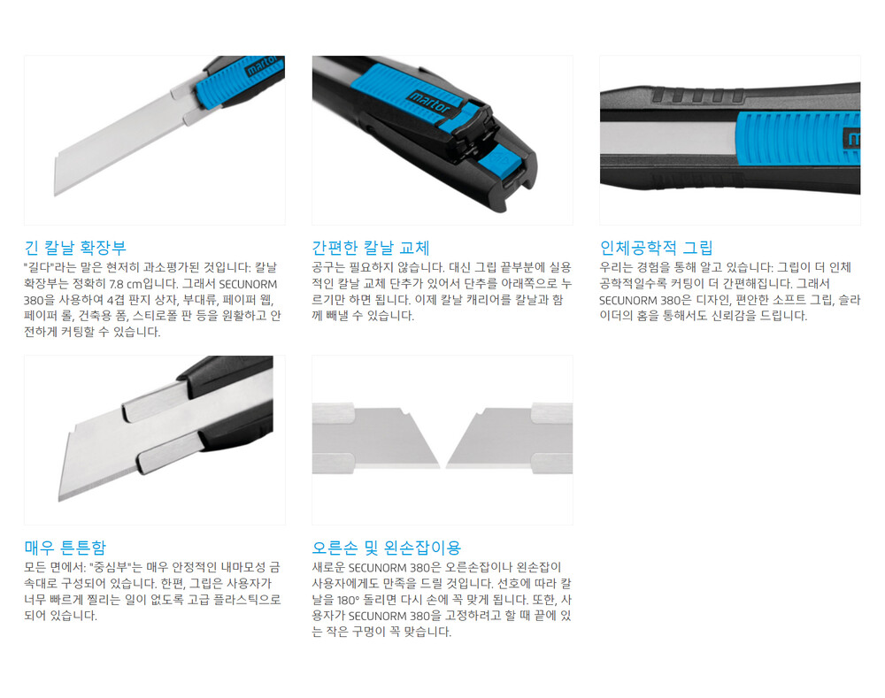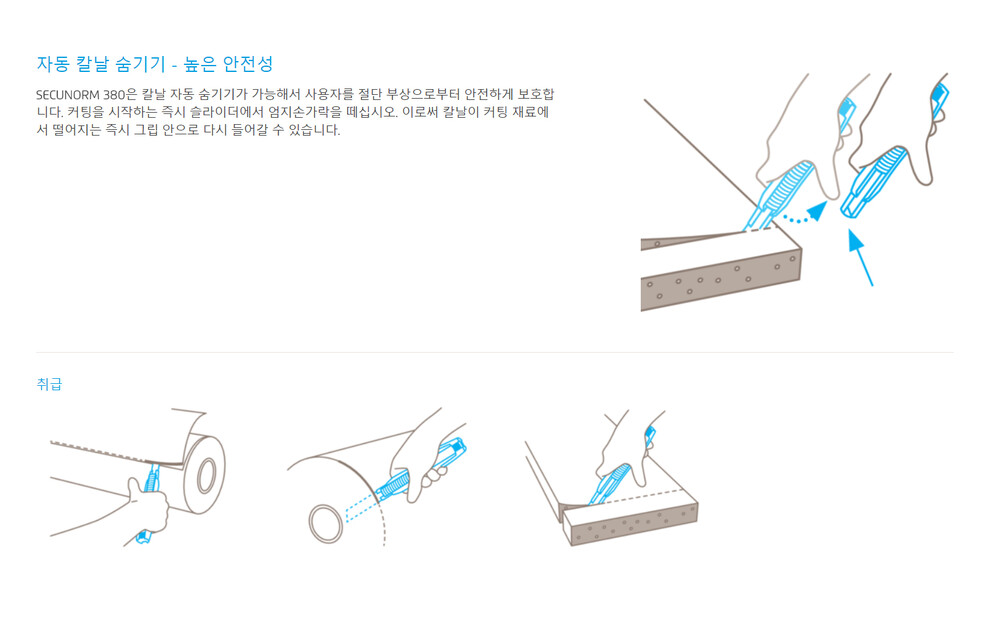 칼날이 긴 안전칼? Secunorm 380은 자동 칼날 복귀 기능 그리고 8cm의 칼날 배출 길이를 특징으로 하는 세계적으로 최초의 긴 안전칼 입니다. 만약 일반적인 커터칼보다 위험성이 적은 대체품을 찾고 있다면, 여기에 그 답이 있습니다. 추가적인 안전기능으로는 의도하지 않은 칼날의 작동을 비활성화하기 위한 잠금장치가 포함되었습니다.