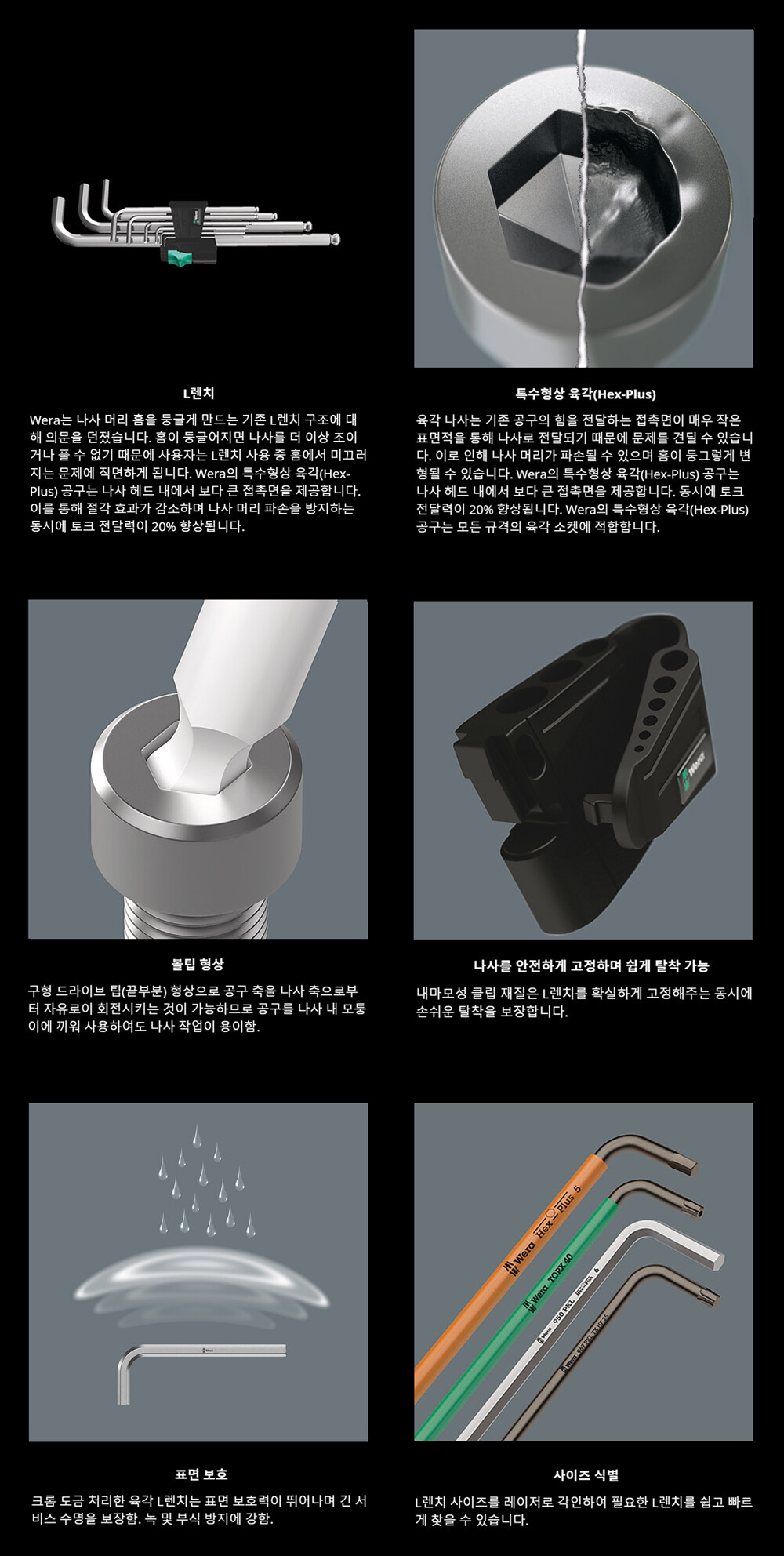 베라의 고품질 육각 L렌치 세트는 강화된 부식 방지와 실용적인 클립 잠금장치와 함께 제공되어 안전한 보관과 쉬운 제거가 가능합니다.베라의 고유한 특수형상 육각(Hex-Plus) L렌치는 나사 머리 내 접촉 면적이 증가되어 노칭 효과를 최소화 하고 나사홈 파손 위험을 거의 완전히 제거합니다. 또한 협소한 설치 환경에서도 편한 작업 가능이 가능하며 정밀한 크롬 도금으로 높은 부식 방지력을 보장합니다.
