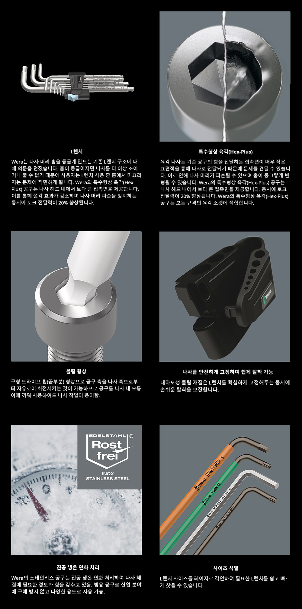 베라의 고품질 육각 L렌치 세트는 강화된 부식 방지와 실용적인 클립 잠금장치와 함께 제공되어 안전한 보관과 쉬운 제거가 가능합니다. 베라의 고유한 특수형상 육각(Hex-Plus) L렌치는 나사 머리 내 접촉 면적이 증가되어 노칭 효과를 최소화 하고 나사홈 파손 위험을 거의 완전히 제거합니다. 또한 협소한 설치 환경에서도 편한 작업 가능이 가능하며 정밀한 스테인리스 도금으로 높은 부식 방지력을 보장합니다.