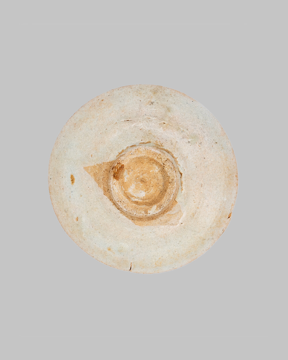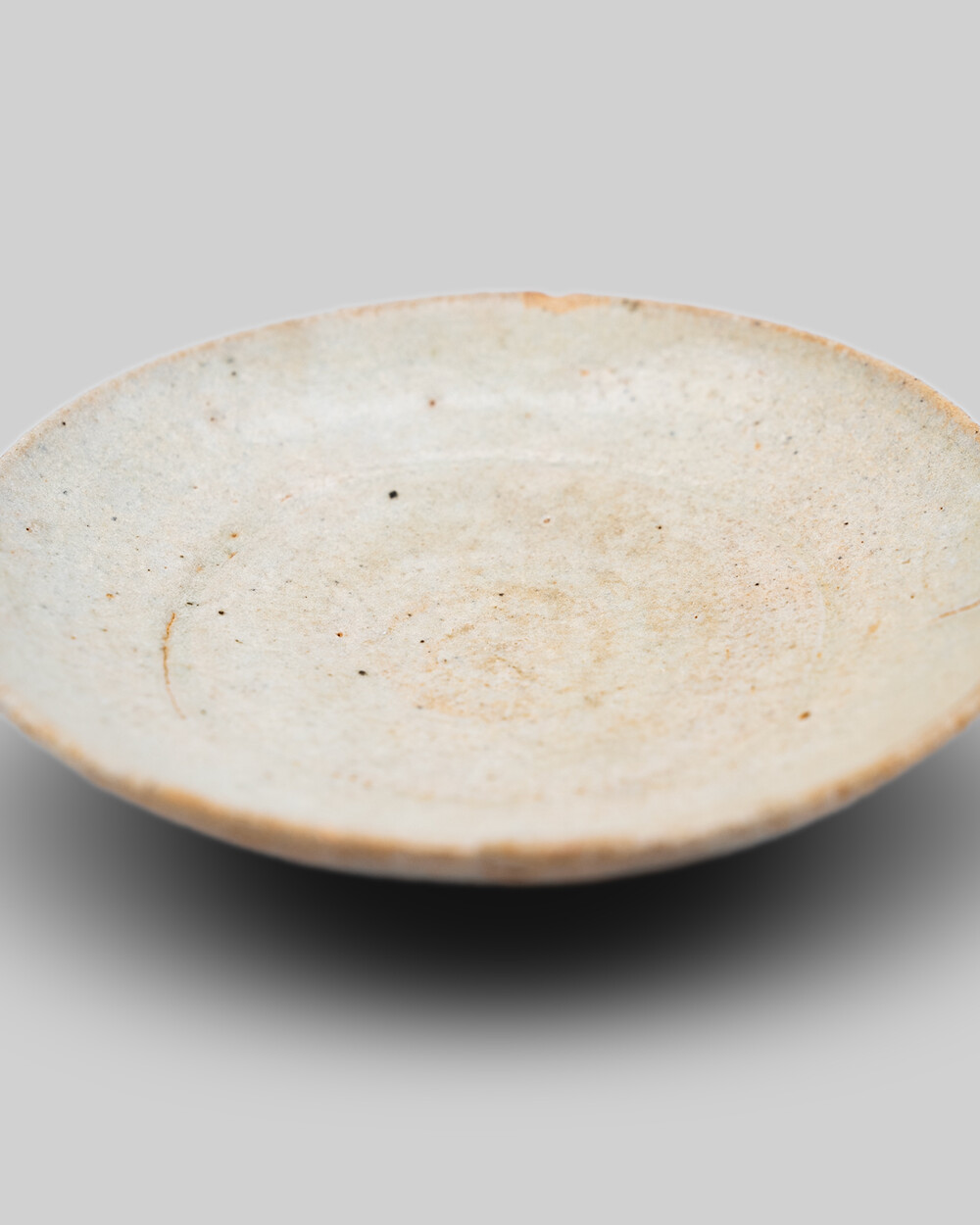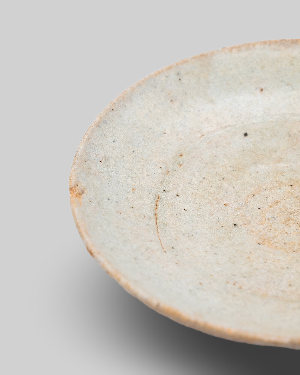 조선 전기(15세기 후반~16세기 초) 제작된 분청계 초기 백자 접시입니다. 얇게 발린 담청색 유약과 자연스러운 유약 흐름, 그리고 굽 주변에 남은 가마 받침 흔적이 노천 야외 가마 소성의 특징을 고스란히 보여줍니다. 림은 얇고 넓게 퍼지며 중앙부는 완만하게 오목한 형태를 이루어 고요한 조형미와 안정된 비례를 드러냅니다. 복원이나 보수 없이 자연 상태를 유지하고 있으며 담백한 아름다움 속에 조선 초기 도자기의 절제된 미감을 온전히 담아낸 접시입니다.